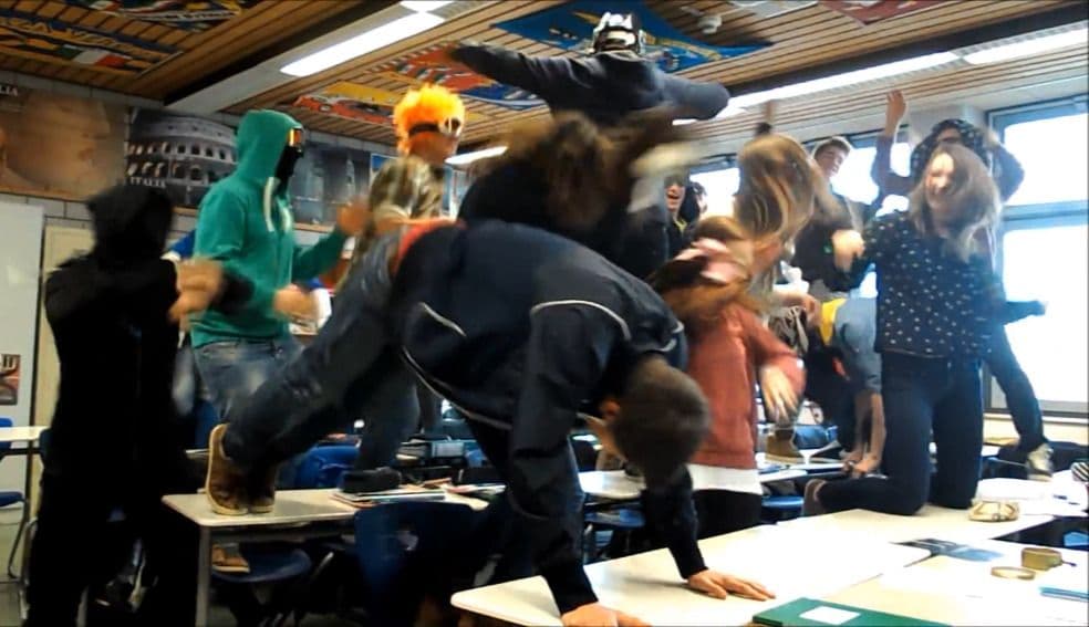 Der Harlem Shake und ähnliche Tanzeinlagen, wie der damals beliebte Gangnam Style, wurden von Berliner Hauptschülern zu zahlreichen Gelegenheiten aufgeführt. Das akustische, semantische und gestische Potenzial der popkulturellen Vorlagen wurde zur eigenmächtigen Unterhaltung und zu trotzigen Boykottierungen des Schulbetriebs eingesetzt. Zwei Versionen des Harlem Shake wurden von den Schülern der zehnten Klasse aufgenommen und zwischenzeitlich auf Videoplattformen hochgeladen. Die erste Version spielt in der Jungen-Umkleidekabine der Schulturnhalle: Die Schüler sitzen zunächst demonstrativ unbeteiligt herum, doch die anschwellende Musik und die Hüftstossbewegungen eines auf eine Bank gekletterten Jungen mit einer Gesichtsmaske deuten bereits das Inferno der kommenden 15 Sekunden an, bei dem die Schüler wild herumtanzen und sich dabei teilweise ihre T-Shirts vom Körper reissen. Ähnlich ist auch die zweite Version aufgebaut, die auf der Schultoilette aufgenommen wurde. Die Jungen stehen dort zunächst in einer Reihe an den Pissoiren, nur einer von ihnen macht bereits Stossbewegungen mit der Hüfte und greift sich dabei lasziv an den Hintern. Nach 15 Sekunden startet auch hier plötzlich eine obszön wirkende Party mit verschiedenen Rollen: einer führt eine Art Masturbationstanz auf, andere steigen auf die Pinkelbecken oder bespringen sich gegenseitig. Die Schüler hatten eine speziell für die Produktion von Adaptionen des Harlem-Shake ausgerichtete Handy-App verwendet, sie folgten durch dieses technische Mittel den populärkulturellen Konventionen der Harlem-Shake*-*Memes. In ihrer ausgestellten Freakhaftigkeit wirkten die Tanzbewegungen dennoch präzise vorbereitet und die Teilnehmer sorgsam choreografiert.