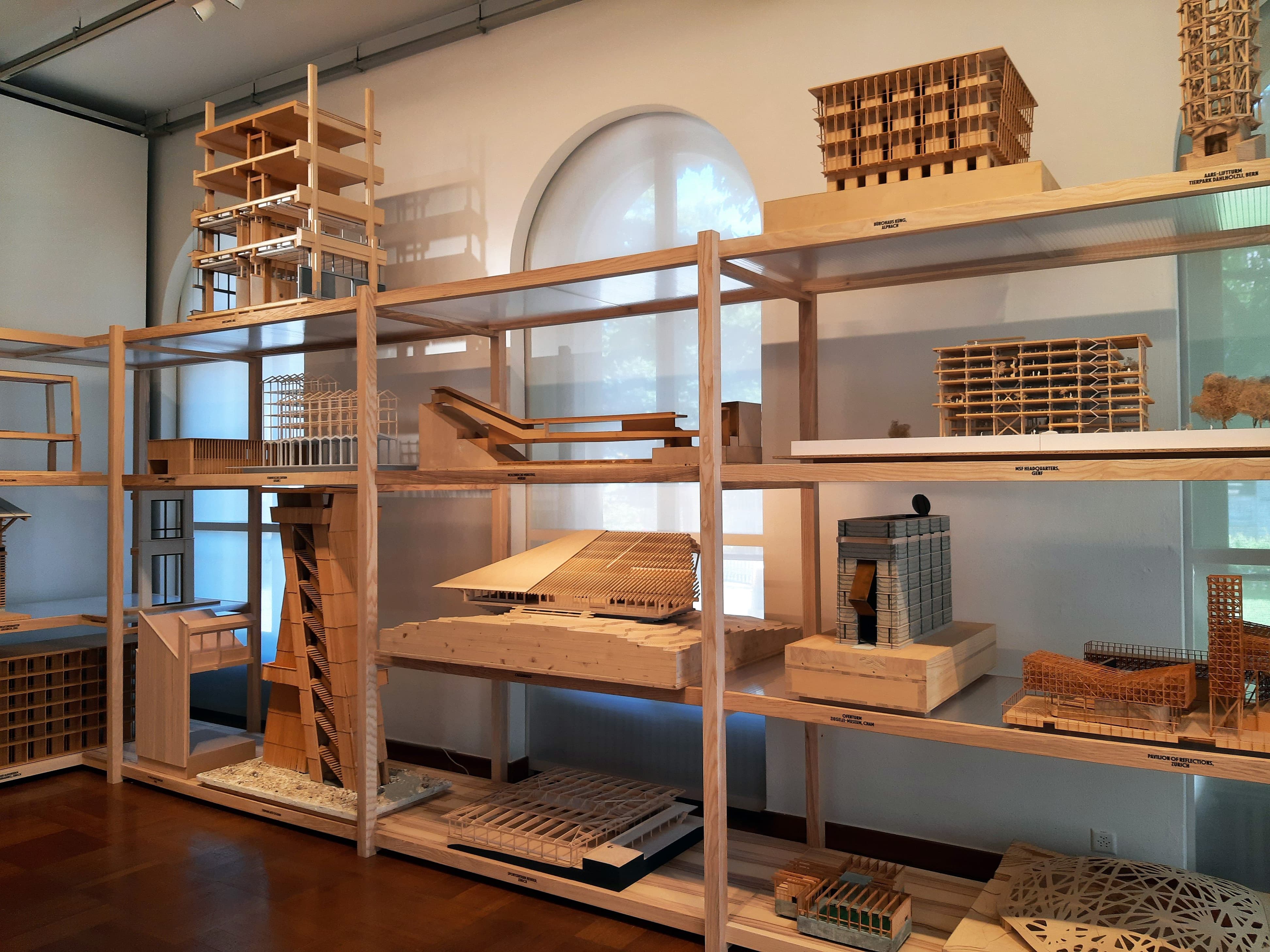 Wie in einem Lager sind hier die Modelle zahlreicher Projekte in Hochregalen versammelt, von bekannten Bauten etwa von Gion Caminada oder Herzog & de Meuron bis zu weniger bekannten, nicht nur aus der Schweiz. Sie geben eindrucksvoll etwas von dem Spannungsverhältnis zwischen den elementaren Grundformen und dem technologischen Aufwand gegenwärtiger, oft mehrgeschossiger Holzkonstruktionen preis. Ein Aspekt, der in einem weiteren Raum etwa mit Blick auf Holzverbindungen und die Kombination mit anderen Materialien wie Lehm, Beton oder Stahl vertieft wird. Die Denkfigur von Innovation aus Tradition braucht dafür überhaupt kein pathetisches Gewand.