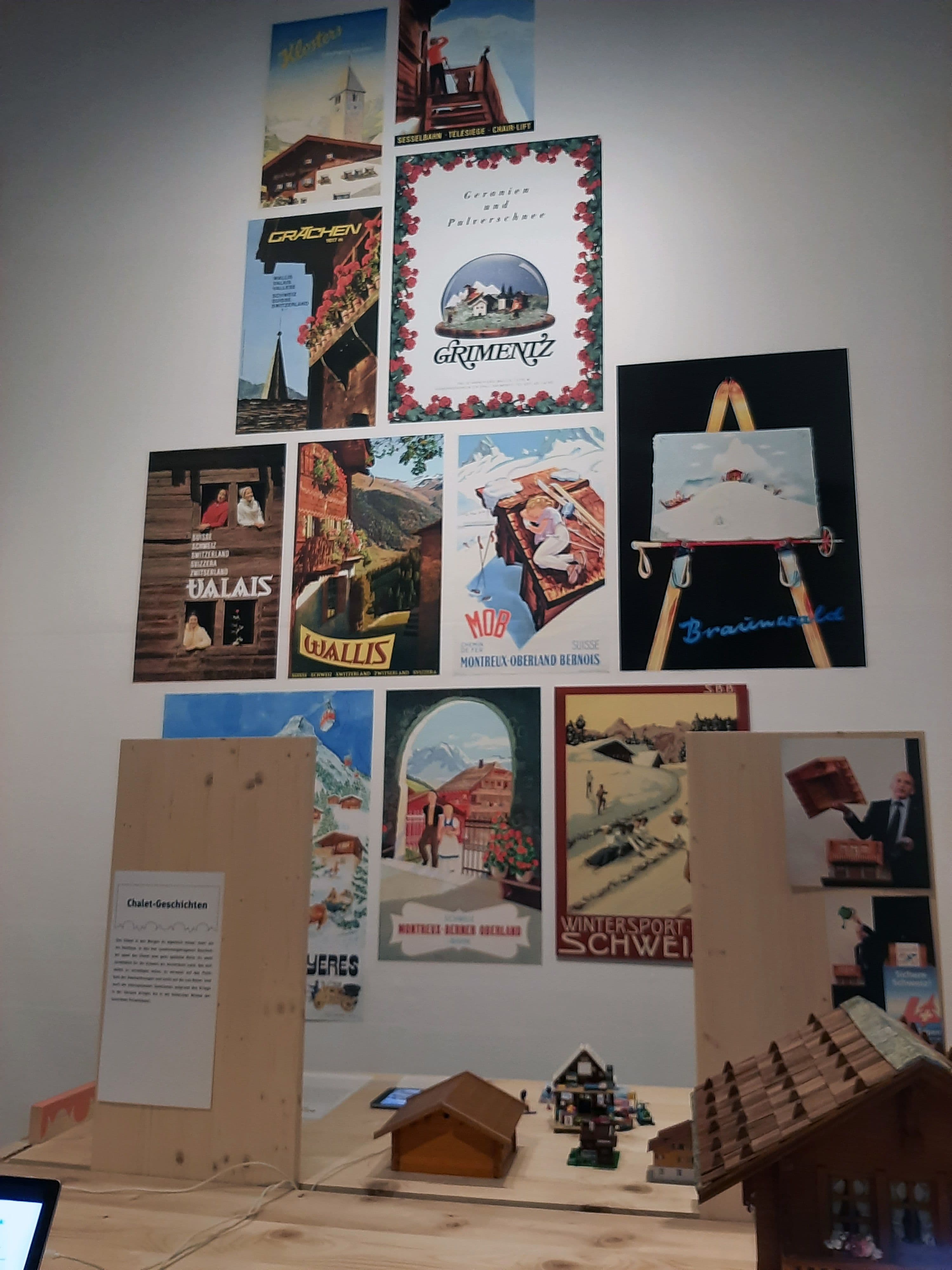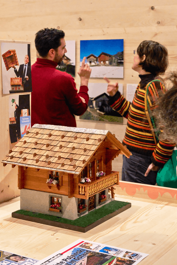 Entsprechend popkulturell angelegt ist auch der Einstieg. Die Ausstellung beginnt mit allerlei Souvenirs in Chaletgestalt und breitet dann gleich ein noch eher irritierendes als erklärendes Inventar aus. Es reicht von Whams in Saas-Fee gedrehtem Last Christmas und dem Filmklassiker Beresina über die schicksalhaften Gstaader Herbergen Roman Polanskis und Axel Springers bis zu dem nur noch schräg anmutenden Hausmodell, mit dem Bundesrat Ueli Maurer 2014 im Abstimmungskampf um die Beschaffung des Kampfjets «Gripen» durch das Land zog: seine Schweiz als Chalet ohne Dach in Gefahr. Auch Hinweise auf die Rolle des Chalets als Immobilie und Image in den aktuellen Sanktionen gegen die russische Oligarchie und als Nobelquarantäne während der Covid-Pandemie fehlen nicht. Ein bunter Einstieg, der aber keine Zweifel lässt: ganz harmlos ist das alles nicht, was da hinter den Fassaden und auch in den ideologischen Fundamenten steckt.