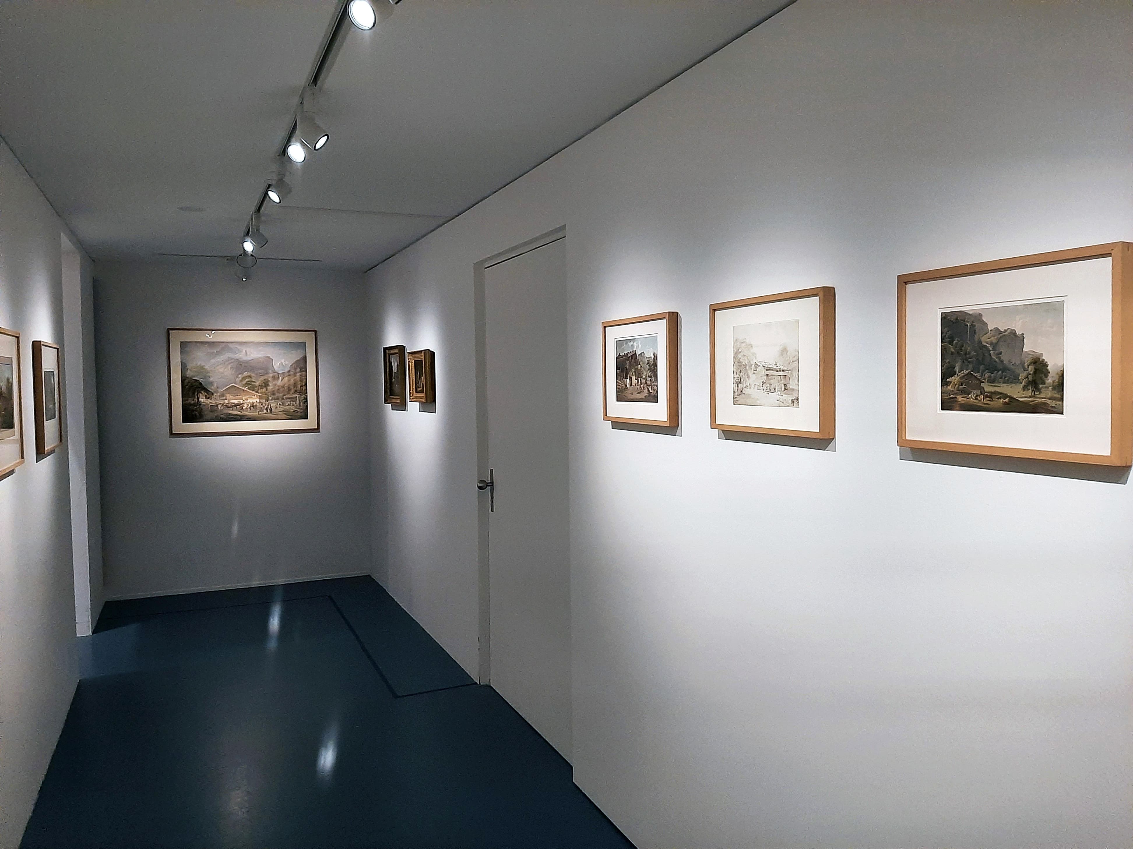 Die eigenen Bestände der Nationalbibliothek werden vor allem an zwei Stellen eingespielt. Zum einen sind Reproduktionen von Chaletmotiven in der Tourismuswerbung der ersten Hälfte des 20. Jahrhunderts aus der Plakatsammlung zu sehen. Zum anderen werden in einem Kabinett Gemälde von Schweizer «Kleinmeistern» präsentiert. Letztere bilden eine gelungene Klammer zu den Souvenirs am Beginn der Ausstellung, erfüllten doch die Gemälde mit Ansichten aus dem Berner Oberland und anderen früh bereisten Gebieten der Schweizer Alpen eben diese Funktion, nämlich Andenken an Reisen zu den seinerzeit in Kunst und Literatur vielbesungenen Orten eines alpinen Arkadiens zu sein.