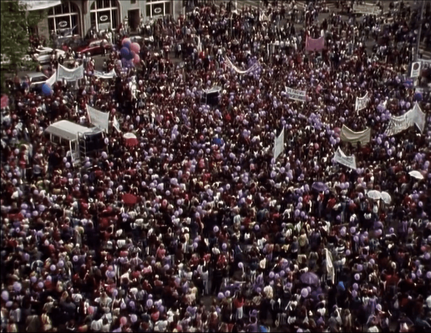 Doch was unterscheidet eine audiovisuelle Historiografie von den schriftlichen oder mündlichen Pendants? Audiovisuelle Medien produzieren einen affektiven Zugang zur Geschichte: Sie lösen Gefühle und Emotionen aus, ermöglichen eine Identifikation mit den Akteur:innen der Vergangenheit.[viii] Tula Roys Film formt so eine übergenerationale Verbindungslinie und schafft das Angebot, sich als Teil einer noch immer andauernden feministischen Geschichte zu verstehen. Es entsteht ein hoffnungsvoller Referenz- und Ausganspunkt, zu dem sich aktuelle Feminist:innen in Beziehung setzen könnten. Indem der Film ein «historisches Erbe» vermittelt, wirkt er als eine «Lektion an die symbolischen Töchter»[ix], wie die Filmwissenschaftlerin Cecilia Hausheer treffend argumentiert. Diese Perspektive erlaubt es, feministische Dokumentarfilme wie Eine andere Geschichte nicht nur als widerständige Formen der Geschichtsschreibung und -erzeugung zu untersuchen, sondern eine feministische Wirkungsmächtigkeit über den jeweiligen Entstehungskontext hinaus festzumachen.