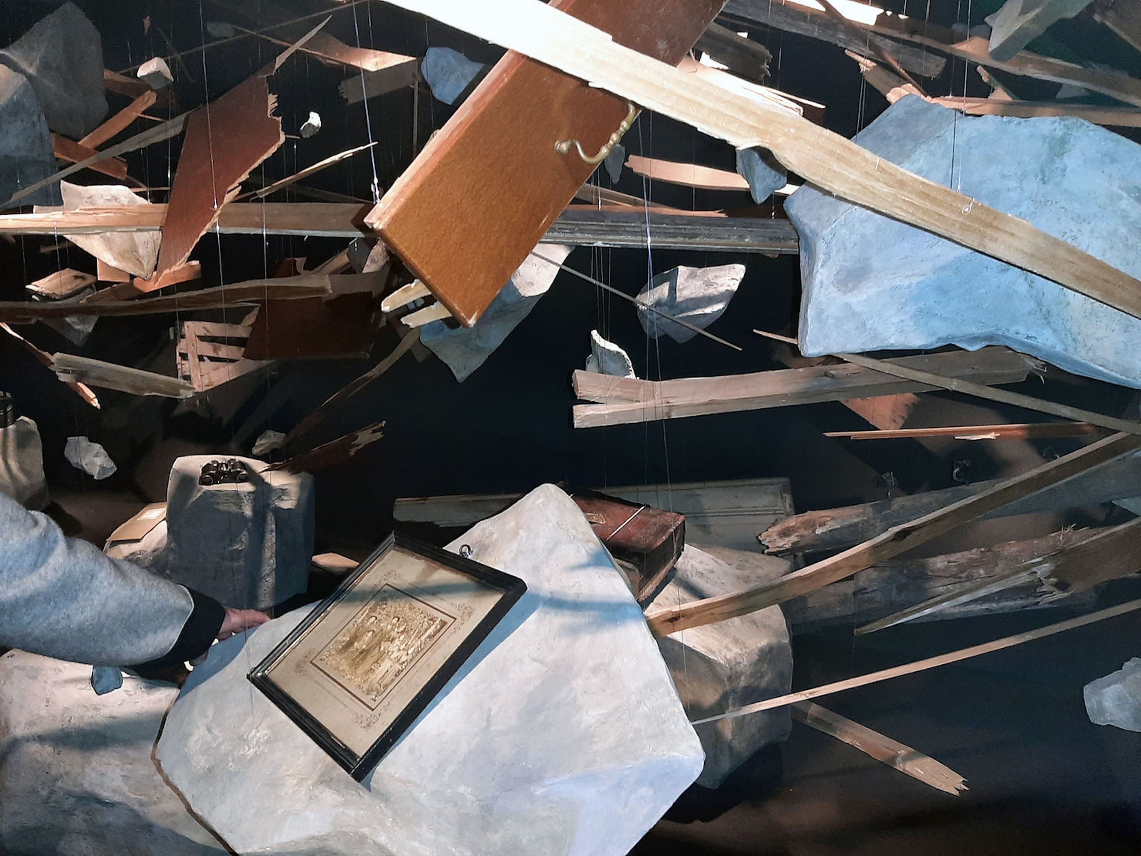 Die Idylle währt nicht lange, das ahnt man und findet sich jäh in einer Szene wieder, die man auch in den grossen zeitgenössischen Kriegsmuseen antreffen könnte. Berstendes Holz und fliegende Gesteinsbrocken rahmen hier aber zugleich ein kleines musée sentimental im besten Wortsinne, ein Arrangement, in dem sich der Blick auf die letzten Erinnerungsstücke an diesen ominösen 19. Dezember 1947 richtet, an dem Mitholz aufhörte ein ganz normales Dorf zu sein. Einzelne Gegenstände, die nach den gewaltigen Detonationen aus den zerstörten Häusern gerettet wurden oder den Familien als Andenken an die neun bei dem Unglück getöteten Personen geblieben sind, vor allem aber die mit den Objekten verbundenen Erinnerungen lenken die Aufmerksamkeit auf Erfahrungen und machen unmissverständlich klar, dass hier Geschichte und Gegenwart aus der Perspektive der Bewohner:innen erzählt werden. Sie kommen in dieser Ausstellung fortwährend zu Wort. Korrespondierend damit helfen kluge Statements von Expert:innen wie etwa des Zürcher Historikers Jakob Tanner bei der Einordnung der Ereignisse in die Kontexte der schweizerischen Nachkriegszeit.