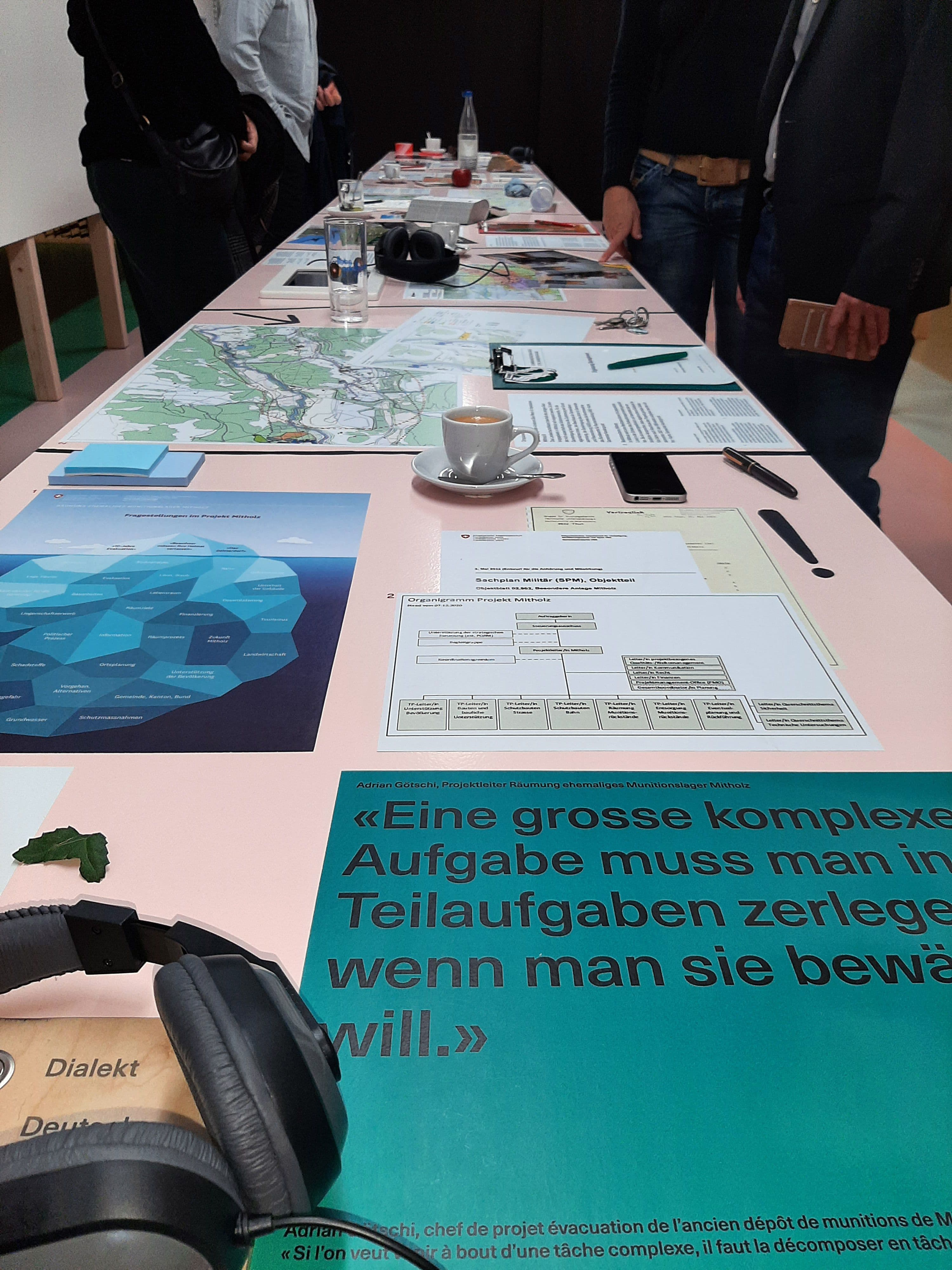 Dazu tragen neben der dauernden Präsenz der Betroffenen auch die starken Emotionen der von Karin Bucher verantworteten Szenografie bei: Das im «Hodlersaal» des Museums aus kreisrund positionierten Lautsprechern intonierte Abschiedslied an den Ort «Läb wohl Mitholz» geht unter die Haut, auch wenn man den Auftritt von Frauen und Männern aus Mitholz und dem Umfeld des Projekts nicht live an der Ausstellungseröffnung erleben hat können: «Mir müesse gah…».