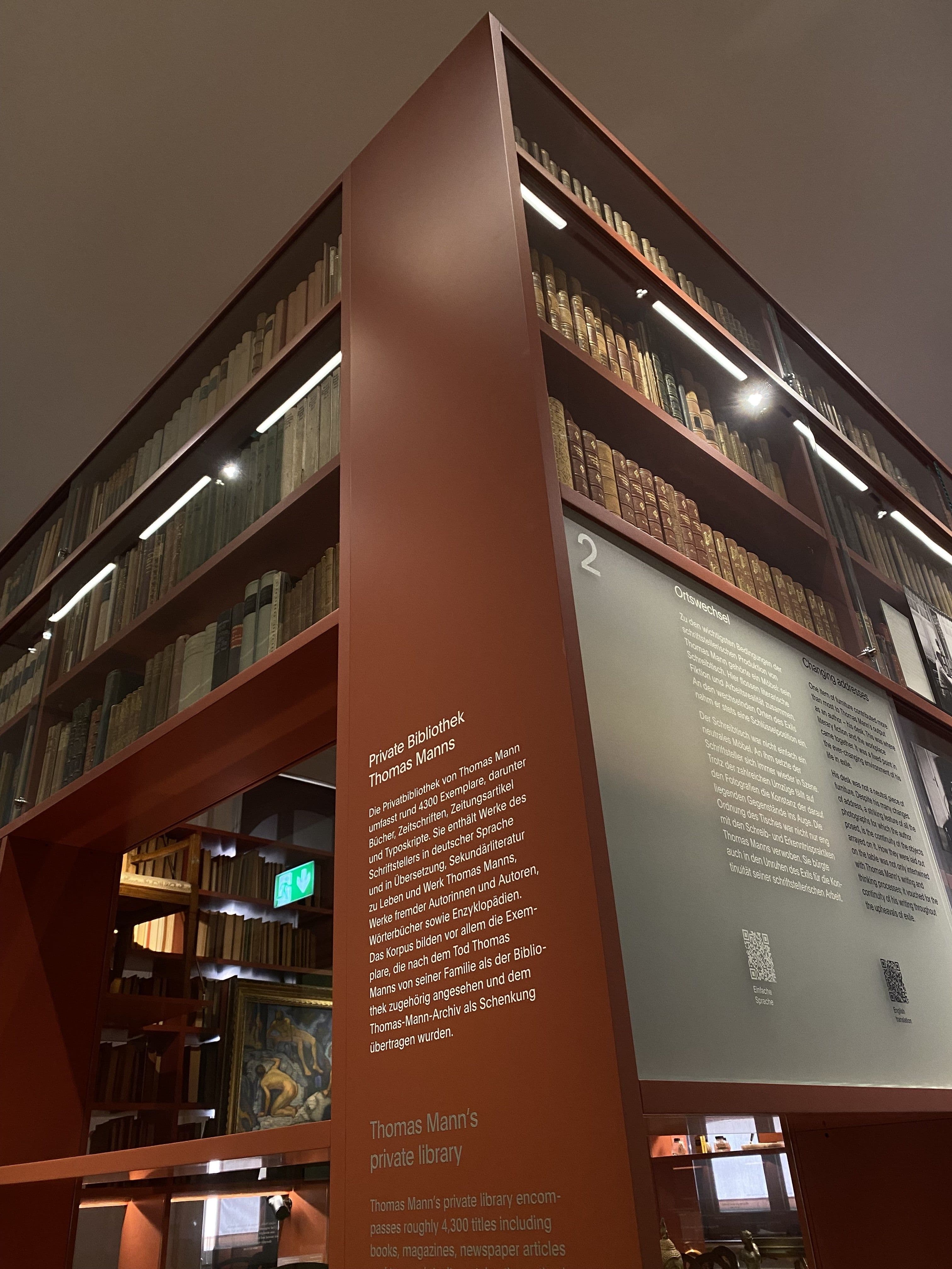 Wie schon der Titel verrät, steht das Arbeitszimmer von Thomas Mann im Zentrum der Ausstellung. Auch die räumliche Gestaltung rückt den Arbeitsbereich in den Mittelpunkt: Der Schreibtisch und weitere persönliche Gegenstände des Autors befinden sich geschützt in einem separaten Kubus. Dadurch wird ein Raum im Raum kreiert, in den die Besuchenden von verschiedenen Seiten Einblick erhalten. Die Kurator:innen lösen damit sehr geschickt das Problem, dass die wichtigen Bestandteile des Nachlasses möglichst vor äusseren Einflüssen geschützt ausgestellt werden müssen, damit sie keinen Schaden nehmen. Häufig entsteht durch diese Notwendigkeit eine Distanz zu den Ausstellungsobjekten. Durch das hier gewählte Motiv des Einblicks in den Kubus gelingt es jedoch, dass die Besucher:innen eine Nähe zu den Artefakten und der Thematik empfinden können.