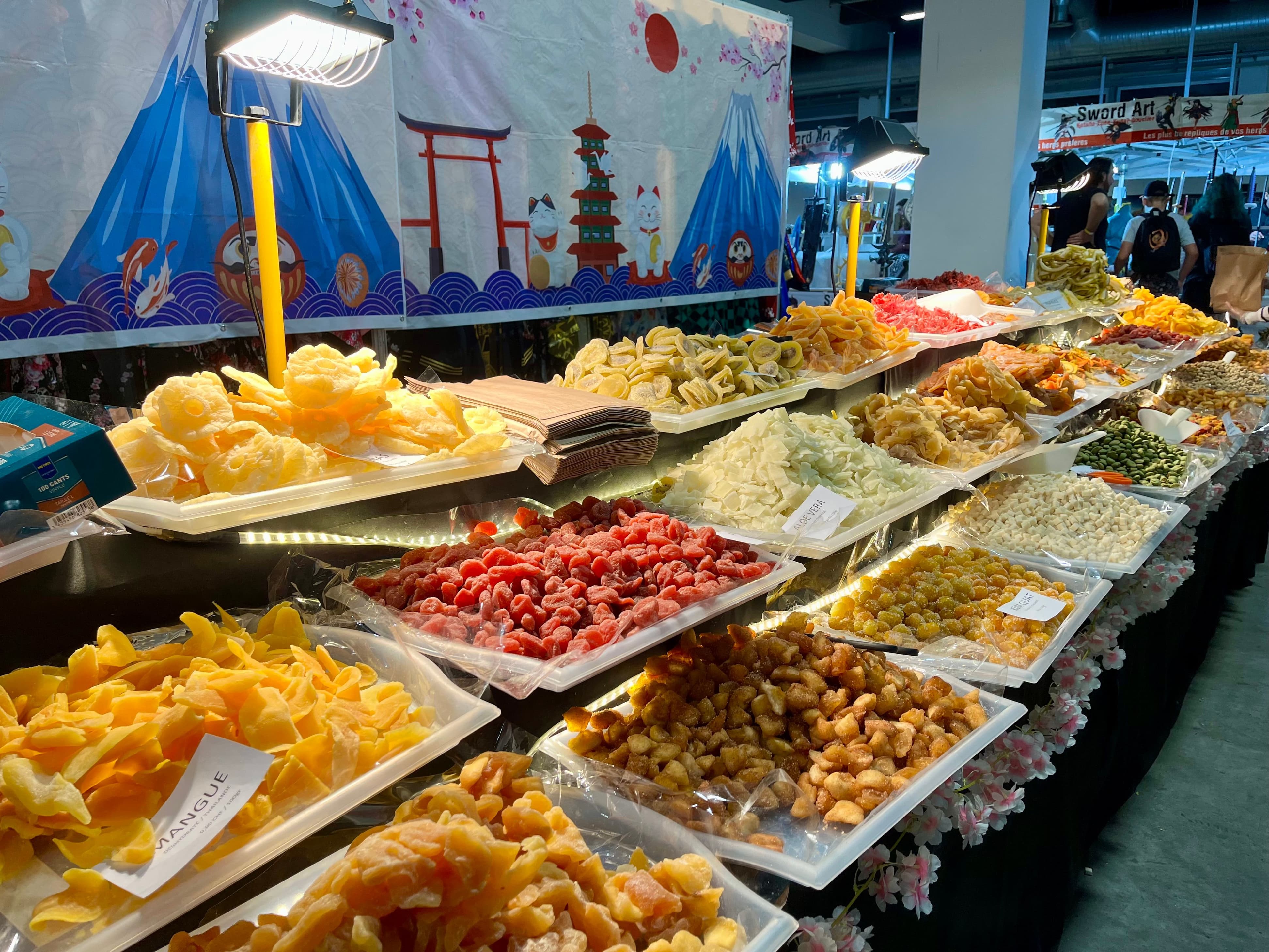 Obwohl die Fans, Cosplayer:innen und Gamer:innen, die sich bei diesen Messen versammeln, längst nicht alle mit Mangas und der japanischen Popkultur vertraut sind, ist hier kulinarisches Angebot aus Ost-Asien Standard. Dabei ist es meist ein Balanceakt zwischen Exotismus und Vertrauen erweckendem Branding und Kitsch. Zwischen Schwertrepliken und Artist Alleys beschwören Stände mit Trockenfrüchten den Reiz des frühen Kolonialwarenhandels. Farbenfroh und in opulenten Haufen aufgeschichtet, kann man sein Auge an exotischen Köstlichkeiten weiden. Selbst der zeitgenössische, an das globalisierte Nahrungsangebot gewöhnte Appetit muss beim Anblick von Kumquats, Hibiskus, Aloe Vera und Wasabi wachgekitzelt werden. Flankiert wird das Spektakel von ewig blühenden Kirschblütengirlanden aus Plastik und zufrieden lächelnden und winkenden Glückskatzen, die mit ihrer unschuldigen Kawaii[1]-Ästhetik dazu einladen, sich an die fremden Genüsse zu wagen.