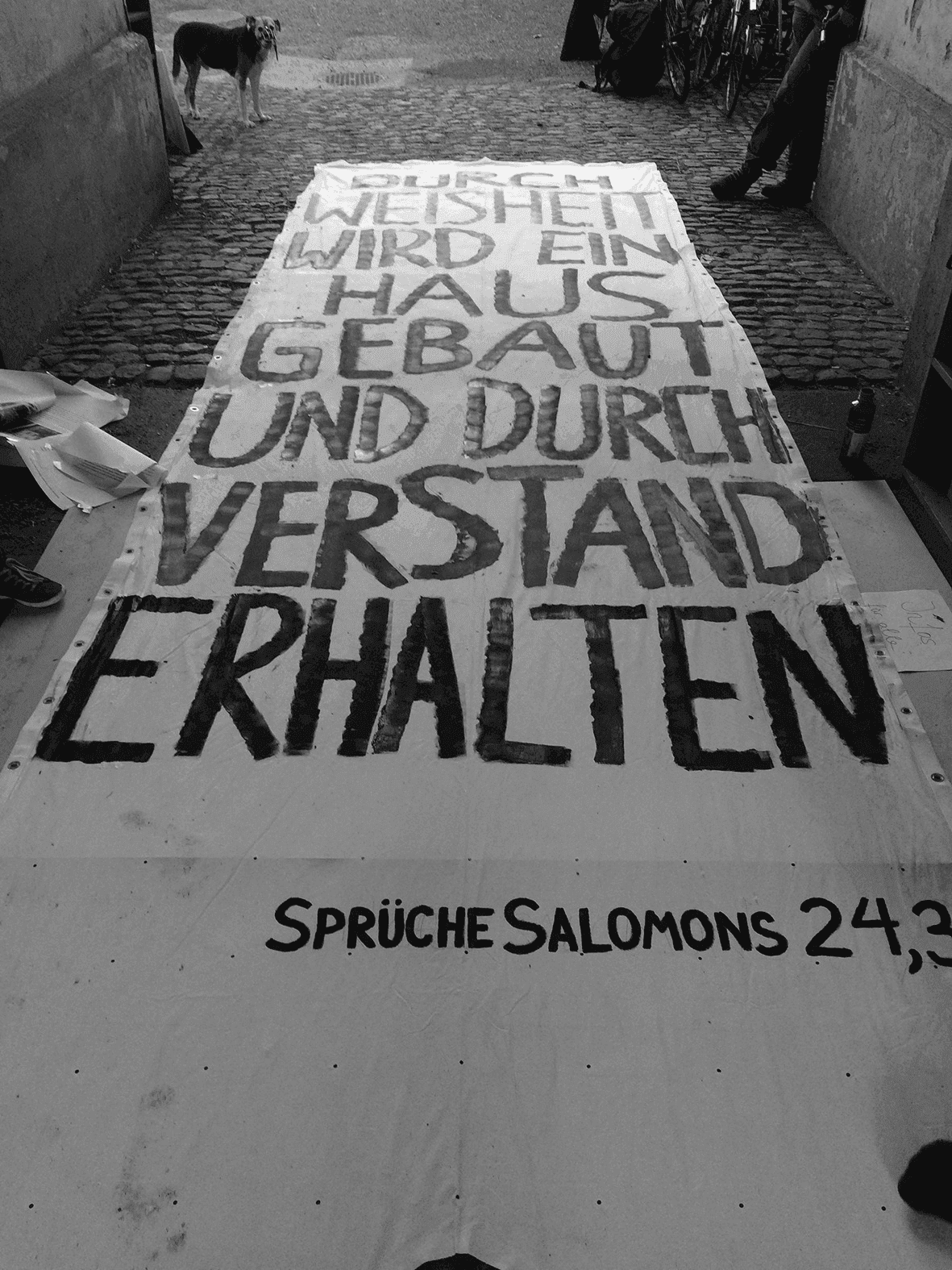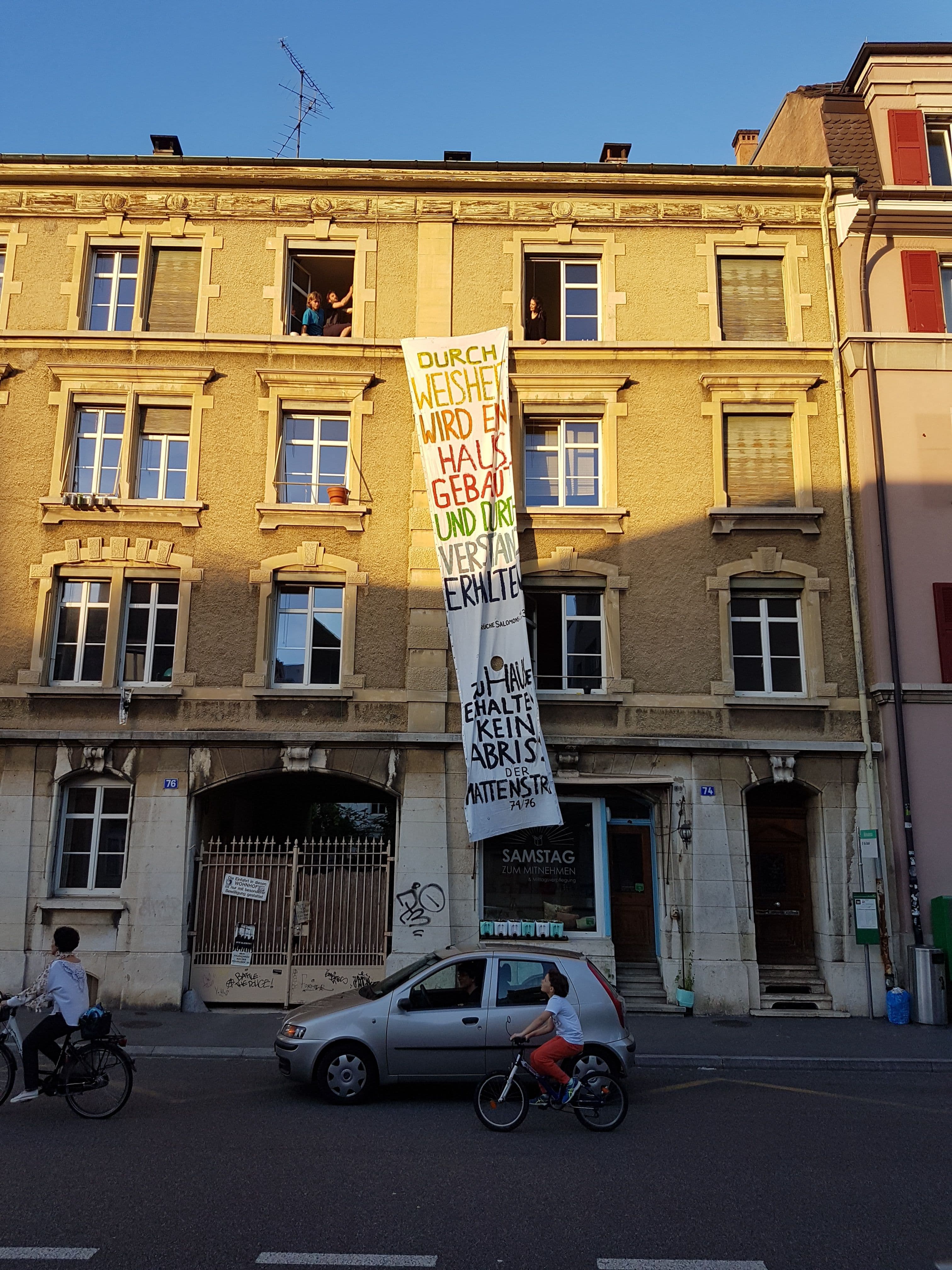 Unseren Widerstand gegen die drohende Verdrängung bezeugten wir erstmals im Mai 2017 öffentlich, als wir ein grosses Transparent über die Aussenfassade unseres Hauses hingen, auf dem ein Spruch Salomons aus der Bibel stand: «Durch Weisheit wird ein Haus gebaut und durch Verstand erhalten». Das Transparent weckte innert kurzer Zeit das Interesse von Regionalmedien, die daraufhin über den Fall berichteten.