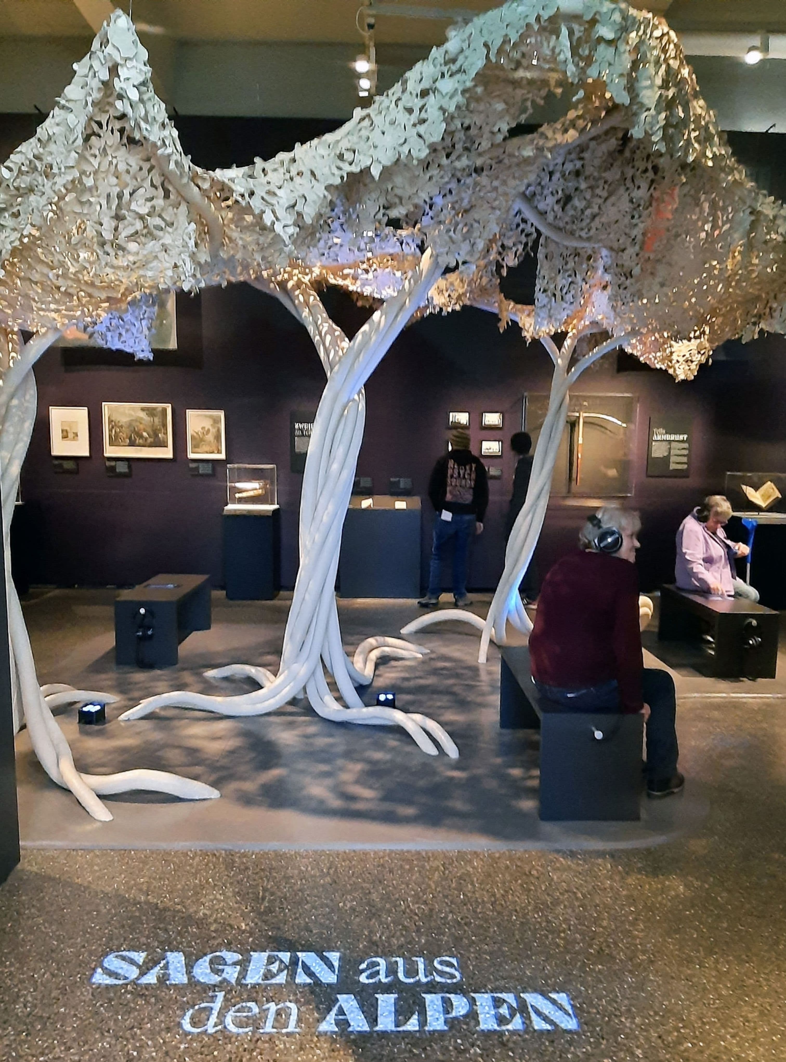 Die Ausstellung folgt lose einer chronologischen und vom Allgemeinen zum Besonderen vorgehenden Ordnung. Sie begrüsst das Publikum mit der Installation eines mystisch hell erscheinenden Baums in einem dunklen Raum. Das ist nicht nur der atmosphärischen Inszenierung geschuldet, sondern wohl auch konservatorischen Gründen, denn die gleich eingangs aufgeschlagene Geschichte «Sagen erzählen und sammeln» wartet unter anderem mit Zimelien aus empfindlichem Papier auf.