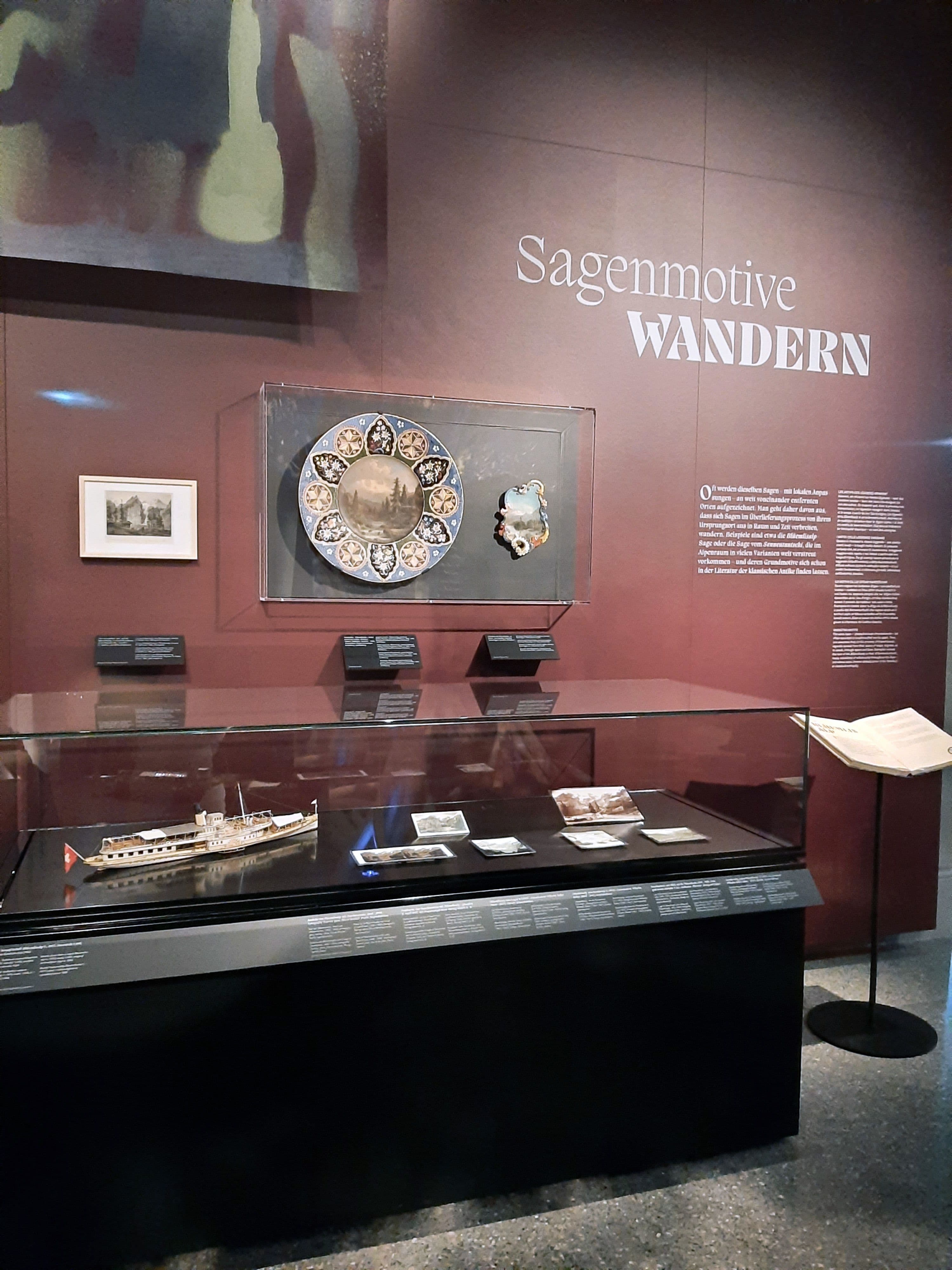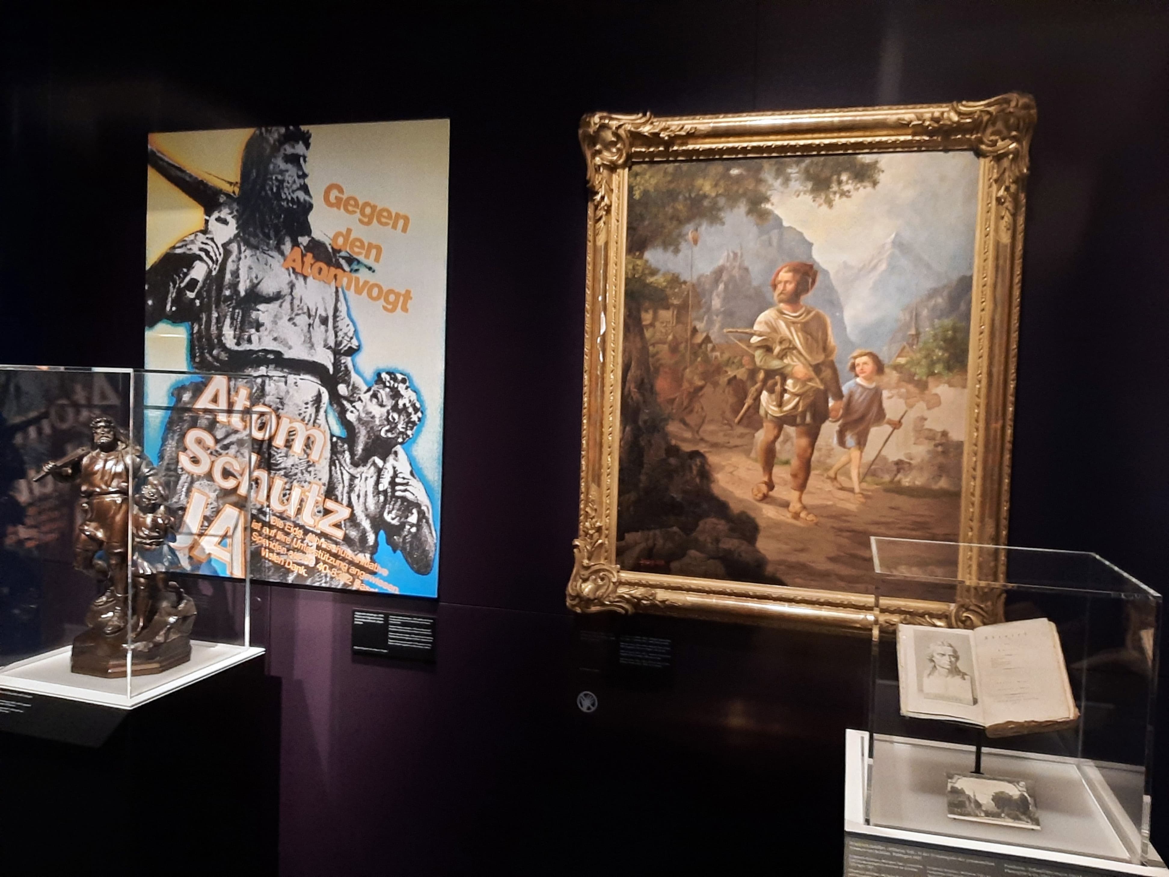 Dafür kommt Bildern eine wichtige Rolle zu – etwa gleich in den beiden grundlegenden thematischen Segmenten «Sagen erfinden Geschichte» und «Sagenhafte Alpenlandschaft». Am Beispiel der Tellgeschichte wird im (auch ikonografisch interessanten) Bogen von Hans Schriber und der ersten Illustration von 1507 über die frühen Zweifel (Ein Dänisches Mährgen) und Auseinandersetzungen bis zum legendären Kampf «gegen den Atomvogt» erkennbar, wie Geschichten und Geschichte ineinanderwirken und zur wandelbaren politischen Ressource werden. An der berühmten Sage von der Teufelsbrücke wird exemplarisch gezeigt, wie physische Orte nach Sagen verlangen und diese wiederum den Ort als Topos hervorbringen – nicht zuletzt vermittelt über eine reiche imagerie populaire, die bis zur Ansichtskarte und zur gedruckten Tapete aus dem Biedermeier reicht.