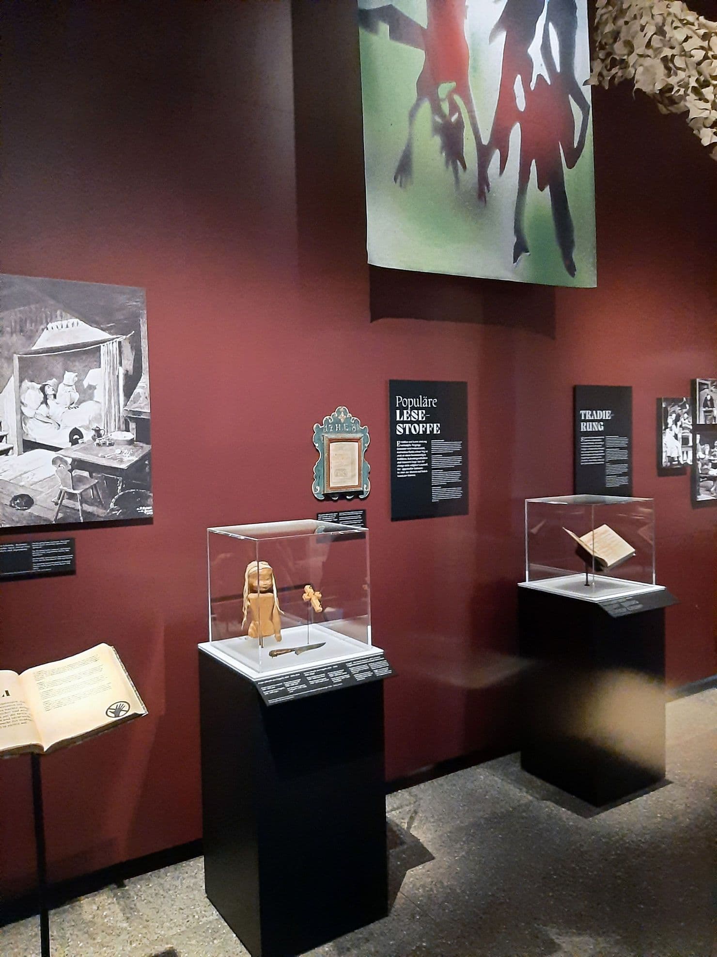 Überhaupt bleiben die erzählenden Menschen neben den Sammlern und Literaten – freilich auch quellenbedingt – etwas konturlos. Dabei hätte hier gerade die berühmte Sammlung des Altdorfer Spitalpfarrers Josef Müller (1870–1929), die leider nur in einem flächig dekorativen Faksimile einer Aufzeichnung «Einen Tunsch […]» präsent ist, reichlich Material und Möglichkeiten geboten. Immerhin begegnet man dann den Menschen noch in einem als merkwürdig stimmungsvolle Stube eingerichteten Videoraum. An Ausschnitten aus dem Kinofilm Arme Seelen (Edwin Beeler, 2011) lässt sich etwas von der noch gar nicht so lange zurückliegenden Präsenz der Erzählstoffe und Vorstellungswelten im Alltag der alpinen Bevölkerung erahnen. Uralte Sagenstoffe werden da erzählt, als wären sie gestern erlebt worden – ein wichtiges Prinzip, das hier auch ohne weitere Erklärungen erkennbar wird.