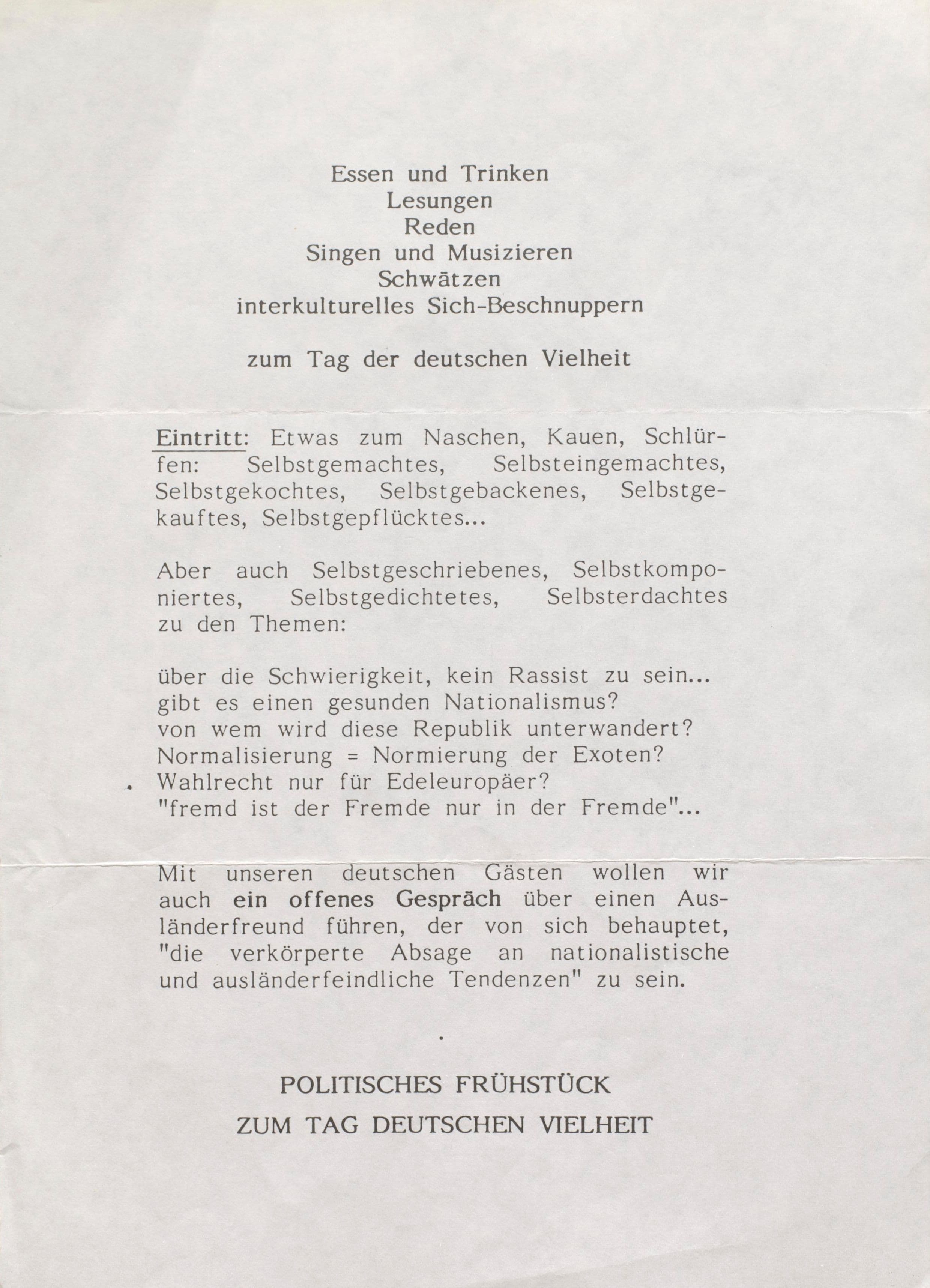 Vertreter:innen der Initiative nahmen wortstark an den öffentlichen Debatten der Stadt teil. Dabei sind vier zentrale diskurspolitische Interventionen auszumachen: Erstens sprachen sie explizit von «Rassismus», was damals wenig verbreitet war, und traten mit einem breiten Rassismusverständnis nicht nur gegen den Erfolg rechtsextremer Parteien an, sondern auch gegen die strukturellen und institutionellen Ausschlüsse in Verwaltung und Gesellschaft. Zum anderen artikulierten sie explizit eine Selbstorganisationslogik und wehrten sich damit gegen die dominante Stellvertreterpolitik etablierter Organisationen.[x] Zudem wandten sie sich kämpferisch gegen das bis dato hegemoniale Verständnis von Deutschland als Nicht-Einwanderungsland. So setzten sie den Begriff der «EinwanderInnen» – konsequent gendersensibel! – gegen die dominierende Redeweise von «Gastarbeitern» oder «Ausländern» und damit gegen die Annahme, dass die Migration nach Deutschland weiterhin als ein vorübergehendes Phänomen zu betrachten sei. Auch wollten sie «sichtbar machen, dass diese Stadt und diese Republik schon längst […] lebendiger, vielfältiger, internationaler sind, als es offiziell und gesetzlich anerkannt ist».[xi] Ihr Ziel war die «Normalisierung der Lage von Einwanderern und Einheimischen in dieser Stadt».[xii] Gegen die anti-migrantische Kampagne der Mitte-Parteien und bundesweite Wahlerfolge rechtsextremer Parteien, formulierte die Initiative als zentrale Problematik «die Schwierigkeit, kein Rassist zu sein».[xiii]