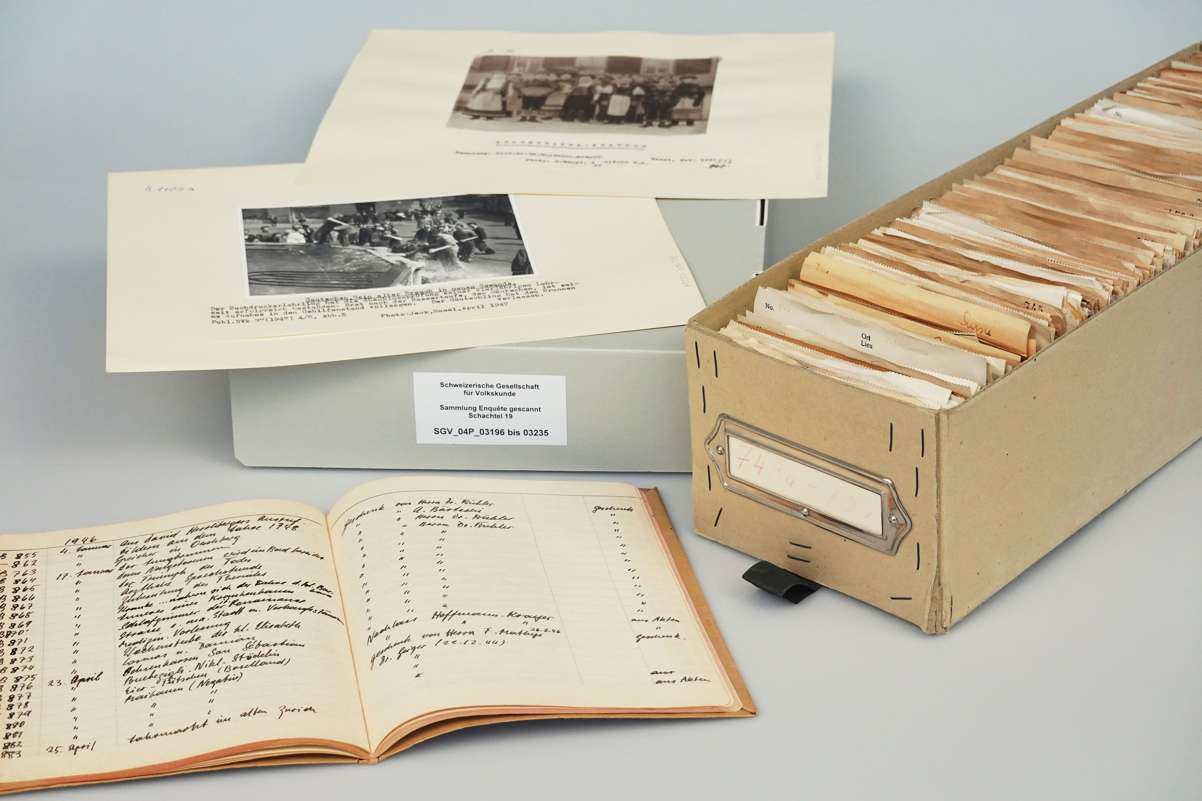 «Man erschrecke nicht über die grosse Zahl der Fragen. Es ist nicht nötig, sie alle auf einmal zu beantworten.» Über 1'600 Fragen wurden im «Fragebogen über die schweizerische Volkskunde» formuliert. «Wer sammelt das Holz und auf welche Weise?», «Was glaubt man von Kindern, die an Weihnachten geboren sind?», «Wird dem Toten ein Geldstück mitgegeben und warum?», «Wofür gilt das Niesen als Vorzeichen?». Die EKWS initiierte mit der «Enquête I» eine Sammelaktion, um einen ersten Überblick über eine „schweizerische Volkskunde“ zu schaffen. Zum Fragebogen wurden neben schriftlichen Antworten auch rund 5'000 Fotografien eingesandt. Sie sind zwischen 1925 und 1973 entstanden und können hier durchstöbert werden.