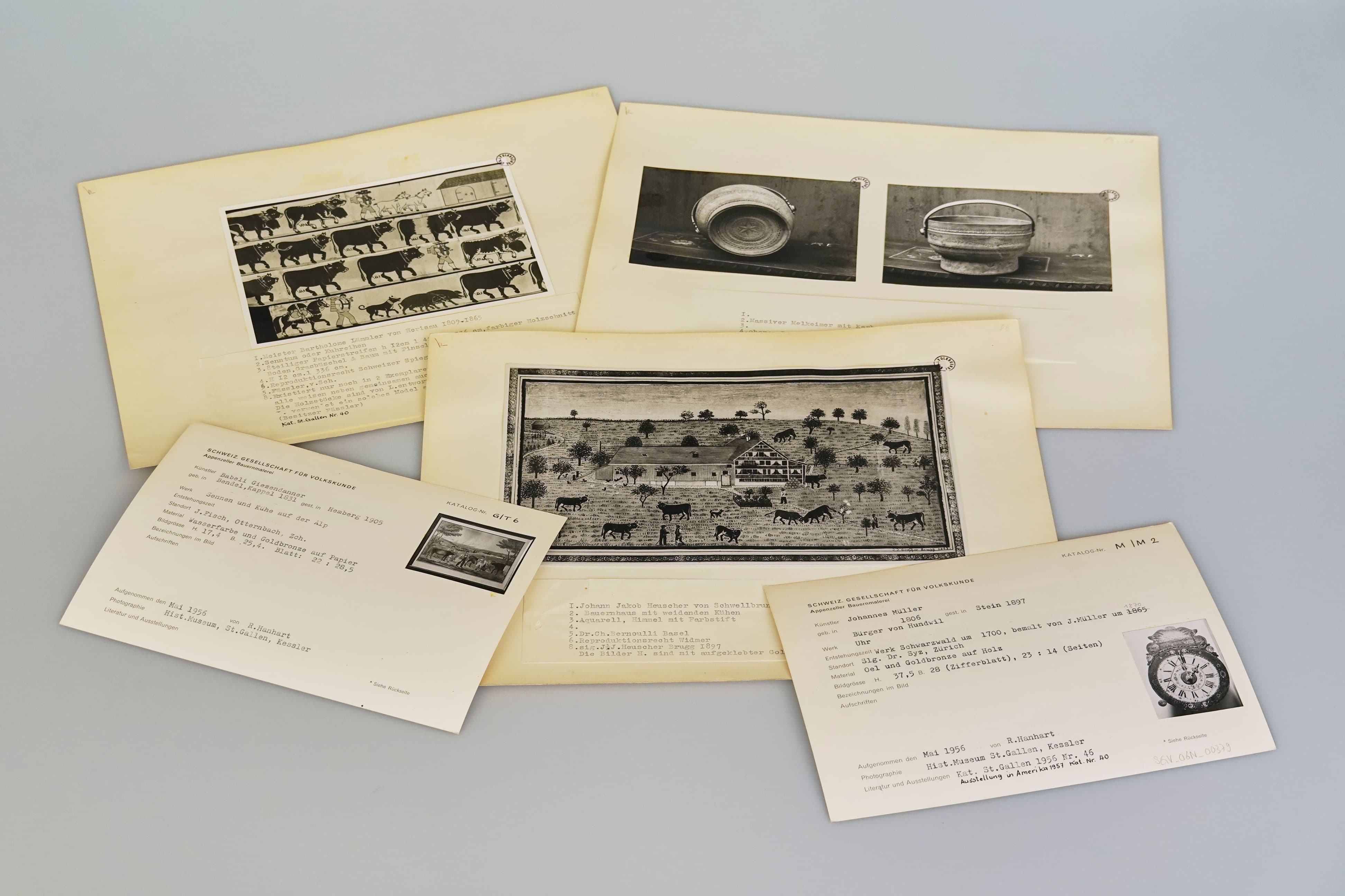 Senntumsmalereien auf einem Eimerbödeli, auf einem Sennenstreifen, als Dekoration des Uhrengehäuses oder des Bettkopfteils: rund 900 Fotografien aus den 1930er- bis 1950er-Jahren zeigen das Resultat einer EKWS-Bestandsaufnahme der Senntumsmalereien im Appenzellerland und im Toggenburg. Das Projekt wurde vom damaligen Konservator des Kunstmuseums St. Gallen, Rudolf Hanhart, geleitet und 1956/57 von Dr. Otto Frehner aus Herisau und Albert Edelmann aus Ebnat durchgeführt. Frehner und Edelmann erstellten einen Zettelkatalog, der die Malereien nach Künstler:innen ordnete. Ein grosser Teil der Fotografien zeigen Werke von Bartholomäus Lämmer (1809–1865), Johannes Müller (1806–1897), Babeli Ciezendanner (1831–1905), Johannes Zülle (1841–1938), Johann Jakob Heuscher (1843–1901) und Franz Anton Haim (1830–1890).
