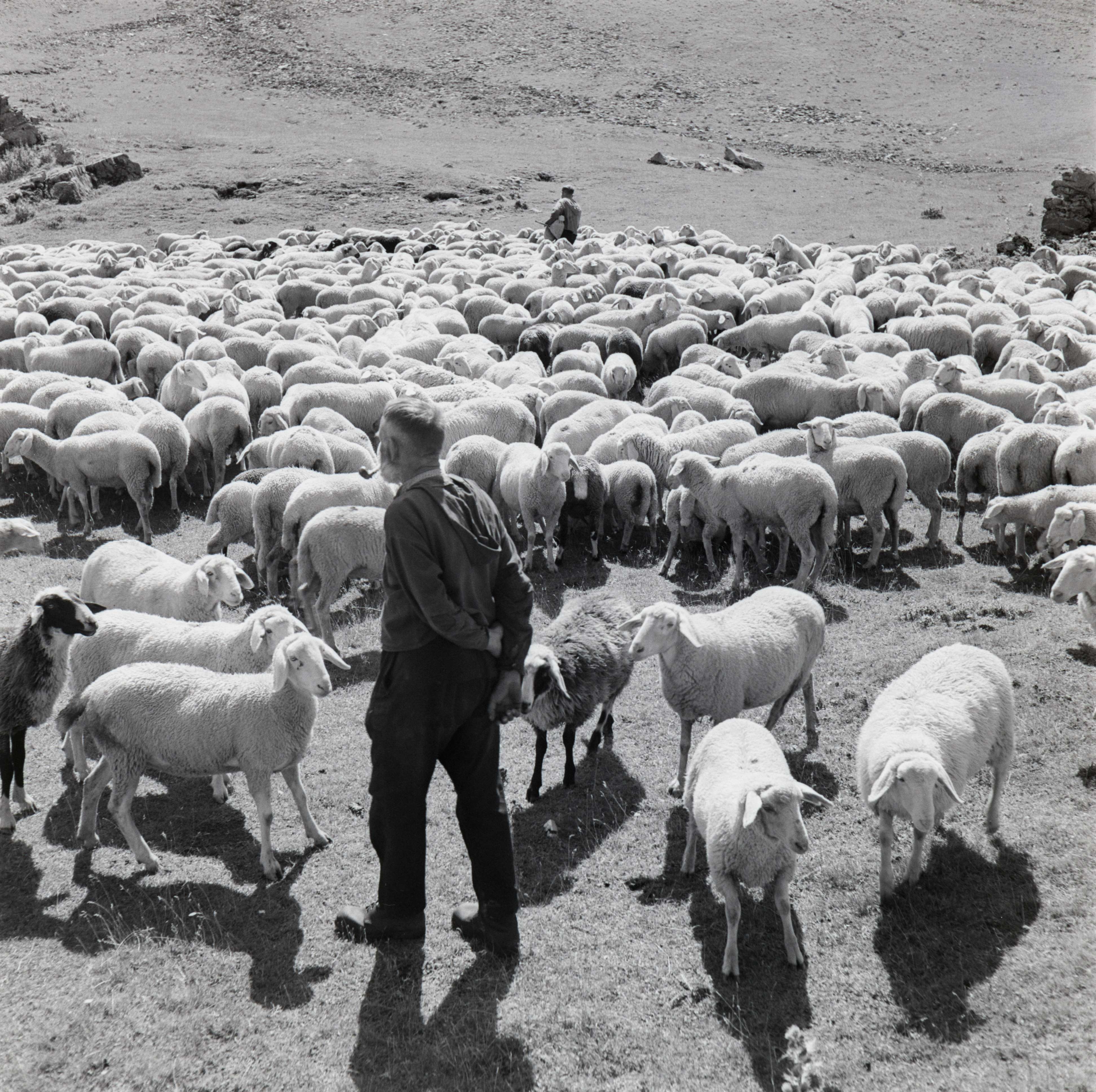 [Portrait zweier Schäfer mit Schäferhund und Schafherde]