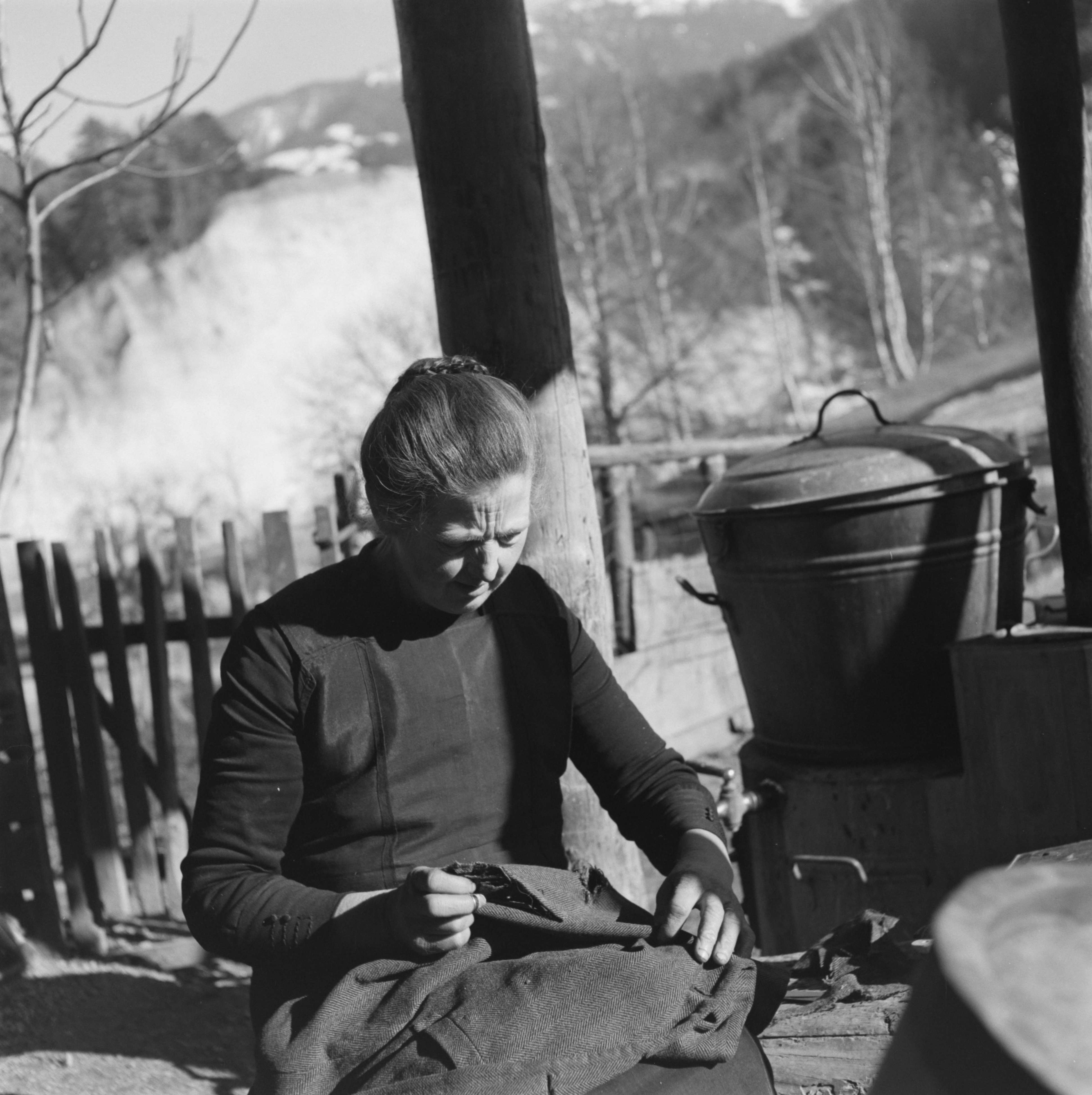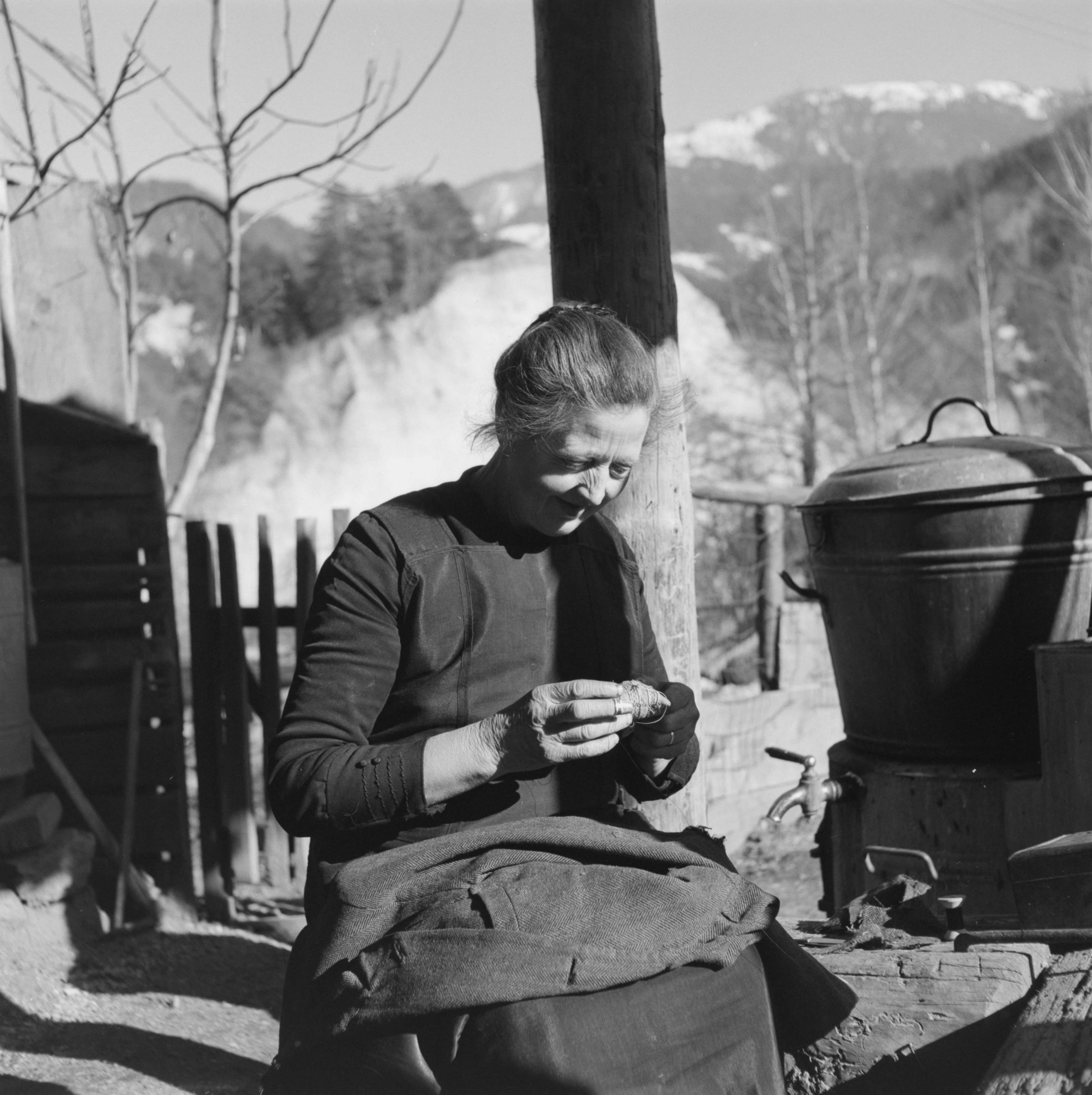 [Frau beim Flicken von Kleidern vor dem Haus]