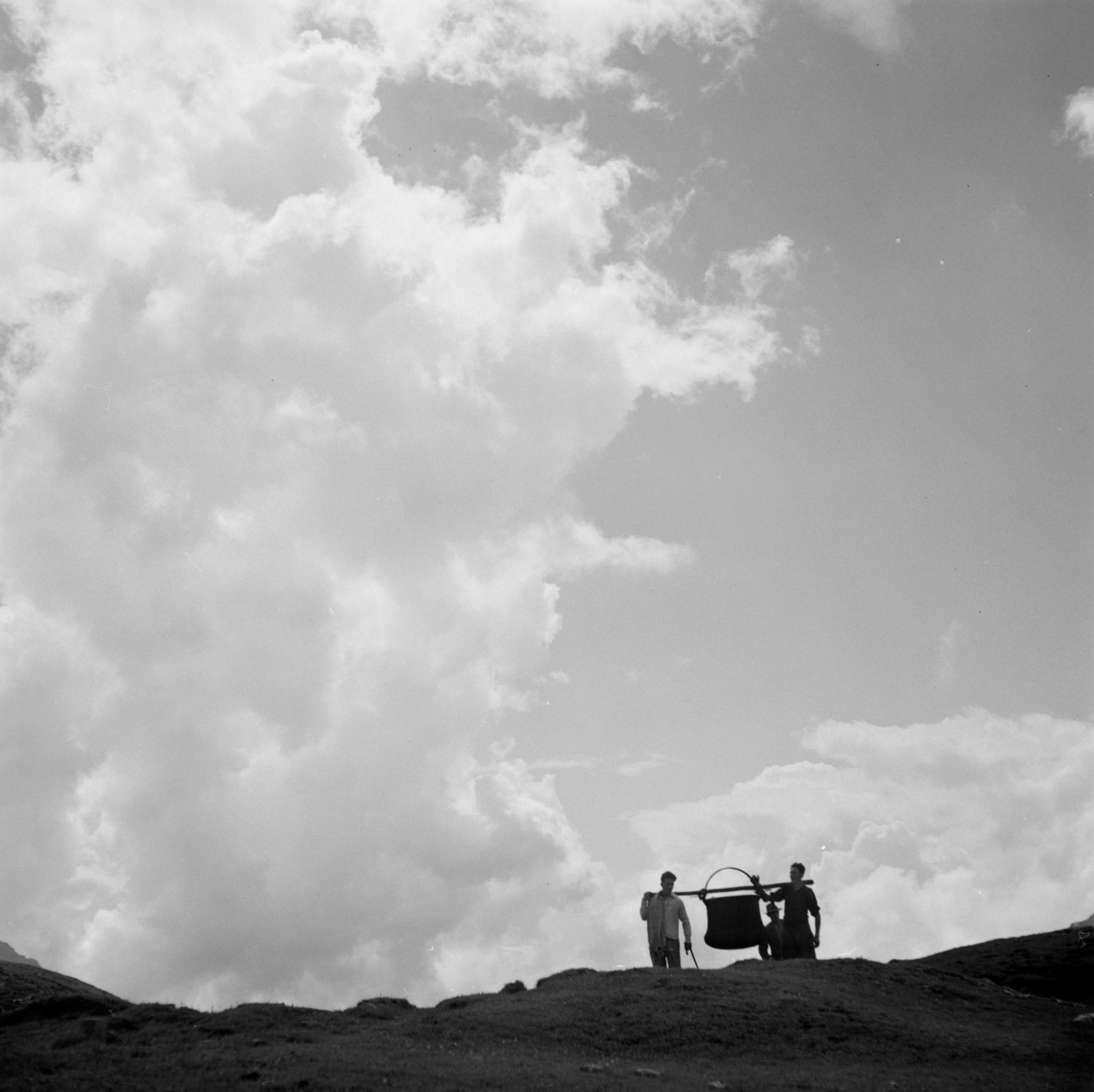 [Zwei Männer tragen einen Kessel über eine Alp]