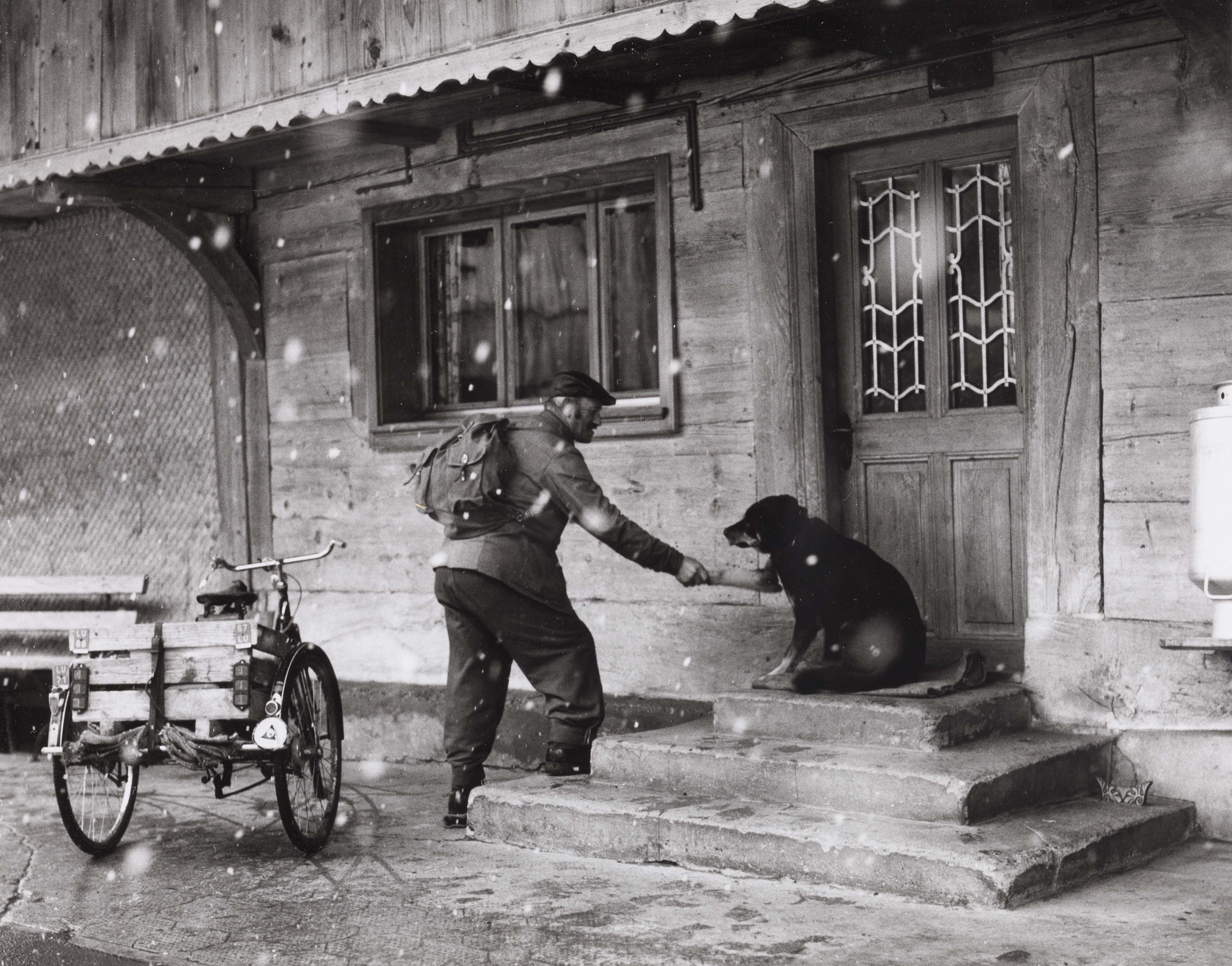 [Störgeschirrflicker Eduard Marti und der Haushund begrüssen sich]