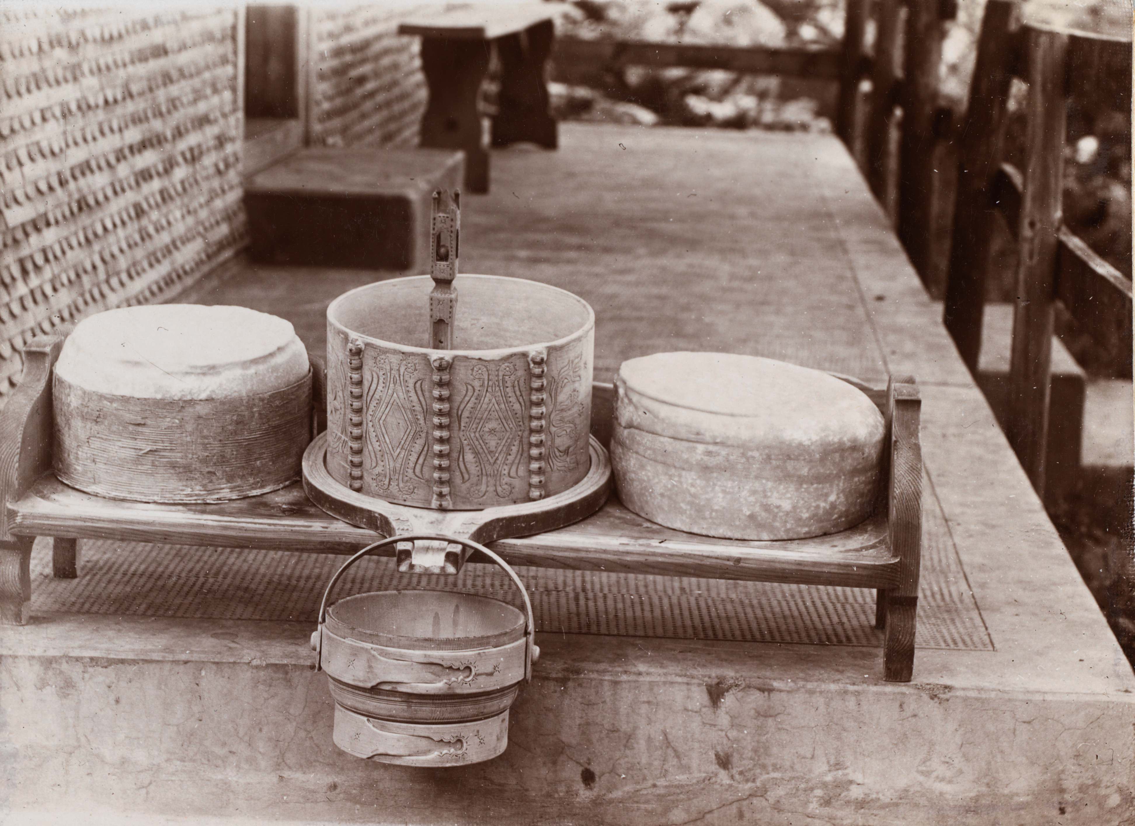 Käsen; Geräte; Käsereif: Ablaufbrett mit angehängtem Eimer