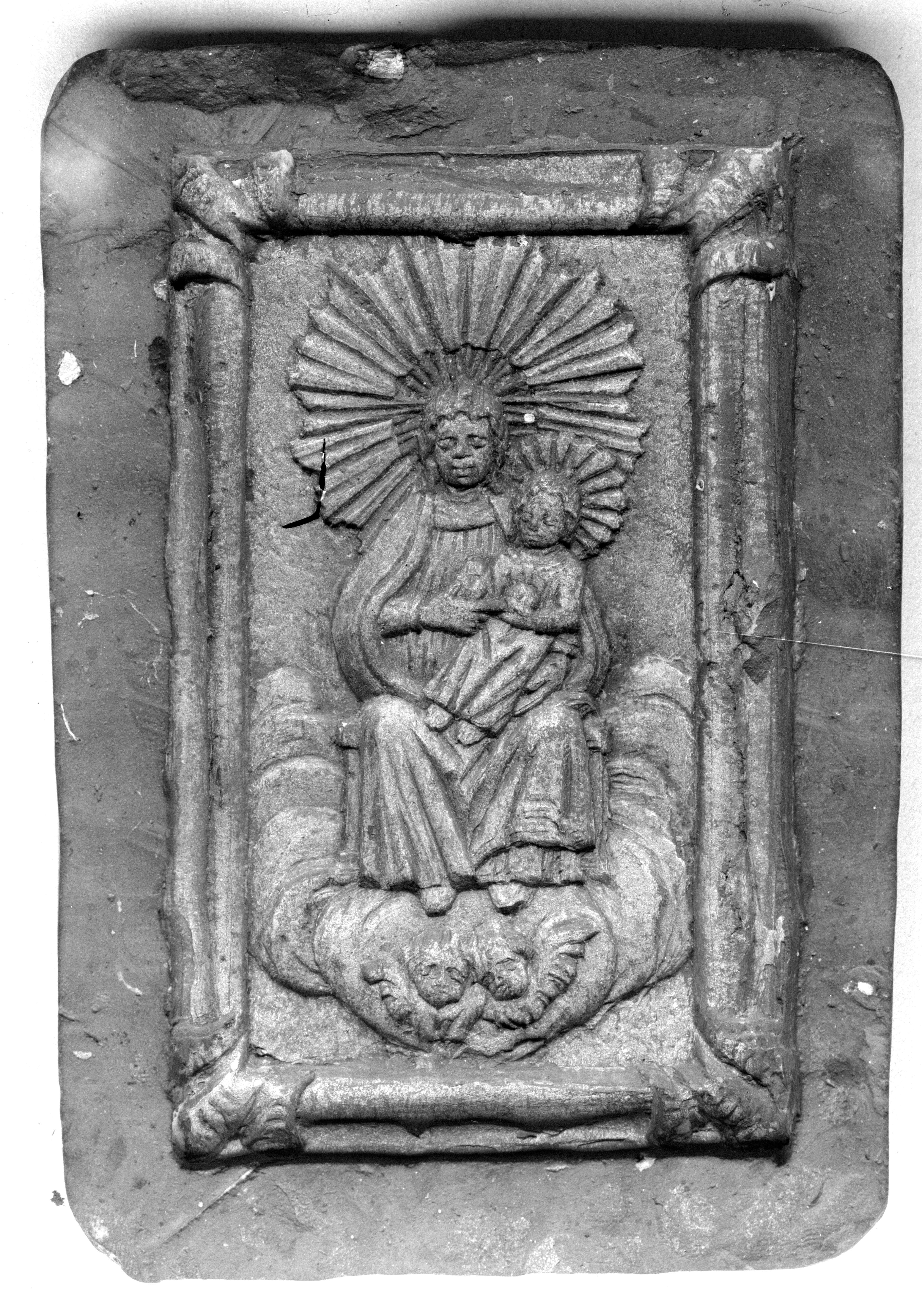 Thronende Maria mit dem Kinde in Wolken. Unter ihr 2 Cherubsköpfe.
