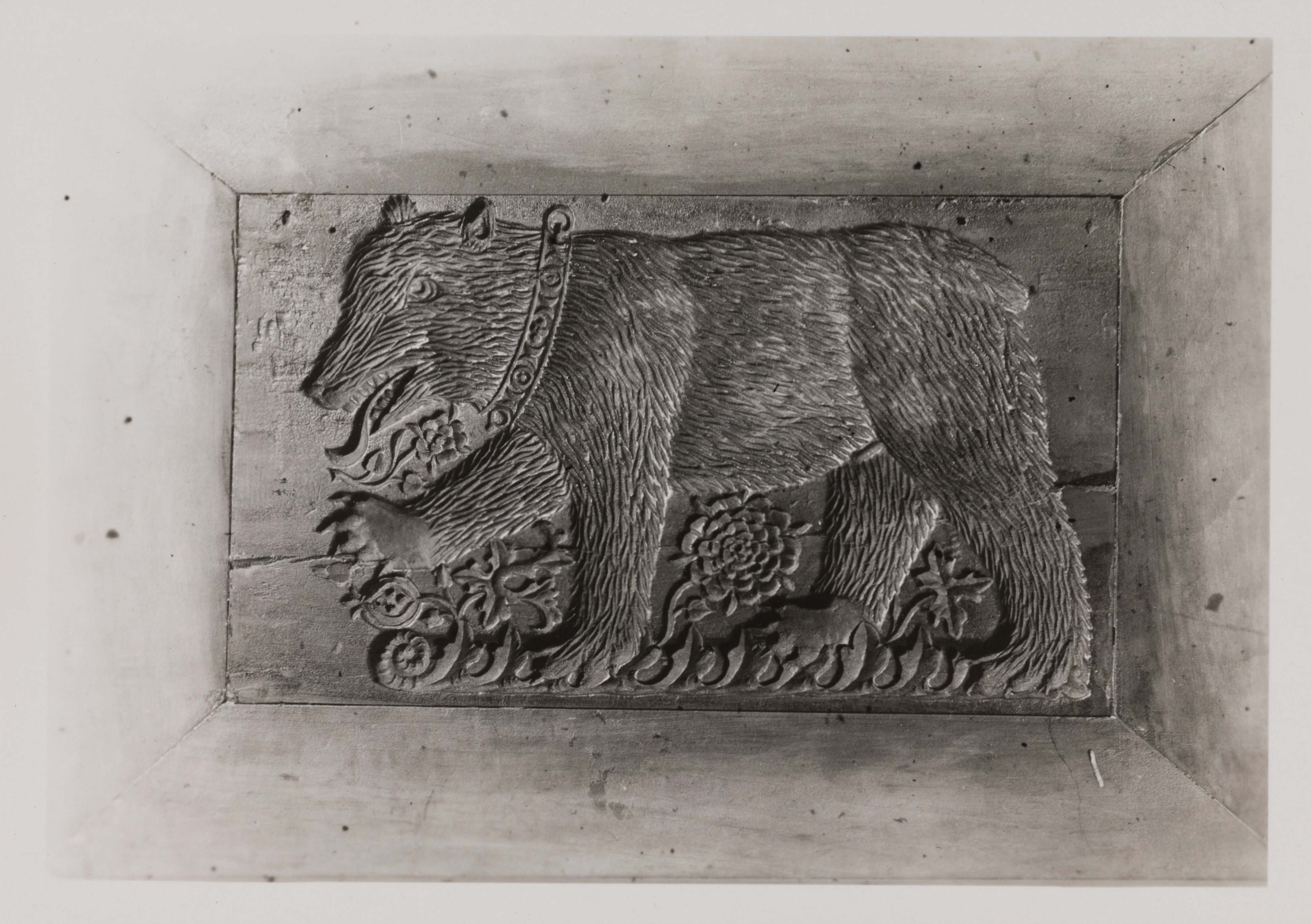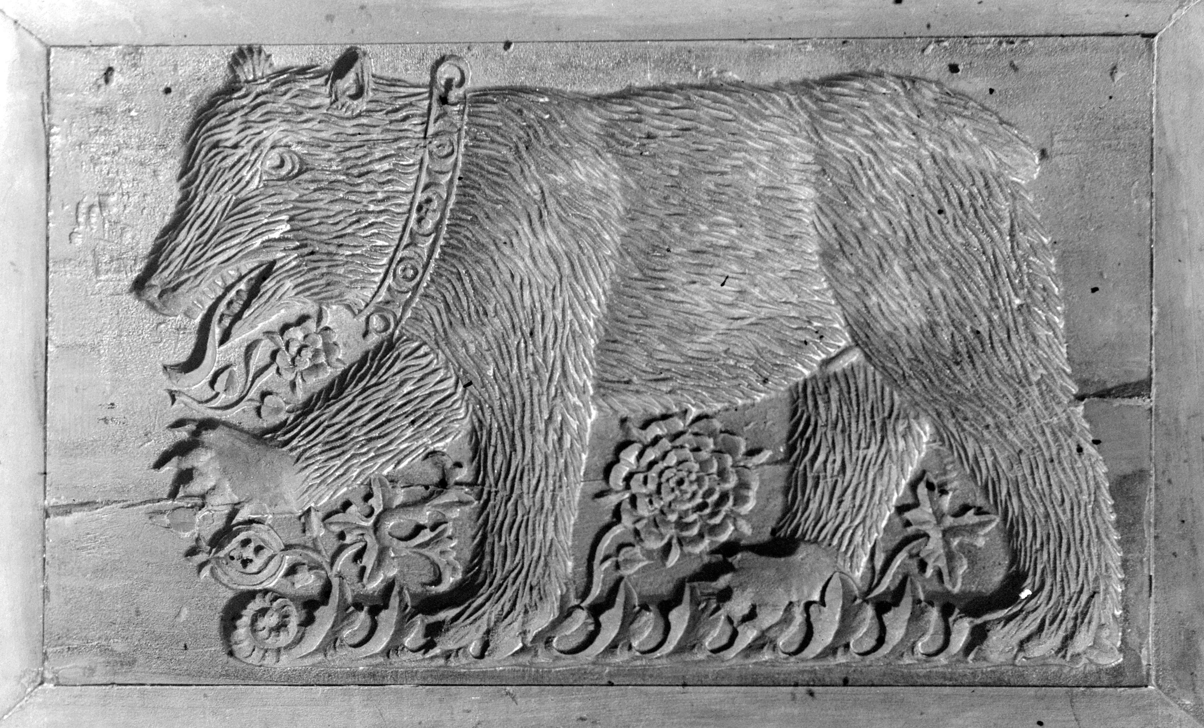 Bär, nach links schreitend, mit Halsband und Kettenring und Füllblumen zwischen den Füssen.