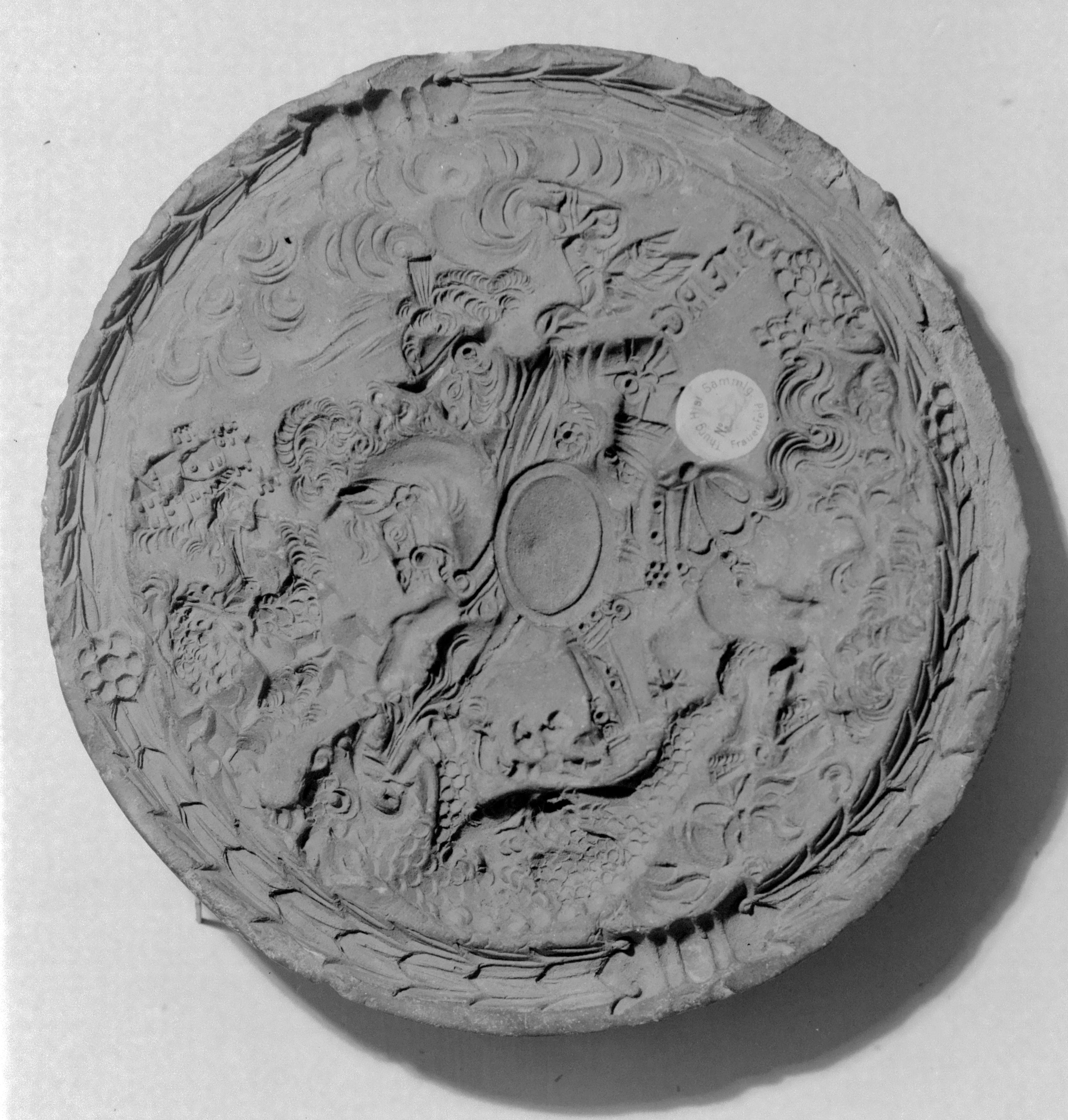 S. IERG. Der hl. Georg mit Rüstung, Schild u. Federbusch zu Pferd nach links.