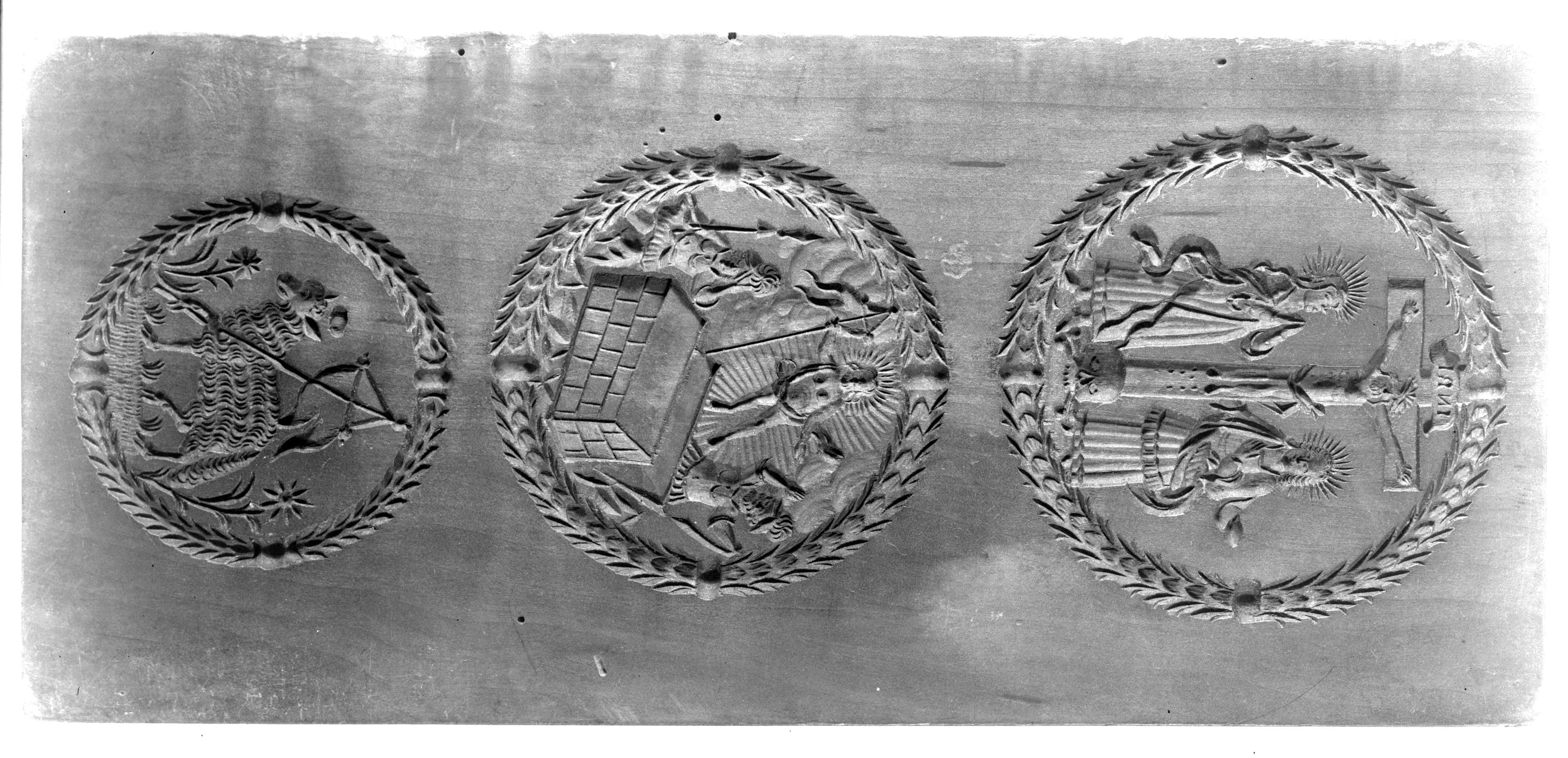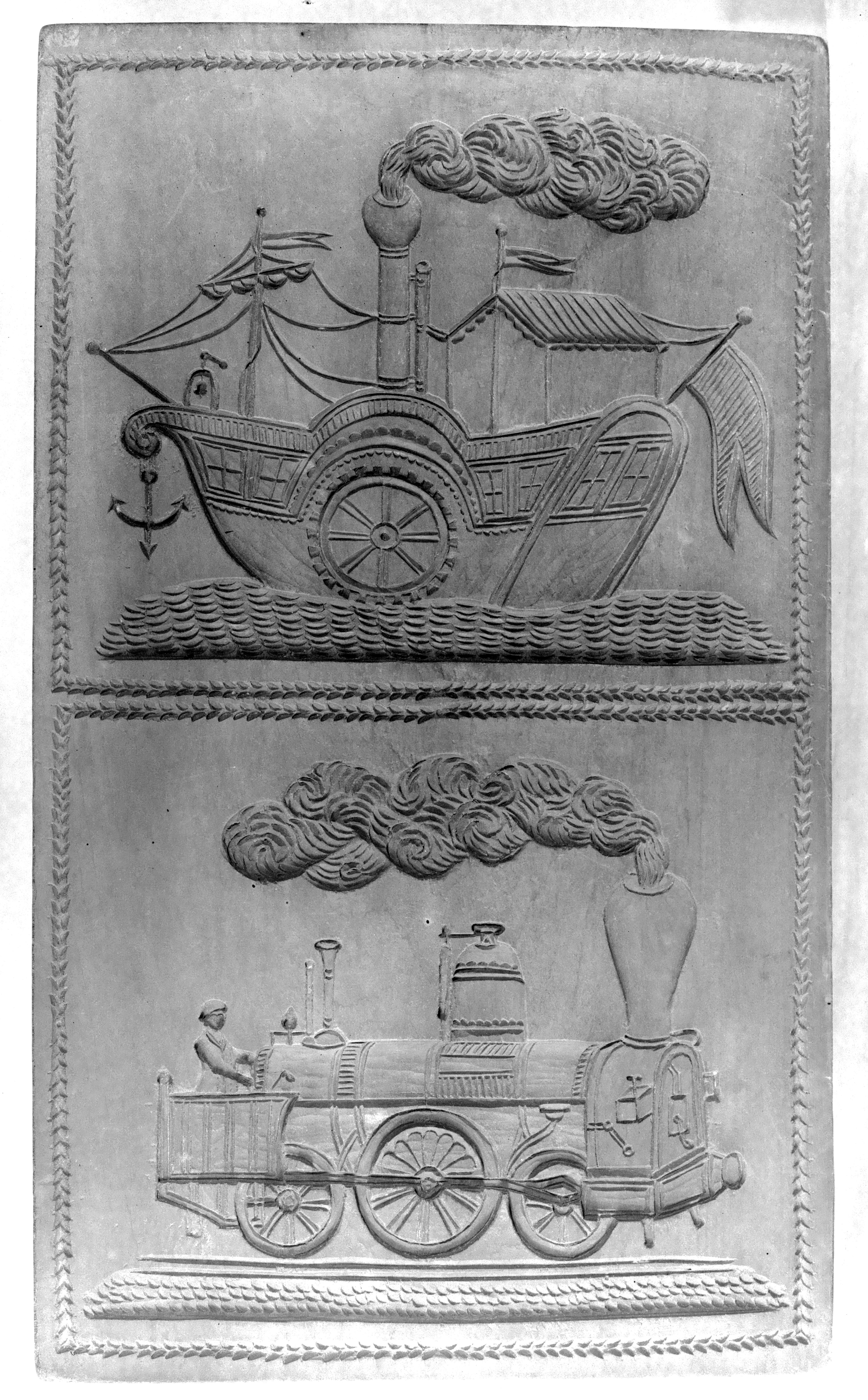 Holzmodel aus Birnbaum mit 48 kleinen Gegenständen in 12 Reihen übereinander.