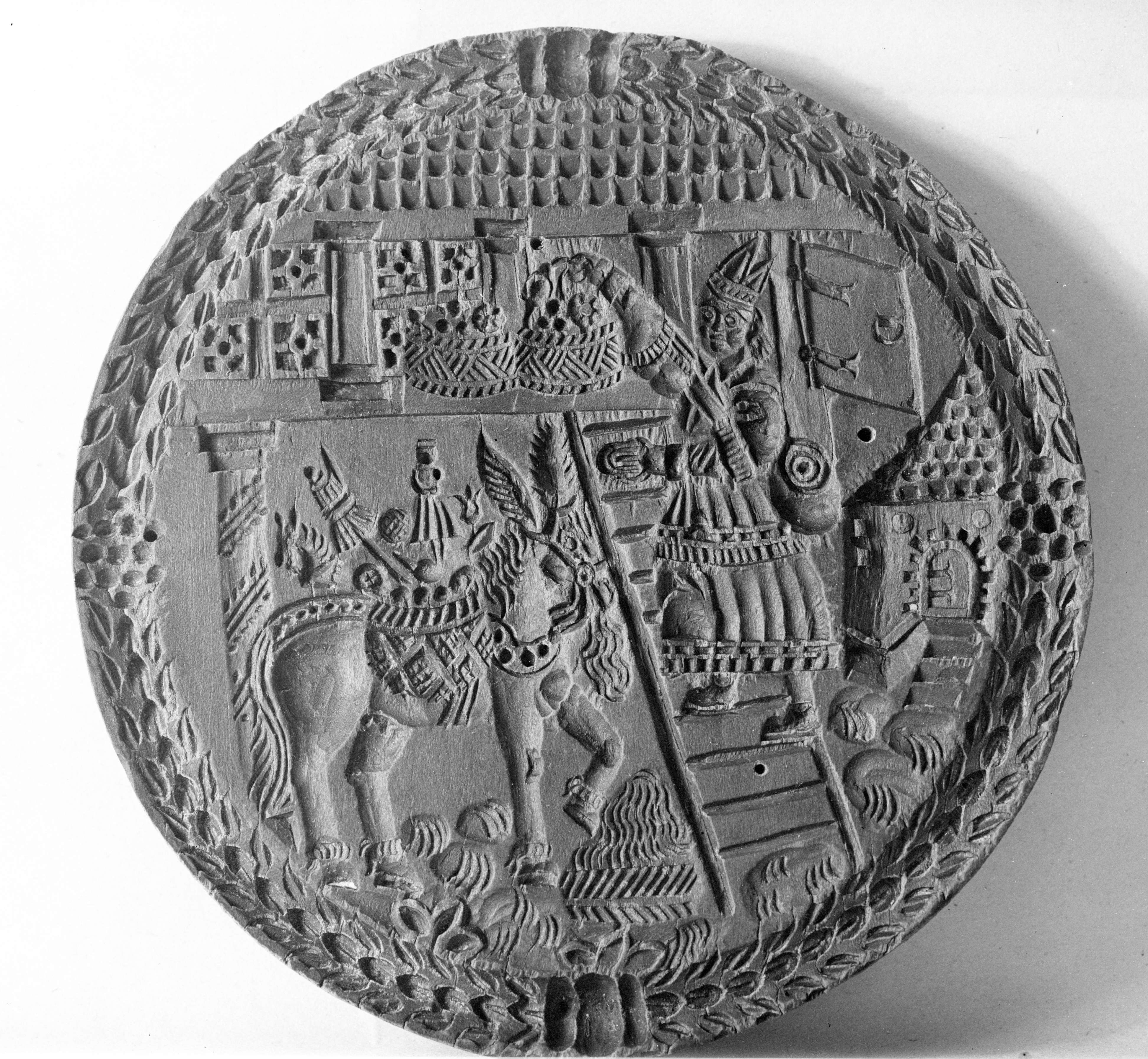 Der hl. Niklaus von Myra, in bischöflichem Ornat auf der Leiter stehend.