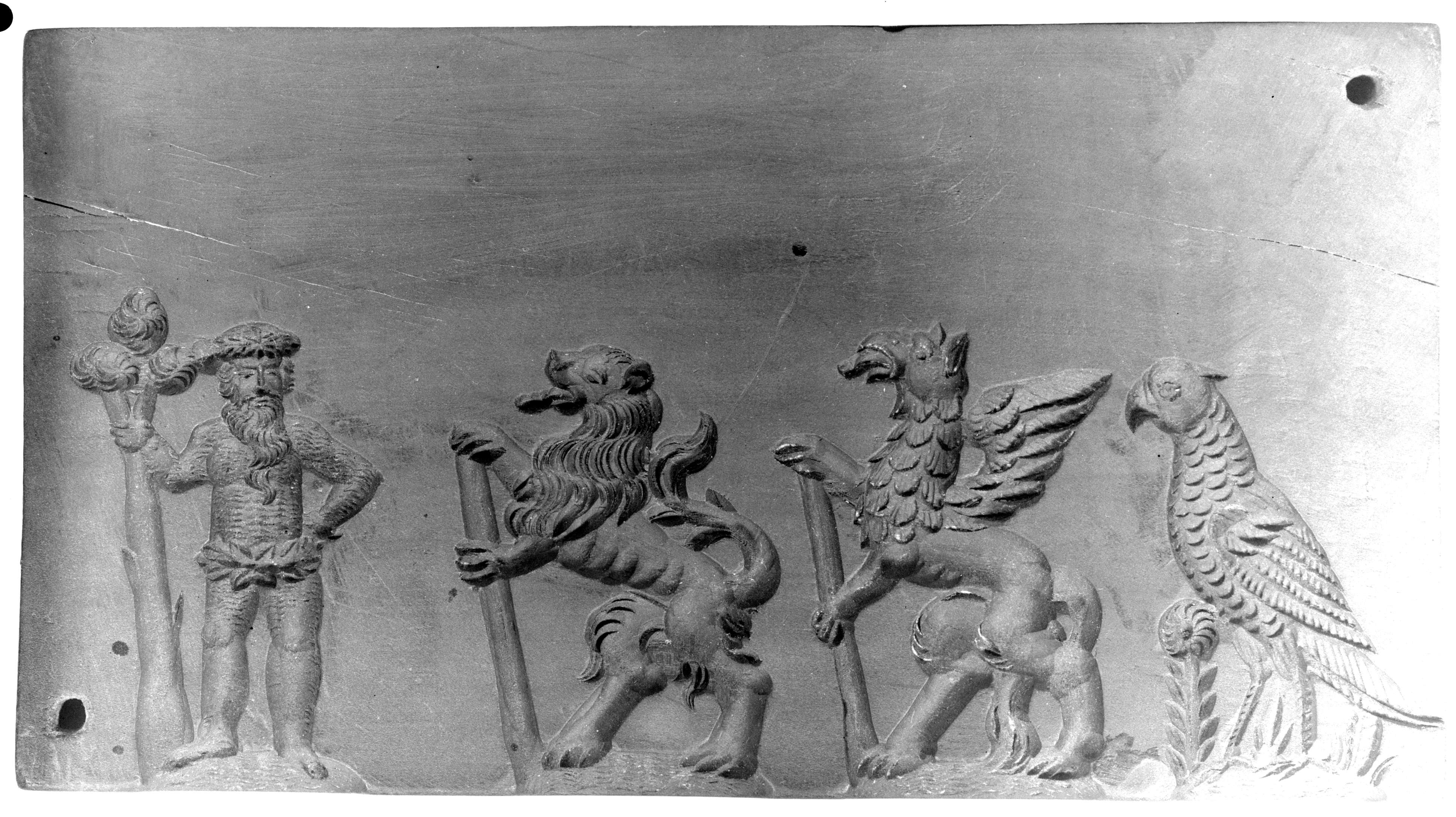 Die Kleinbasler Ehrenzeichen: Wilder Mann, Löwe und Vogel Gryff. Daneben rechts ein Kakadu.