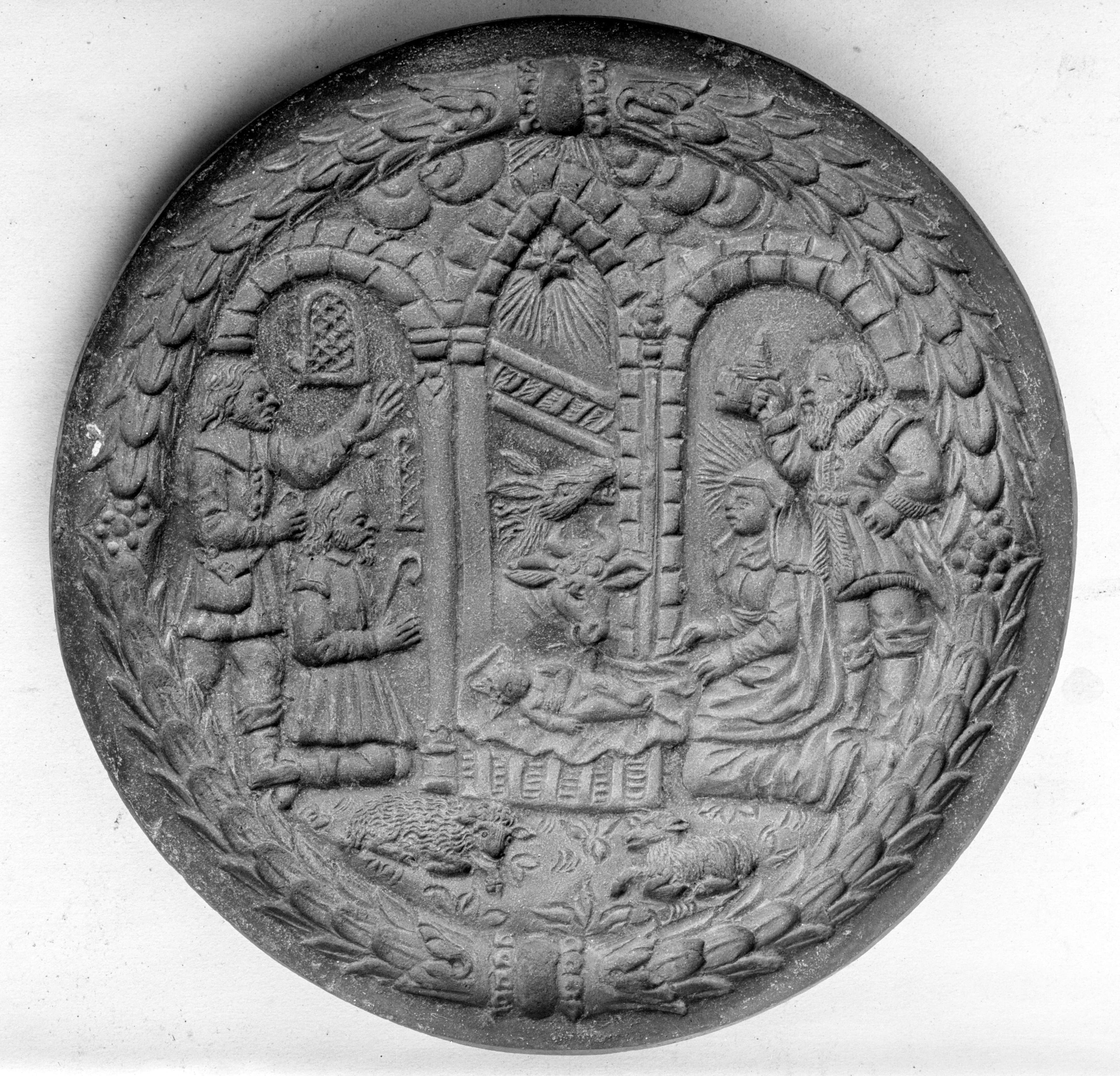 Madonna mit Kind als Himmelskönigin in der Glorie, umgeben von einem Rosenkranz.