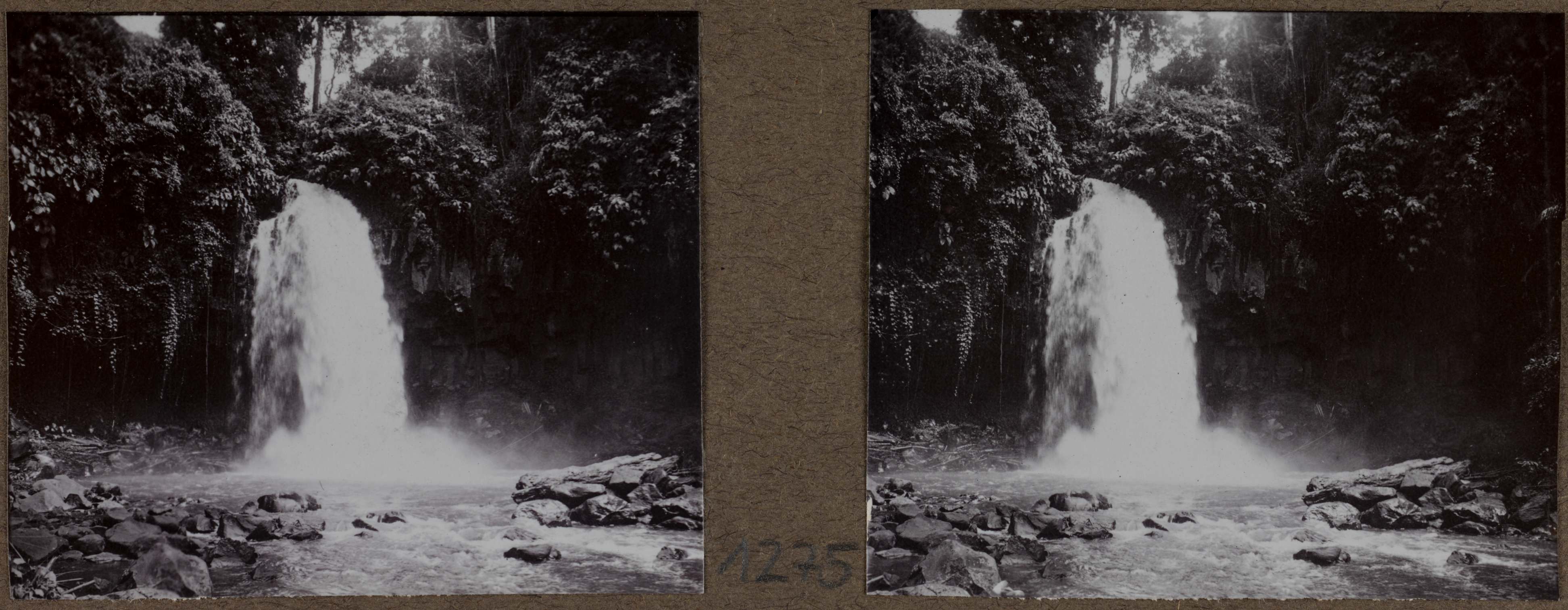 Beginn der Abstauungsarbeiten am Wasserfall. Juli 1921 [Hydro-Electrische Anlage 600 HP der N. V. Ysfabriek Siantar.]