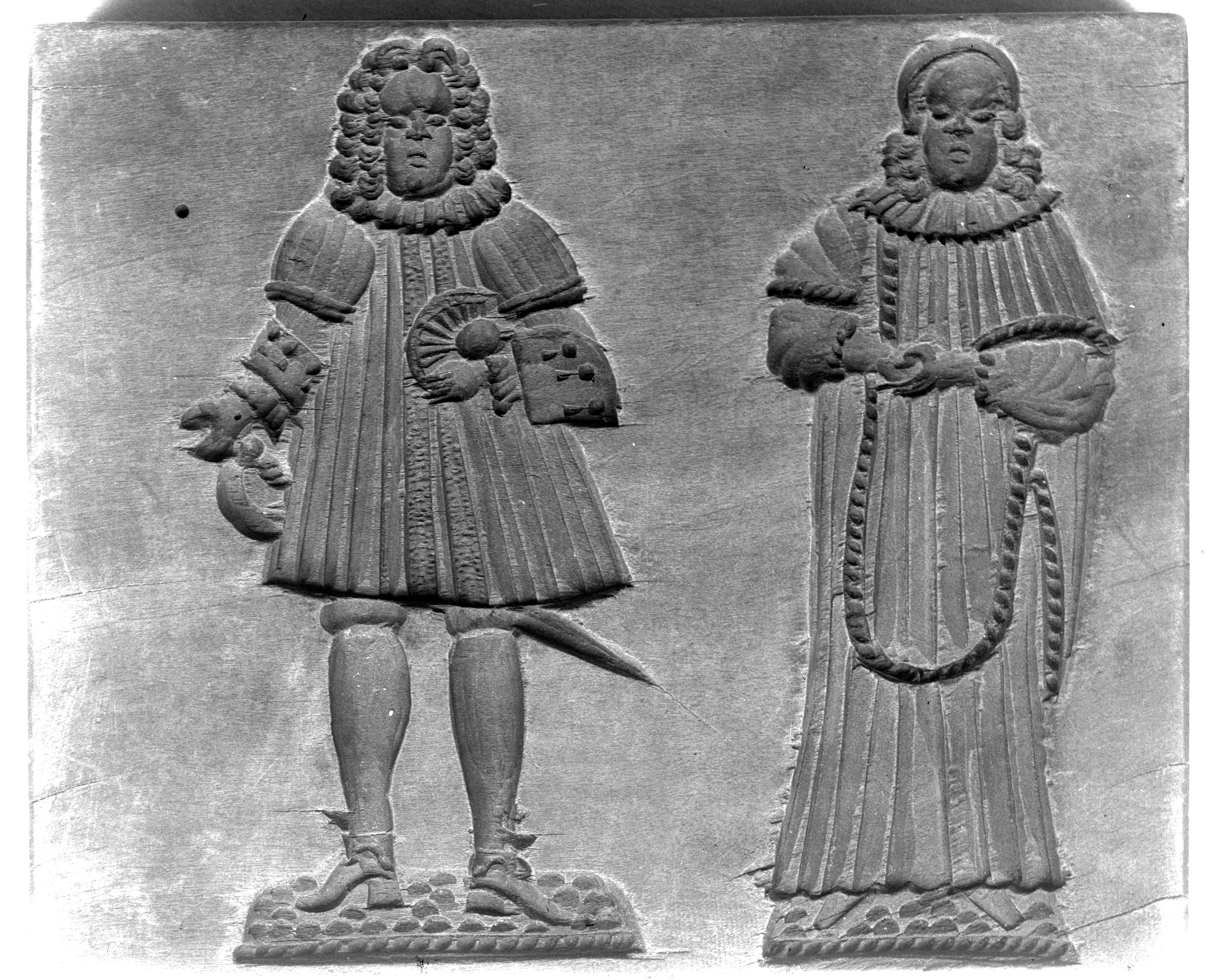 SGV_07N_00326Herr, etwa ein Ratsherr, den Hut unter dem linken Arm, das Schwert an der Seite. Bekleidet mit faltigem Wams, Halskrause und Allongeperücke. Daneben ein offenbar geistlicher Herr im langen, faltigen Talar mit plissiertem Kragen. [verso]