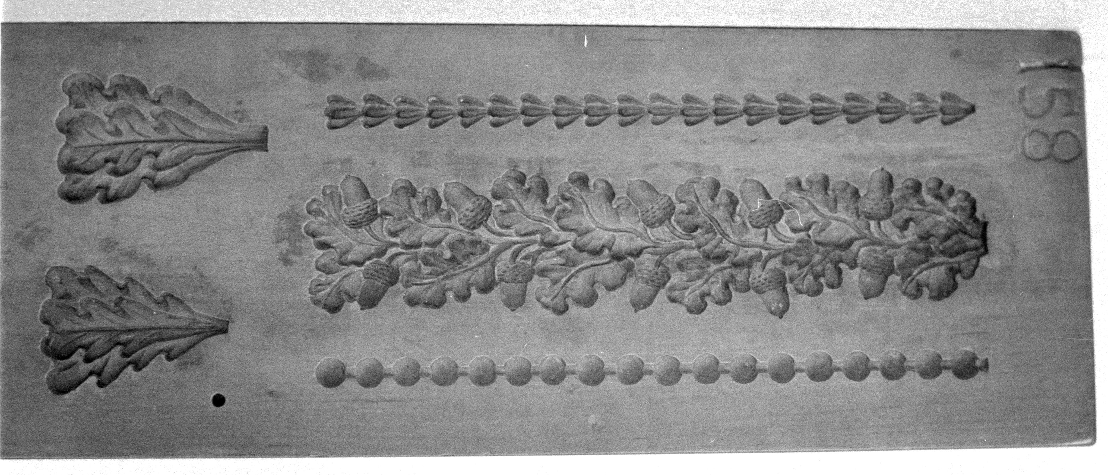 Eichenlaub-Stab mit Eicheln zwischen schmalen Blattstab und Perlstab. Unten 2 Eichenblattbüschel.