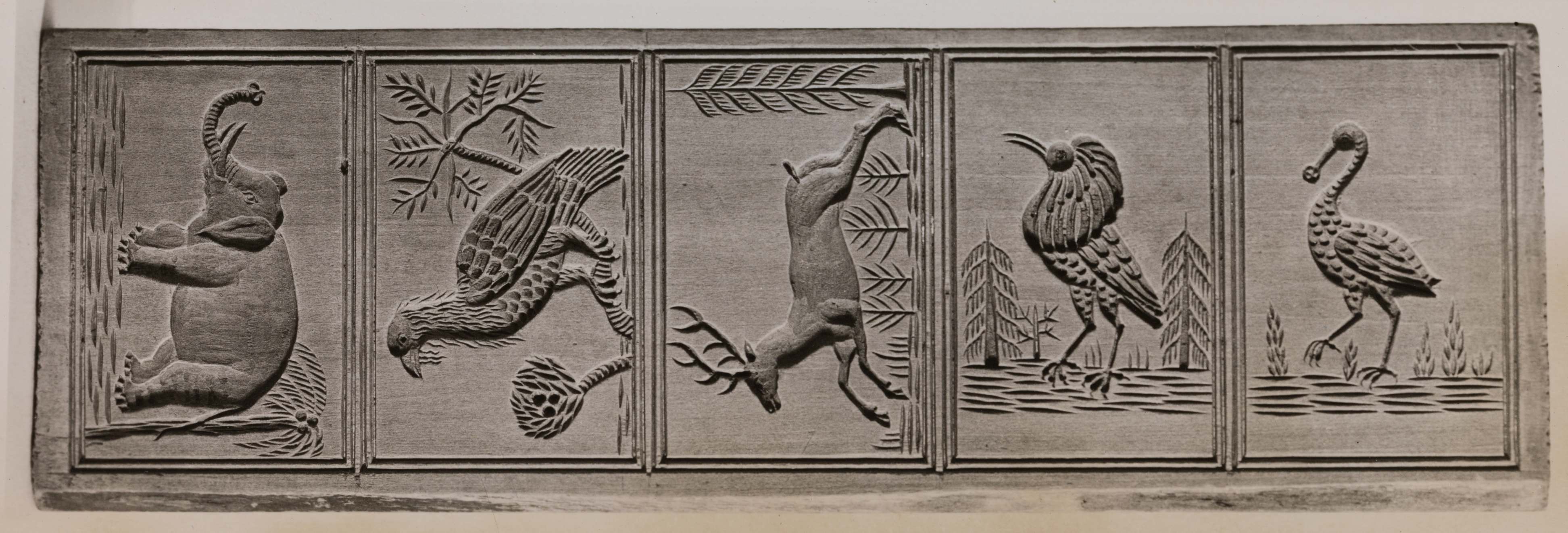 3 teiliger Holzmodel aus Birnbaum mit 3 rechtwinklig umrandeten Bildfeldern.