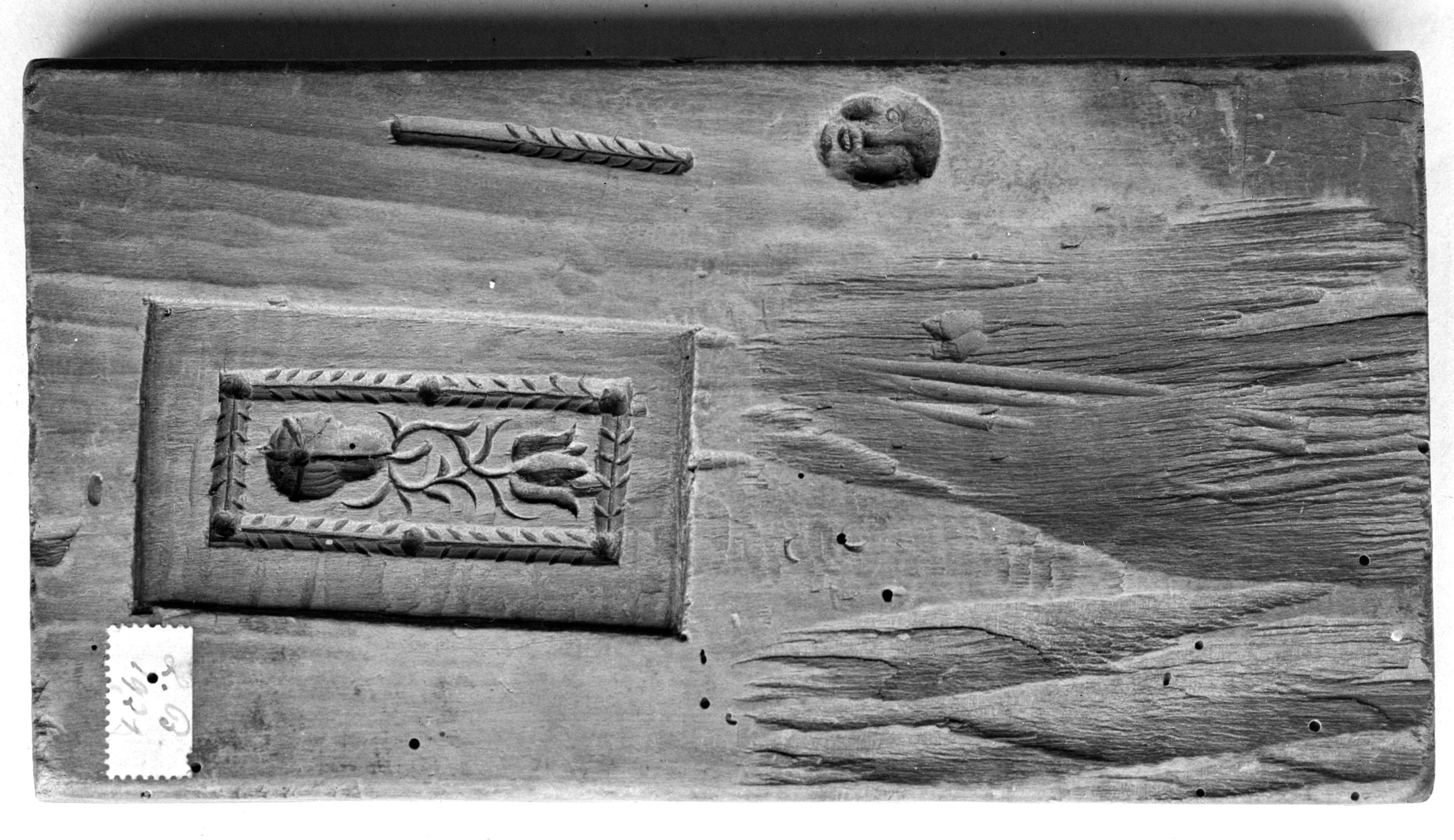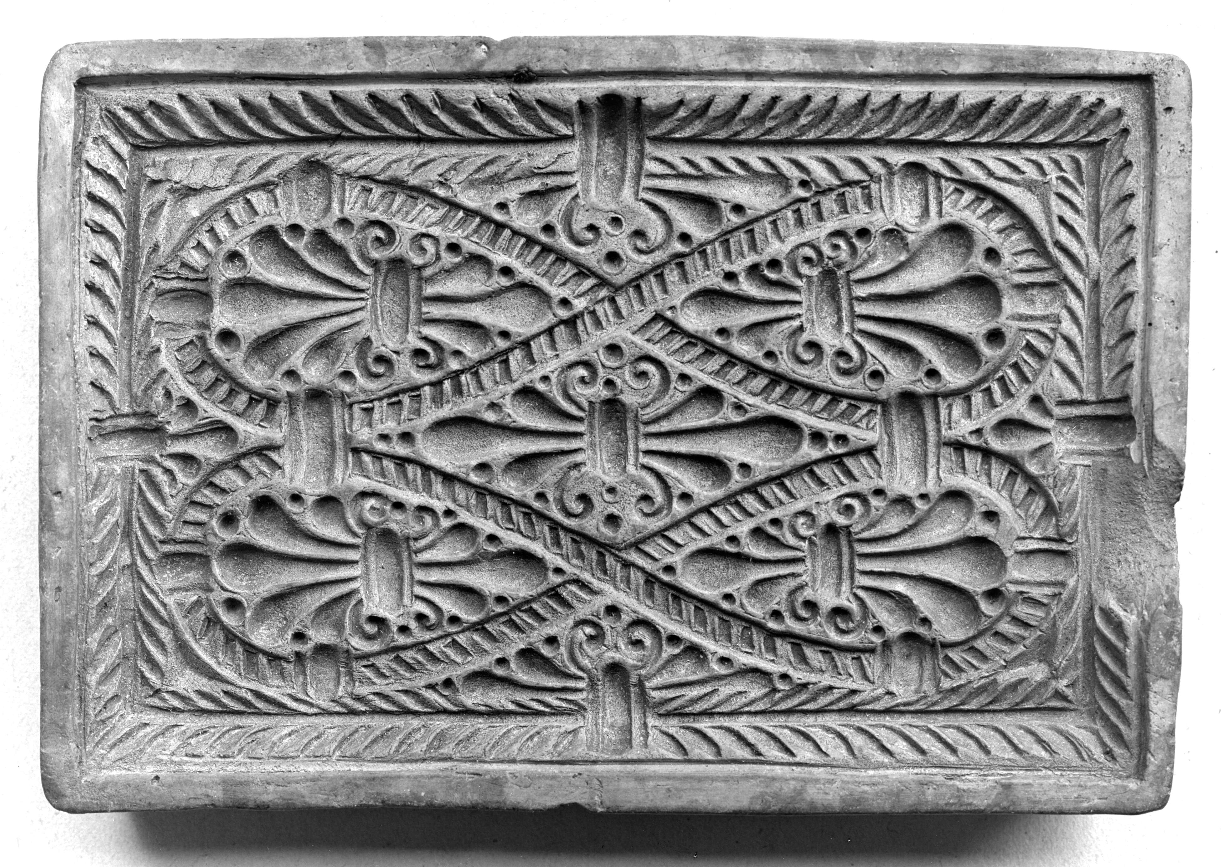 SGV_07N_00334Schlingmuster mit zusammengekoppelter doppelter 8form in rechteckiger Einfassung mit einem 2 teiligen gevierteten Lorbeerkranz.