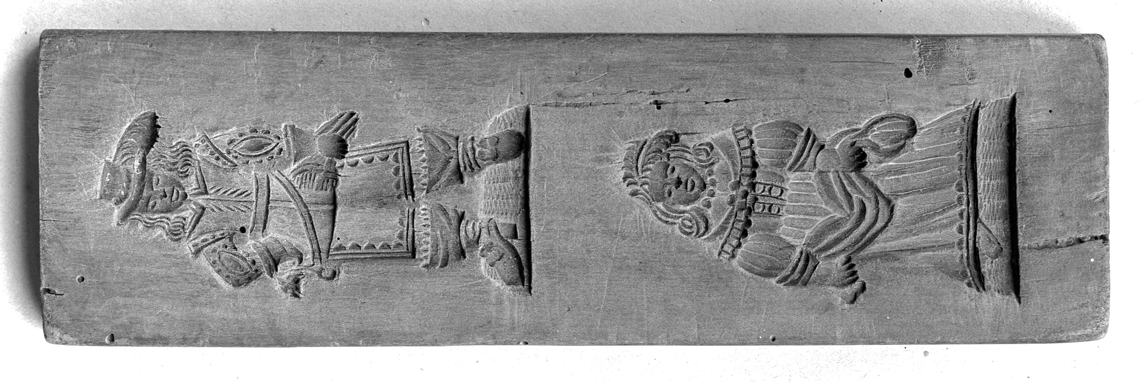 SGV_07N_00329Junger Edelmann mit Federhut, Stulpenhandschuhen u. Stulpenstiefeln in der Tracht des 30 jährigen Krieges, stehend von vorn. Dame mit Federkopfputz, Spitzenkragen u. gerafftem Kleid von vorn. [recto]