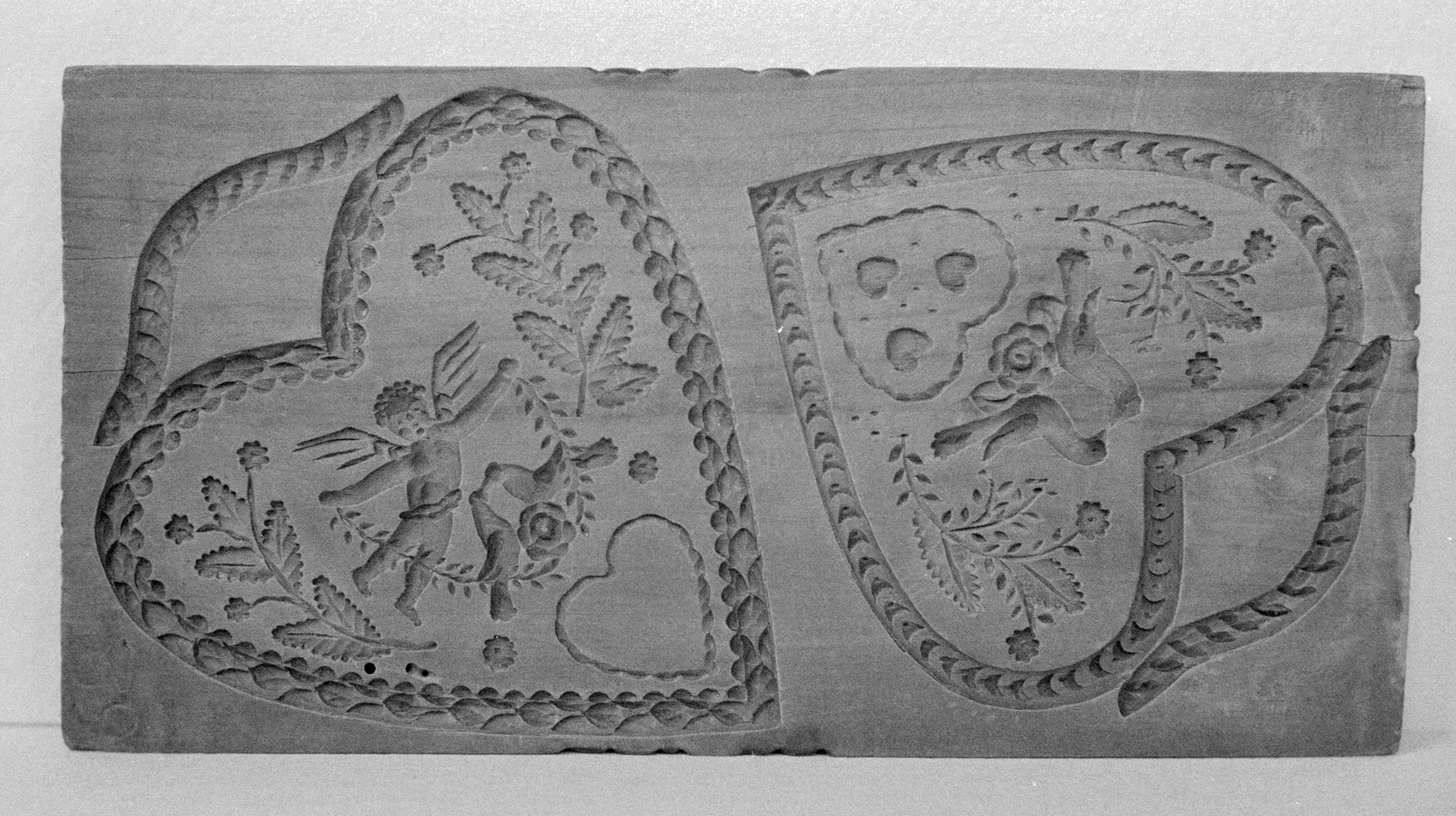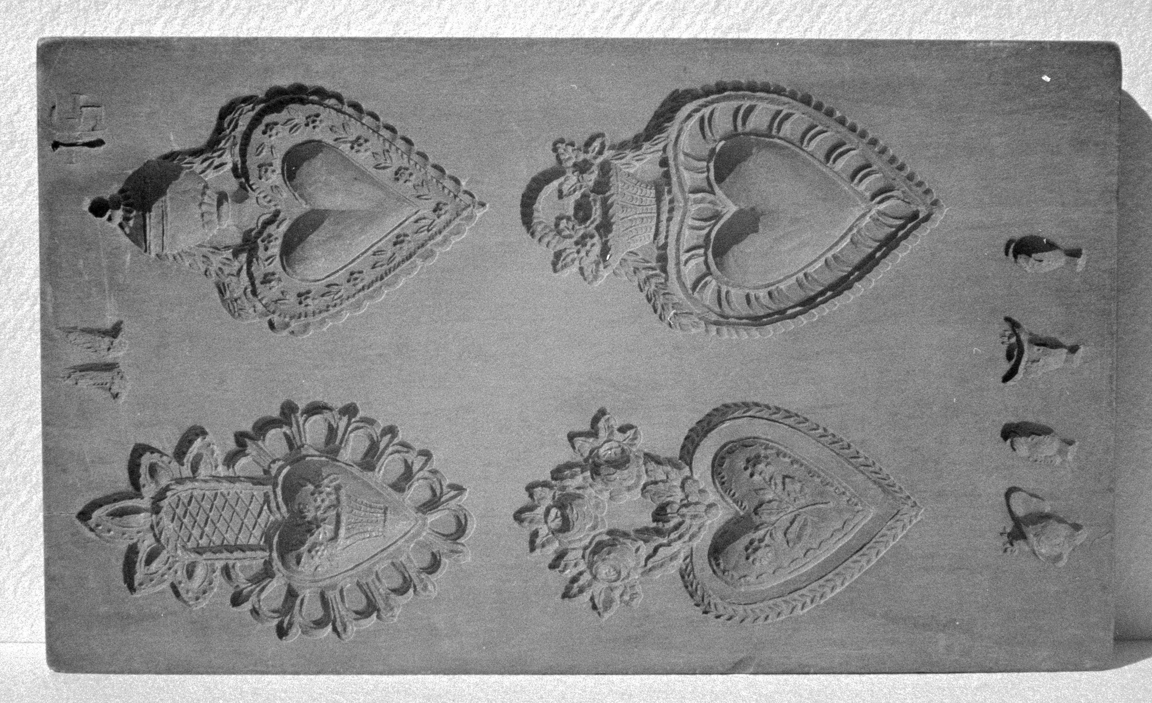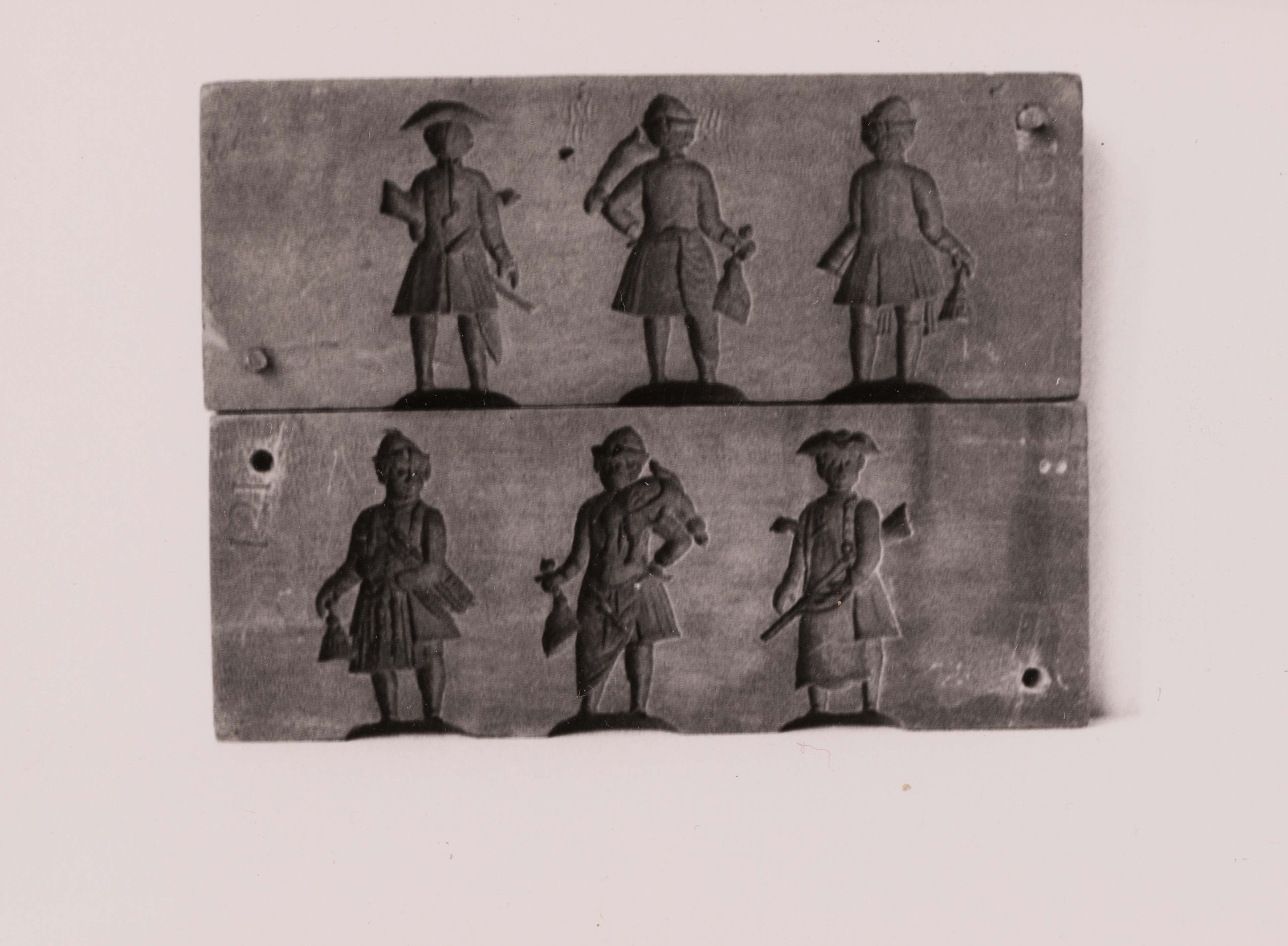 SGV_07P_03190Doppelmodel aus Birnbaum. Tiefgeschnitten, vermutlich f. Marzipan Vollformen. 1.) Besenbinder/Metzger und Gärtner. 2.) Die entsprechenden Rückansichten. Auf beiden Bildseiten die Zahl 121 eingedrückt