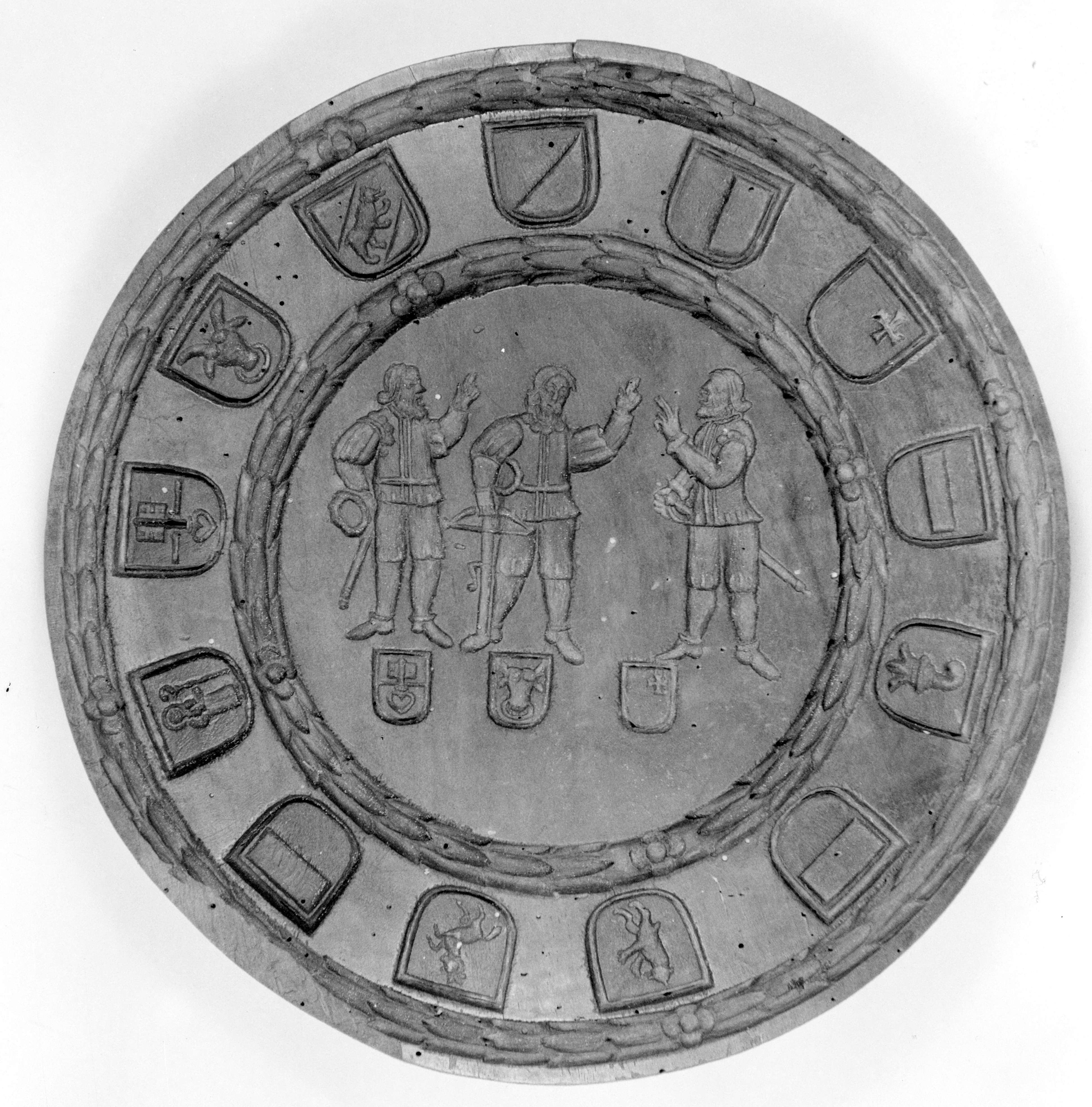 Rütlischwur im Rund, mit den Wappenschilden der 13 örtigen Eidgenossenschaft