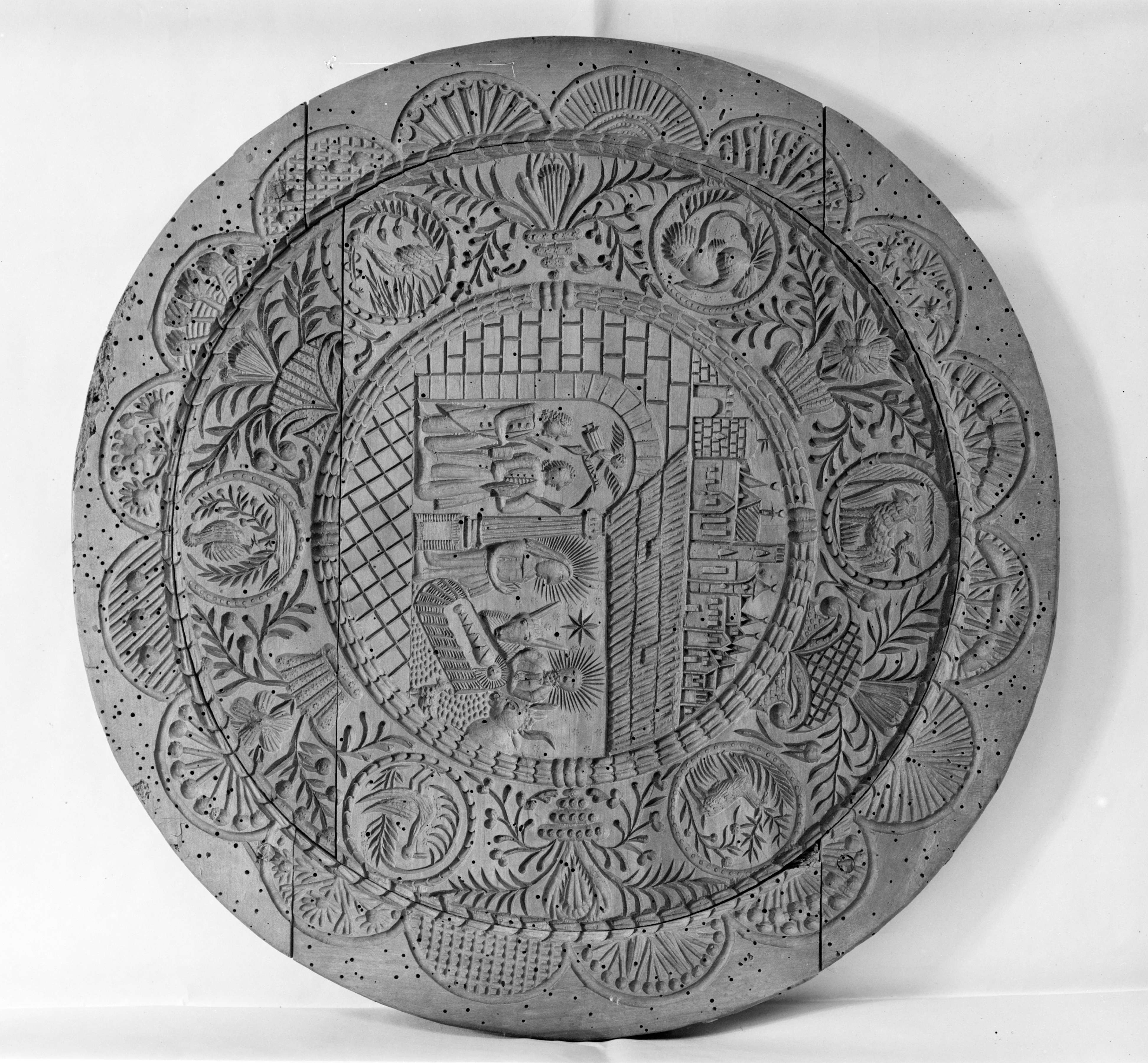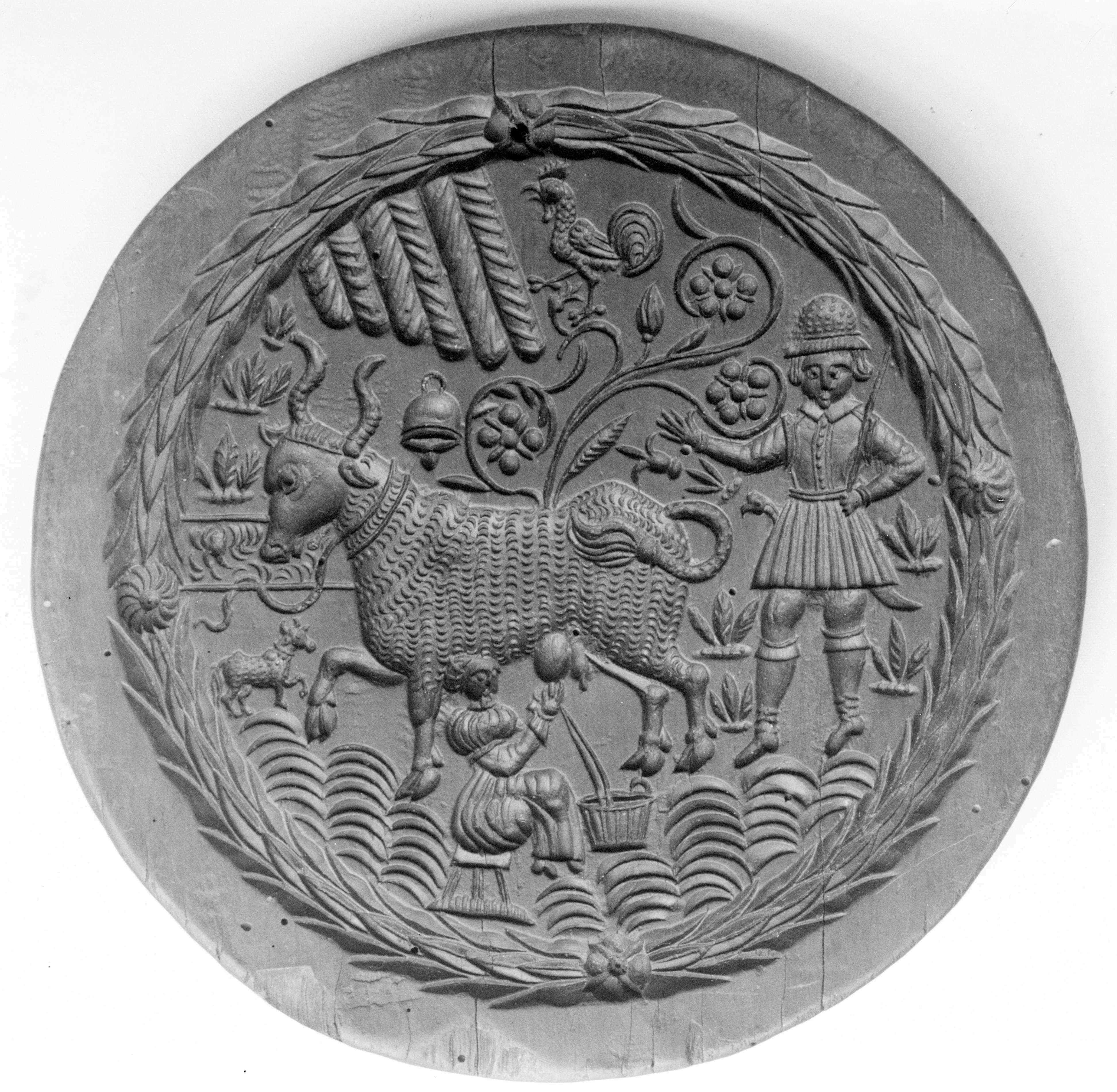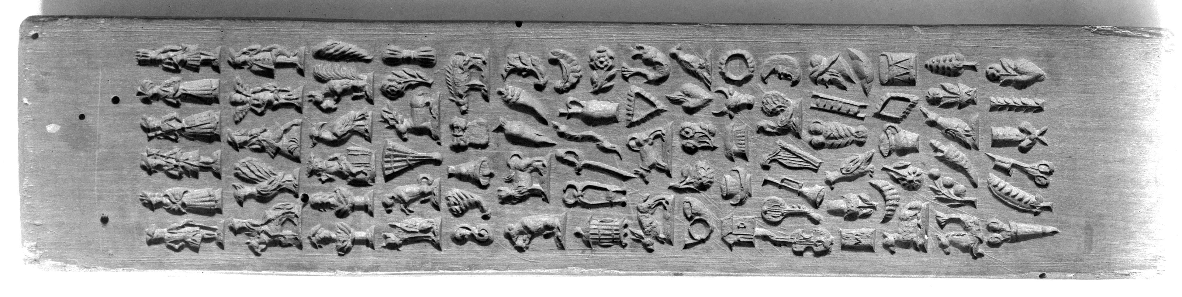 Holzmodel mit vielen Figürchen, Tieren, Früchten, Blumen, Musikinstrumenten, Waffen, Werkzeugen, Gegenständen für Tragant.