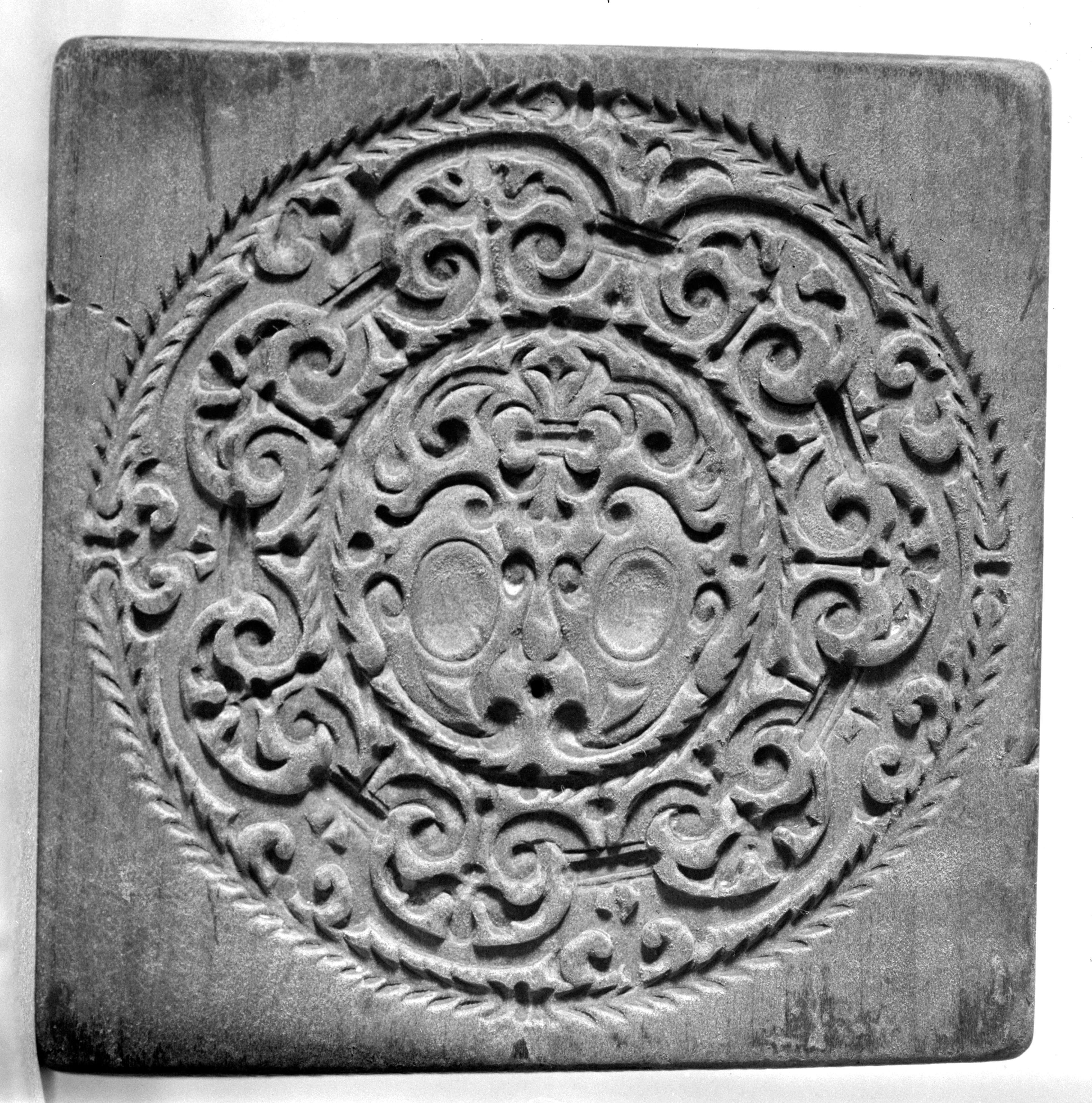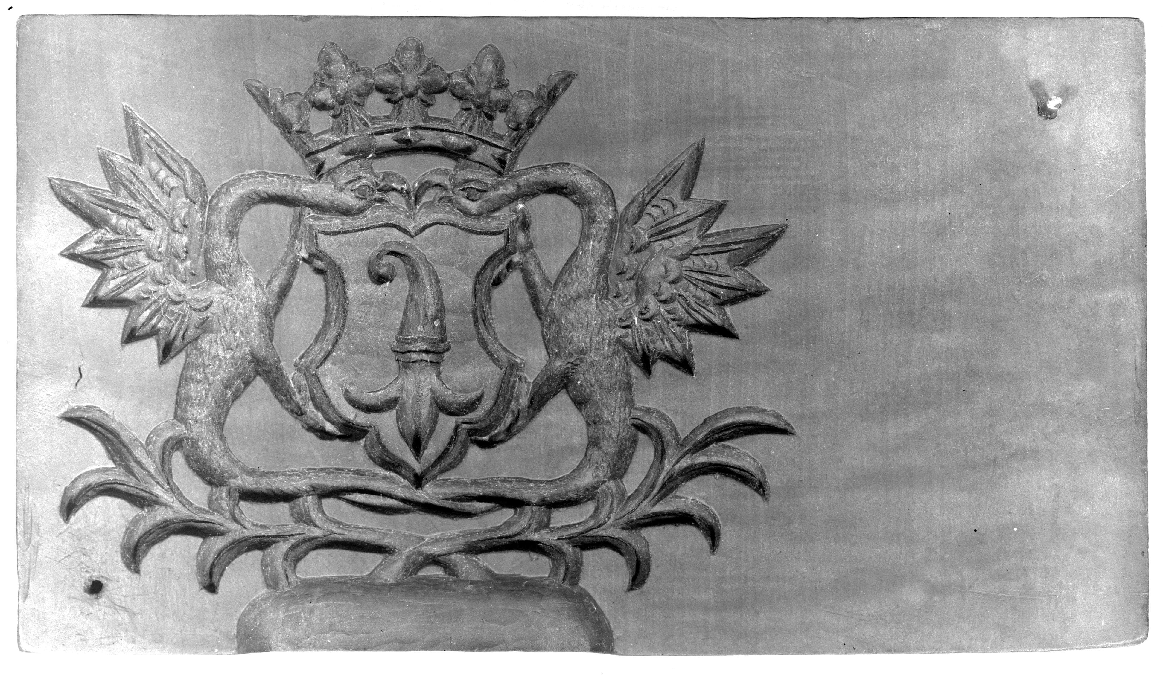 Rundornament mit 2 leeren Wappenschilder, gerahmt durch Spiralmotive.