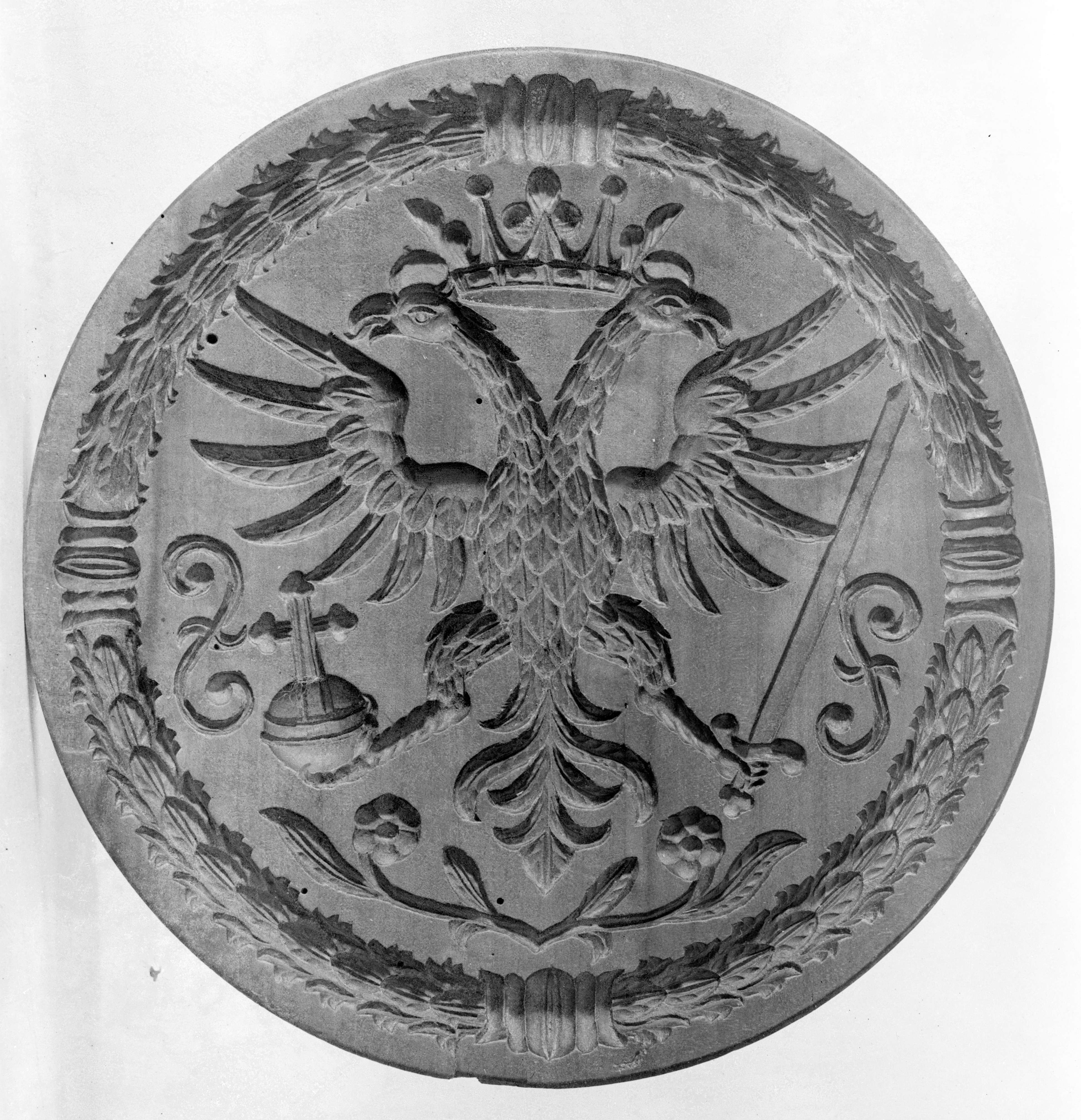 Oesterreichischer Doppeladler mit Krone, in der rechten Klaue den Reichsapfel, in der linken das Schwert haltend. [verso]