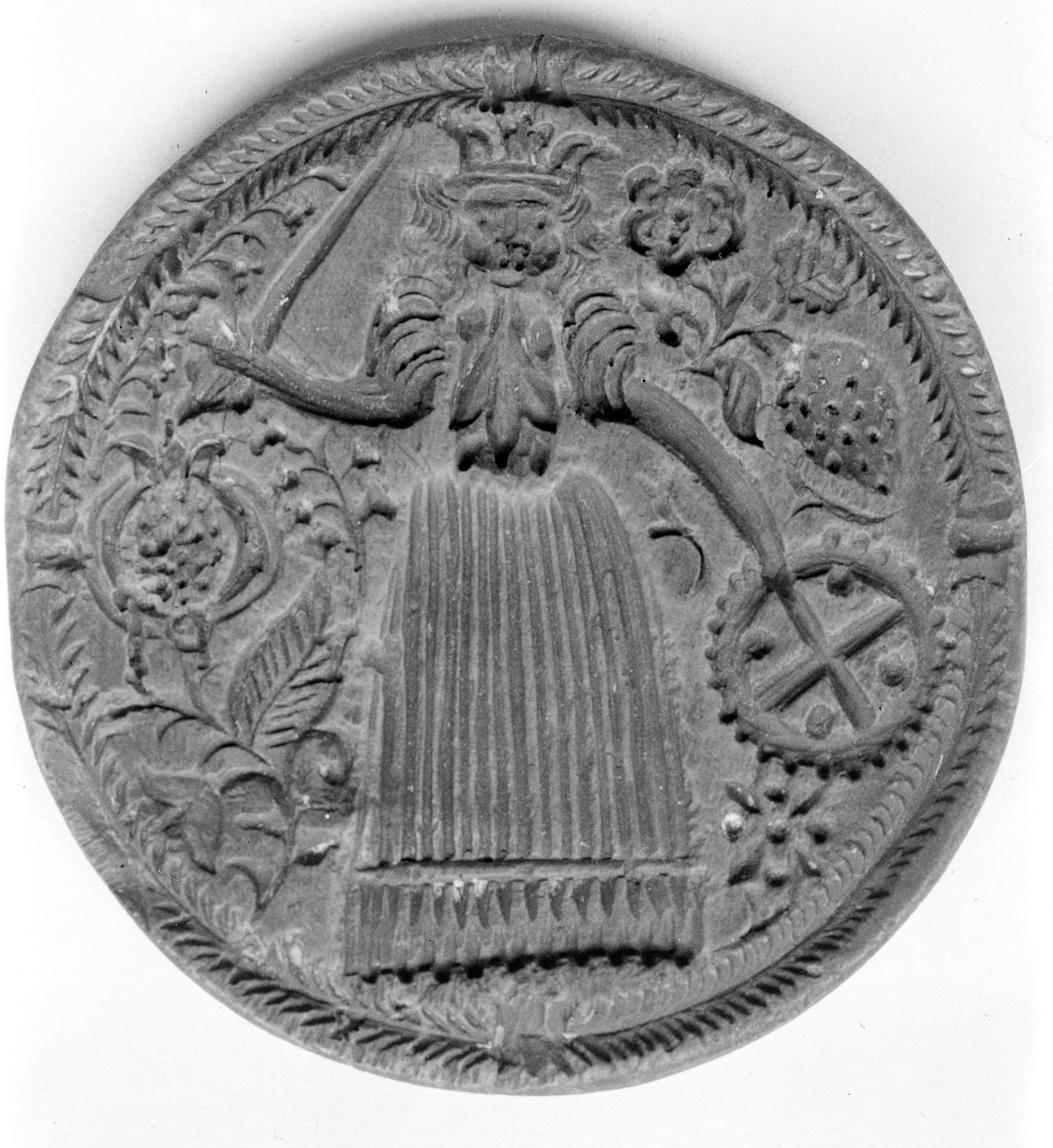 Hl. Katharina von Alexandrien mit Krone, Rad und Schwert, stehend von vorn.