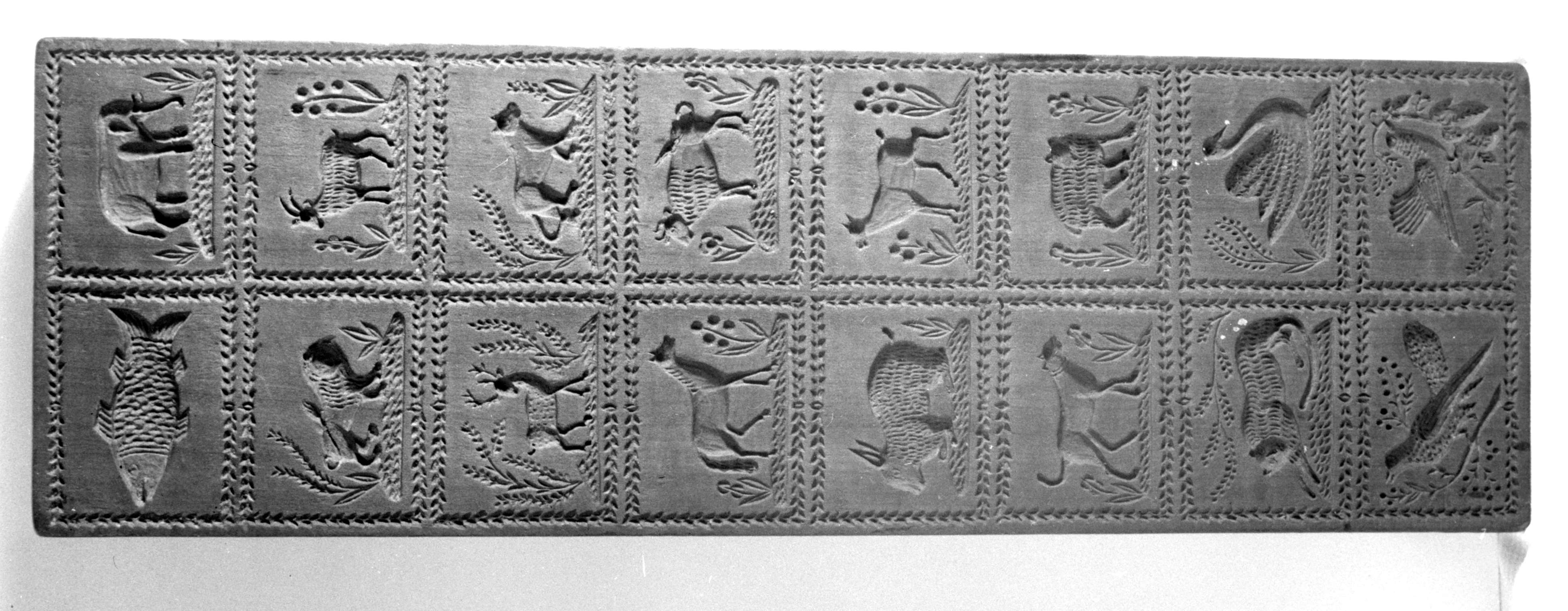 16 Tiere in rechtwinklig umrandeten Feldern mit 2 teiligen Lorbeerrahmen. [recto]