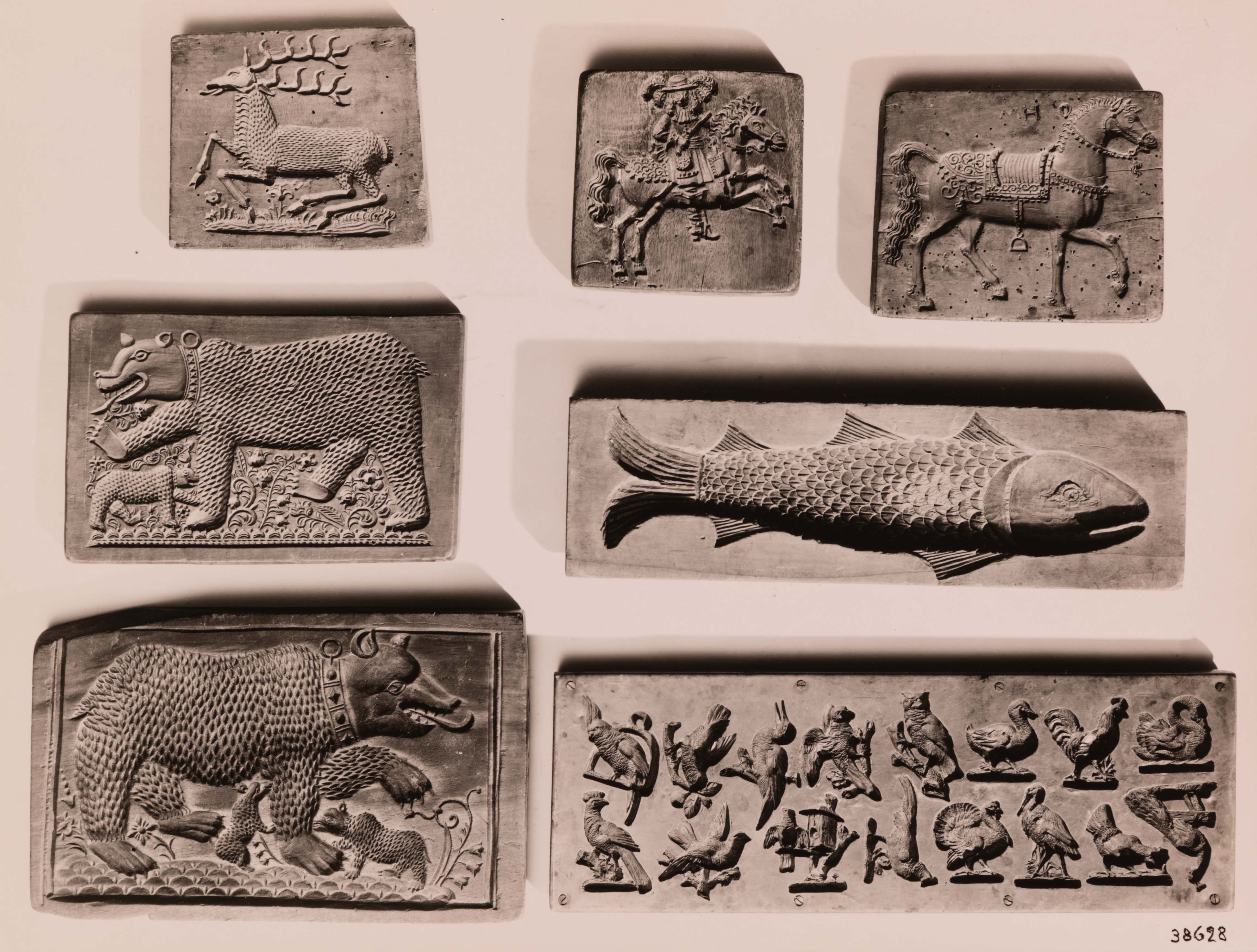 SGV_07P_03680Hirsch, ruhend. Nr. 92. Reiter zu Pferd. Nr. 95. Gesatteltes Pferd nach rechts. Nr. 93. Bär mit 1 Jungen nach links. Nr. 82. Fisch nach rechts. Nr. 40. Bär mit 2 Jungen nach rechts. Nr. 83. 16 Vögel. Nr. 47.