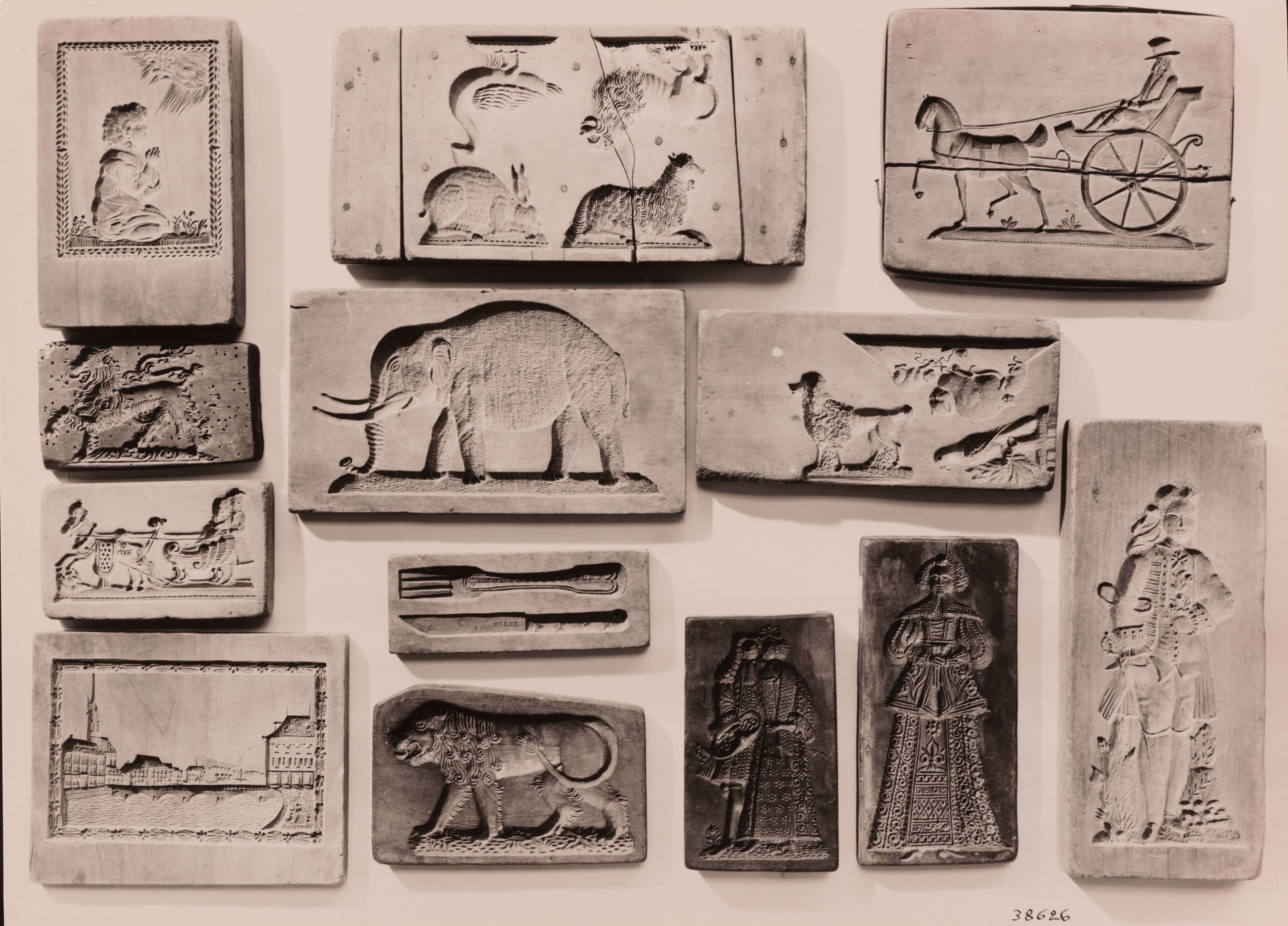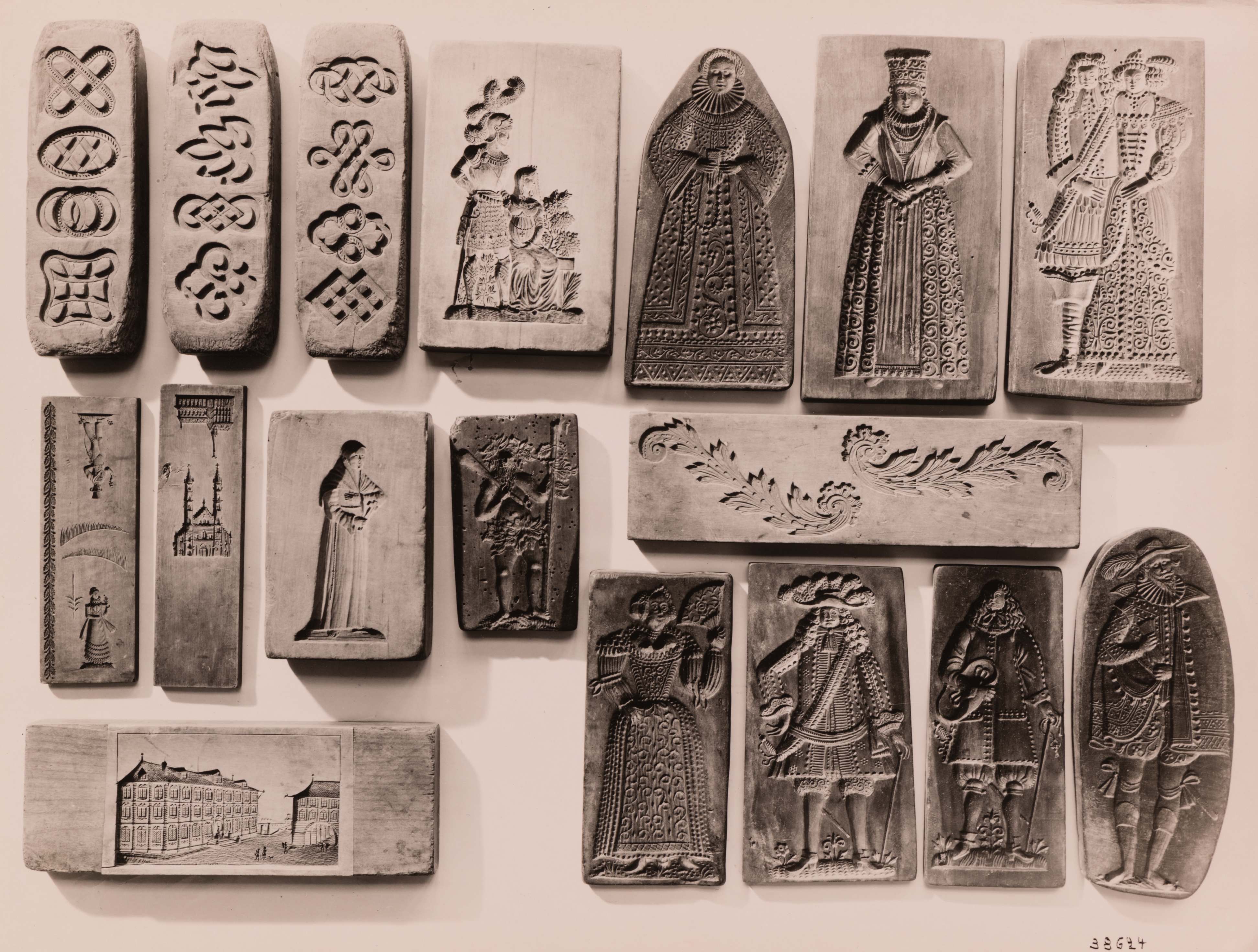SGV_07P_0367112 Embleme. Nr. 60. 6 teiliger Holzmodel. Nr. 3. 6-teiliger Holzmodel. Nr. 2 Doppelseitiger Holzmodel mit je 9 Figuren. Nr. 8. Milchmädchen, Senn, Bauernmädchen u. Bauer. Nr. 5. Dame in der Tracht Marie Antoinettes. Nr. 10. Reiter u. Reiterin zu Pferd, be