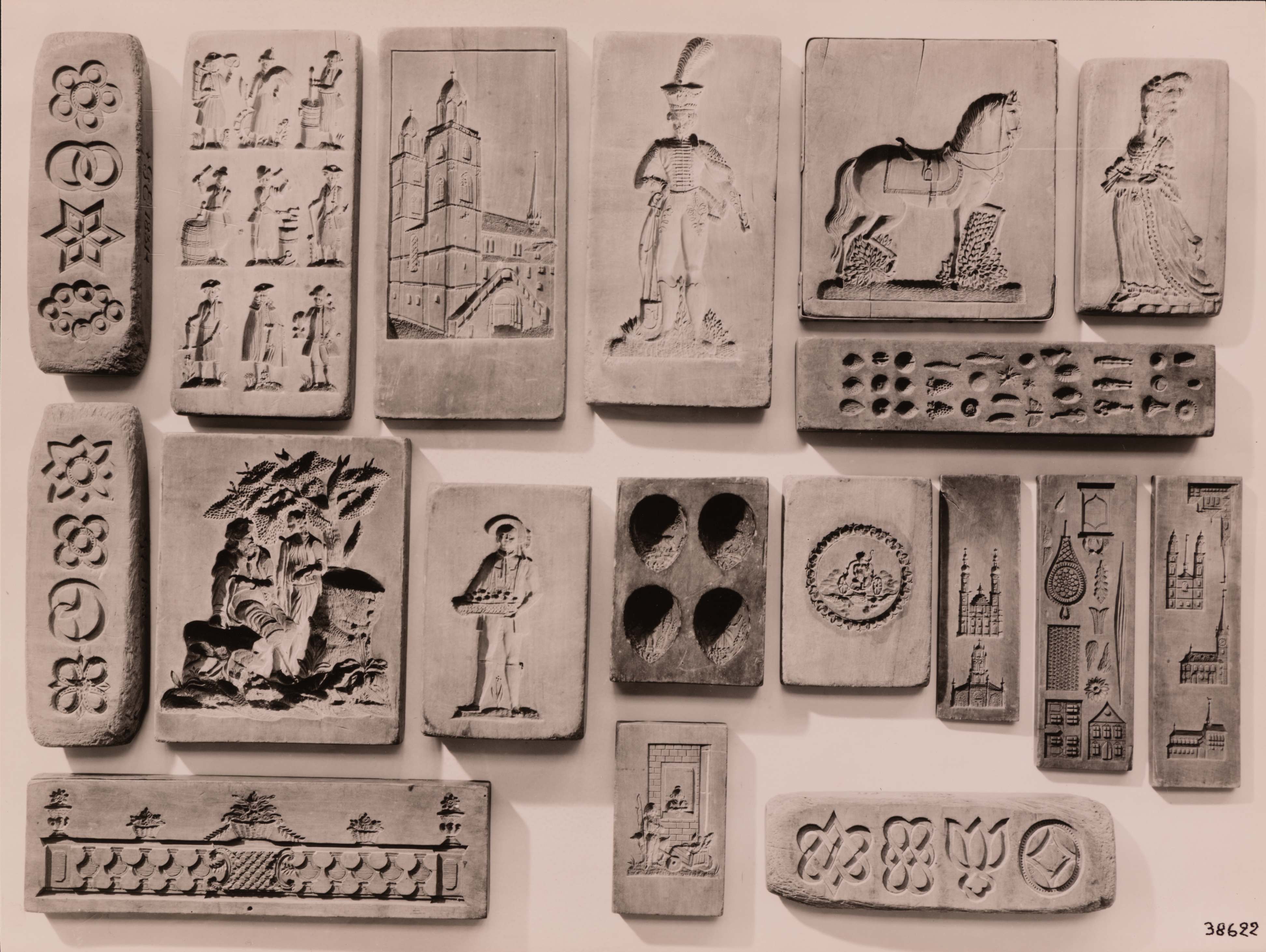 SGV_07P_03672Doppelseitiger Holzmodel mit Ornamenten. Bez: G. E(bert) 1831. Nr. 52. Doppelseitiger Holzmodel mit je 9 Figuren. Nr. 8. Das Grossmünster in Zürich. Bez: F. Riecker, 1824. Nr. 28a. Kürassier. Nr. 9. Gesatteltes Pferd nach rechts. Nr. 37. Dame mit Fächer u