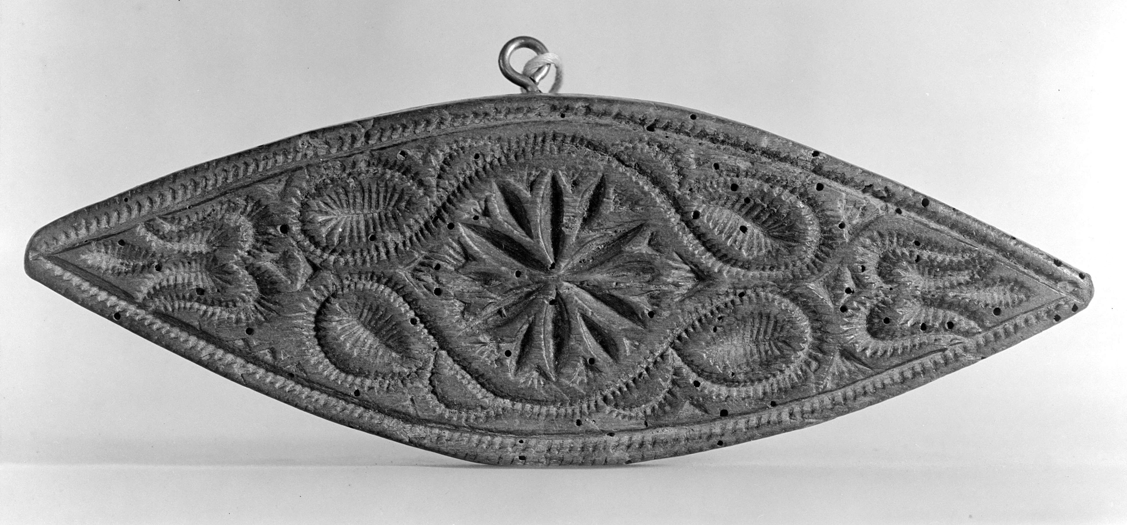 Buttermodel aus Birnbaum in ellipsoider Form mit Kerbschnitt und Griff.