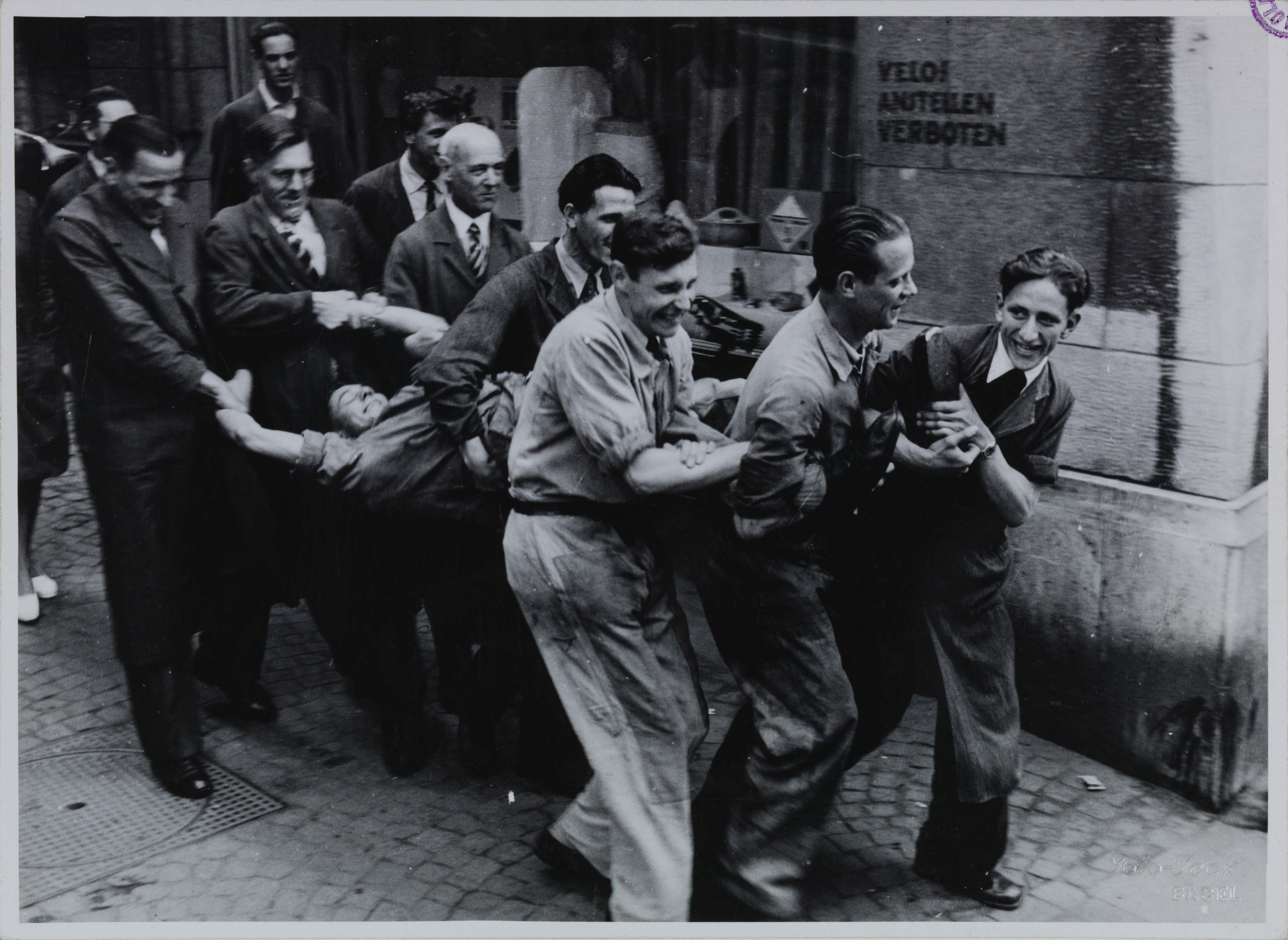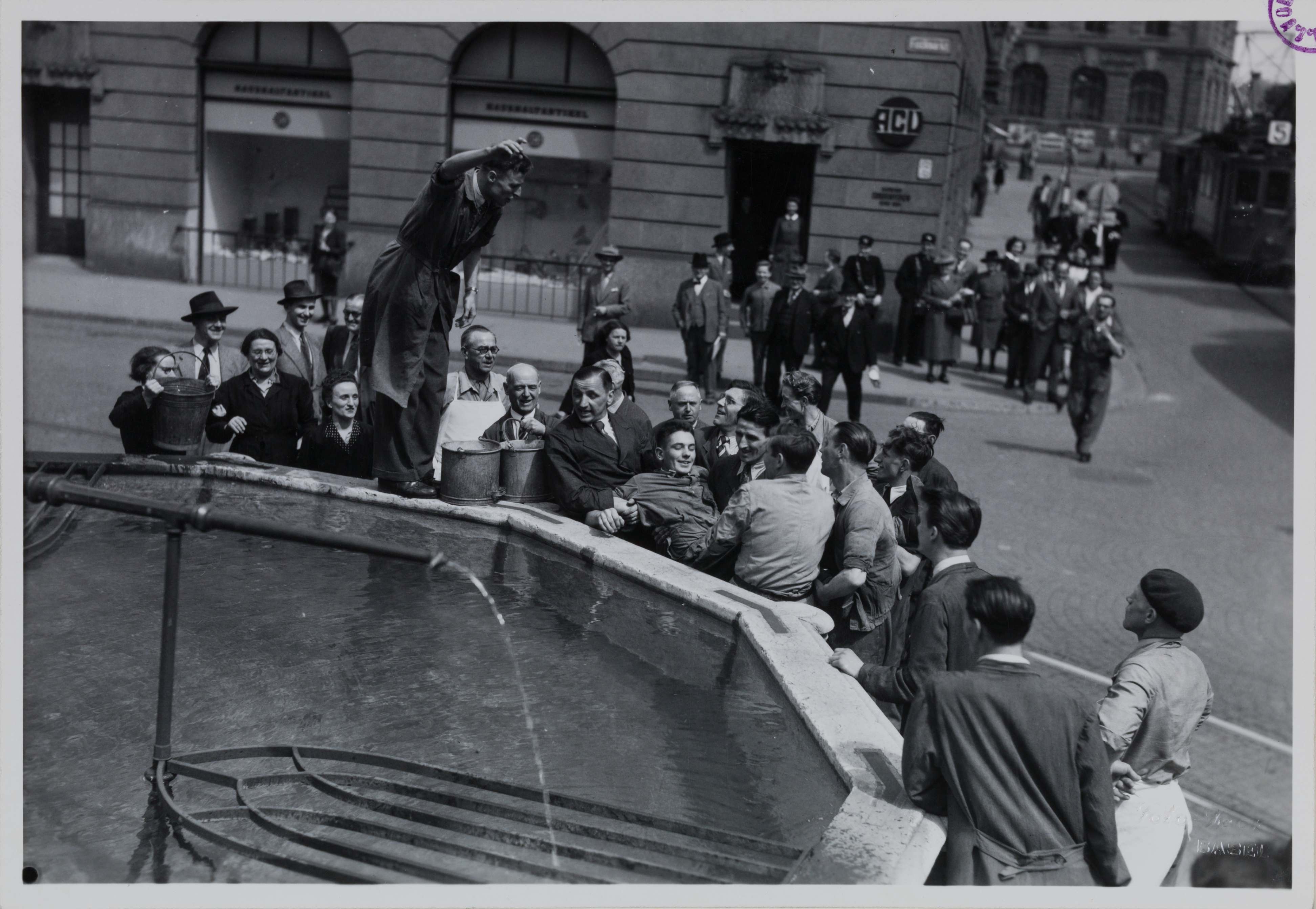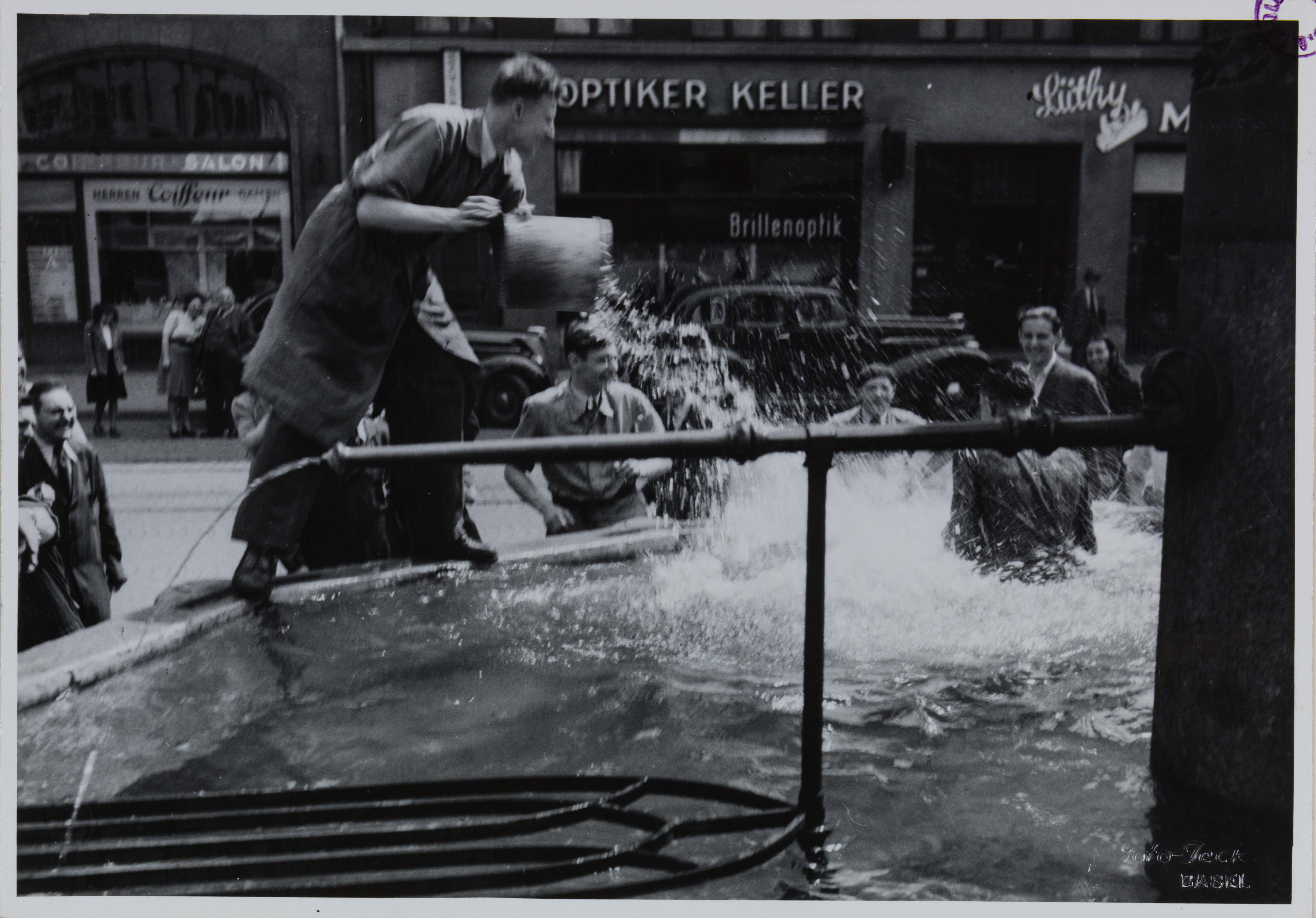 Gautschen, ein alter Brauch in neuem Gewande: Der Gäutschling wird in den Brunnen geworfen.