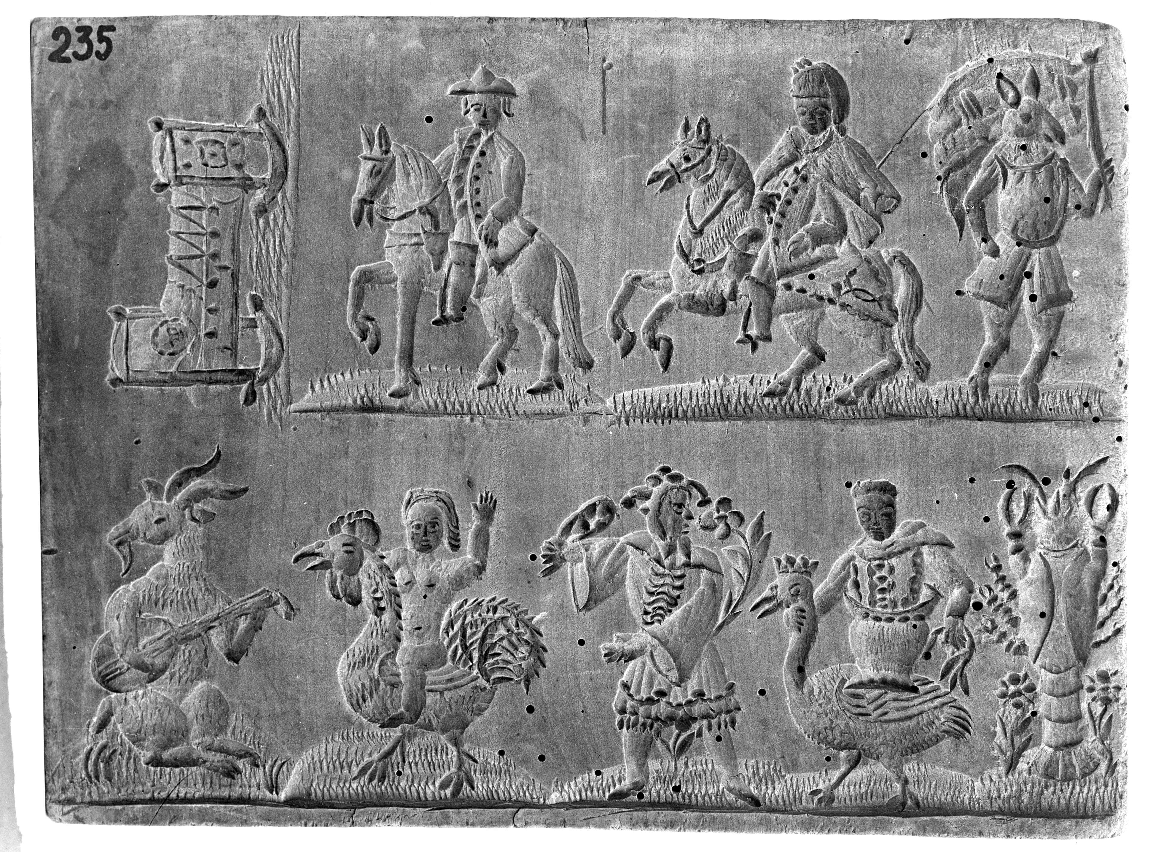 SGV_07P_02969Wiege mit Kind/Reiter zu Pferd/Hase mit Hasenpanier//Geissbock/ Hahnreiter/Narr/Gans u. Krebs