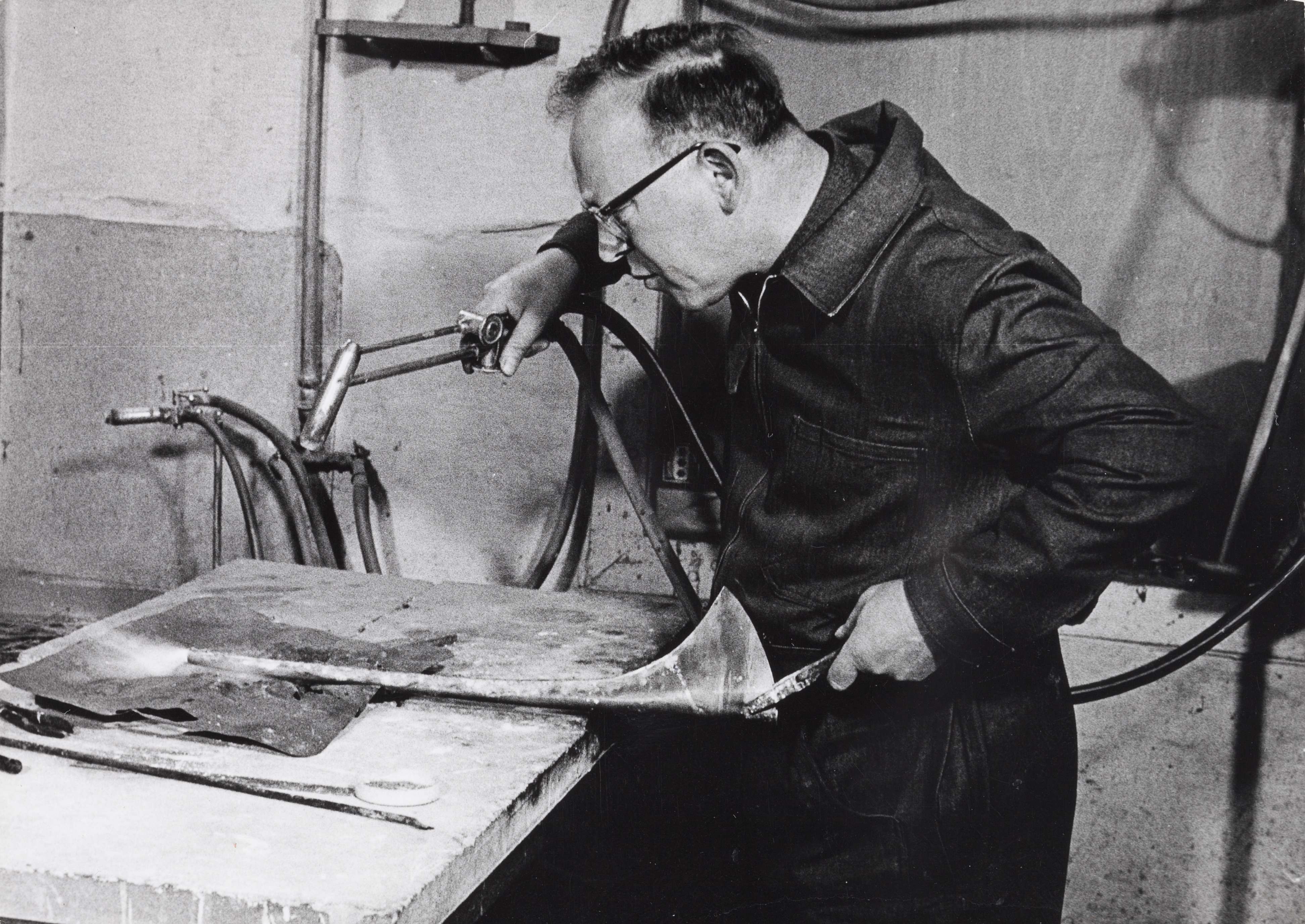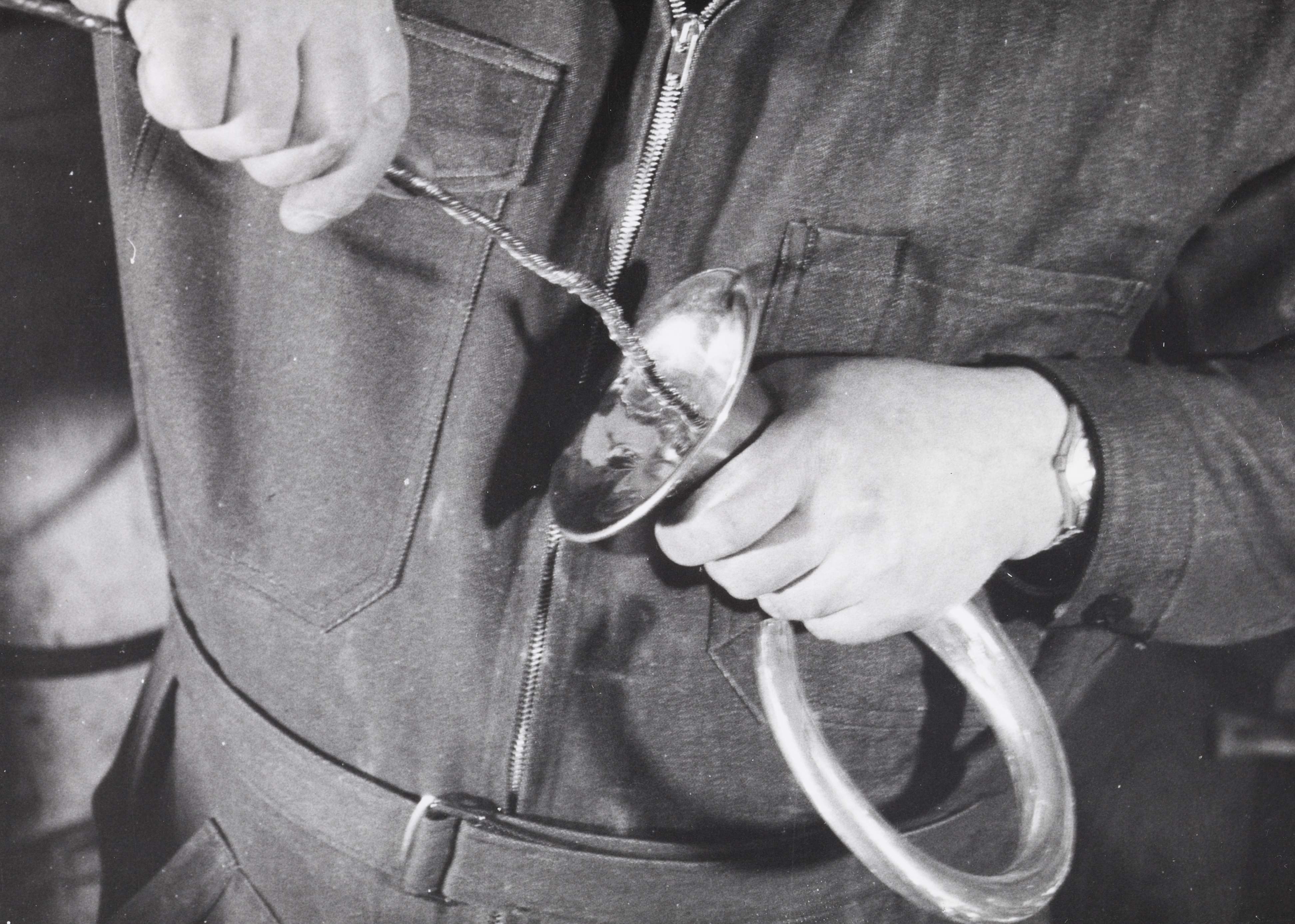 16. Das genietete Schallstück wird gelötet. Egger brennt das Messingschlaglot mit Leuchtgas nieder.