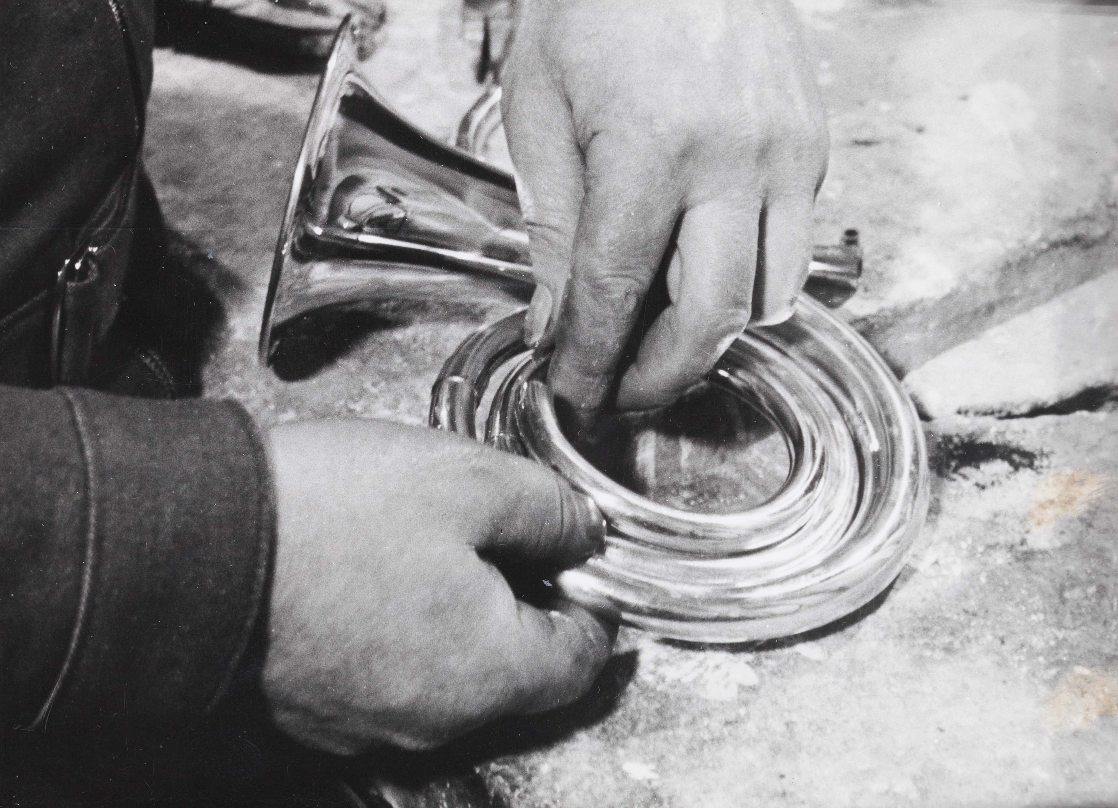 34. Das Mundstück verfertigt Egger selbst. - Schliesslich bläst Paul Spörri das Posthorn an und prüft es.