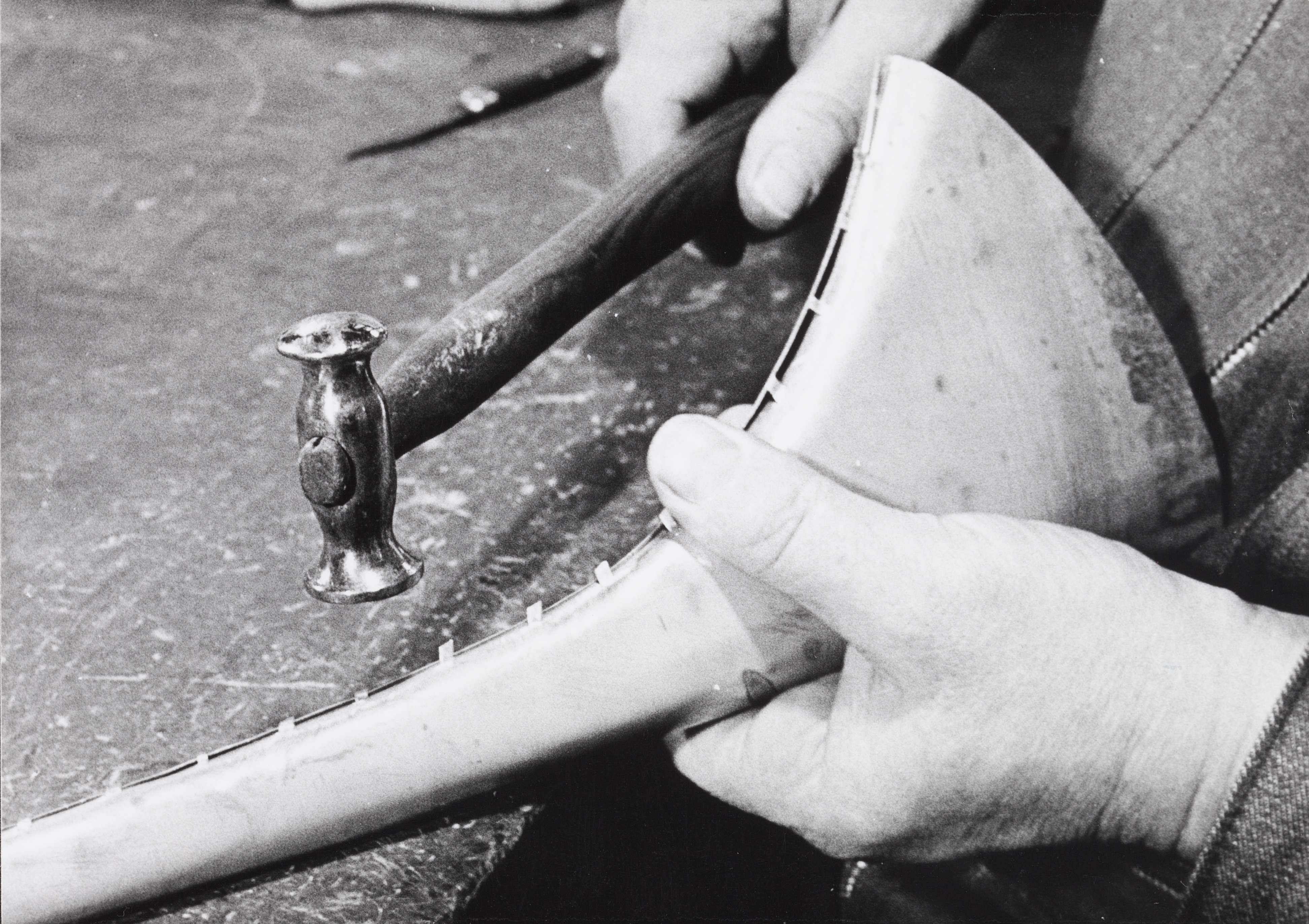9. Abbiegen des Schallstückes auf dem Hauptstückeisen, einer konischen Stange, bis beide Ränder einander berühren.